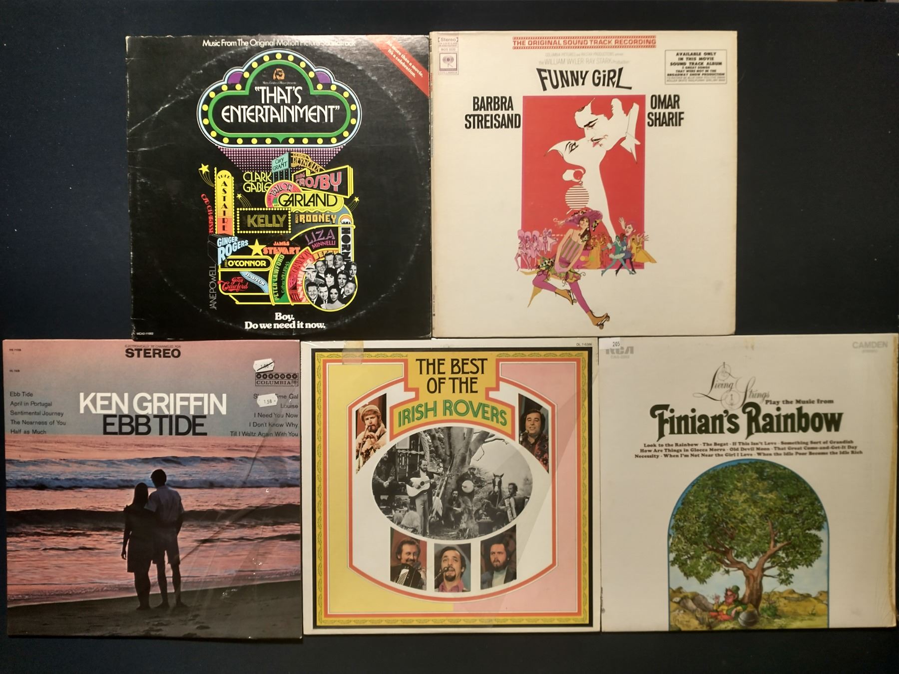 5 VINYL RECORD LOT – SOUNDTRACKS & TRADITIONAL / BARBRA STREISAND, IRISH ROVERS / 1950s–1970s
