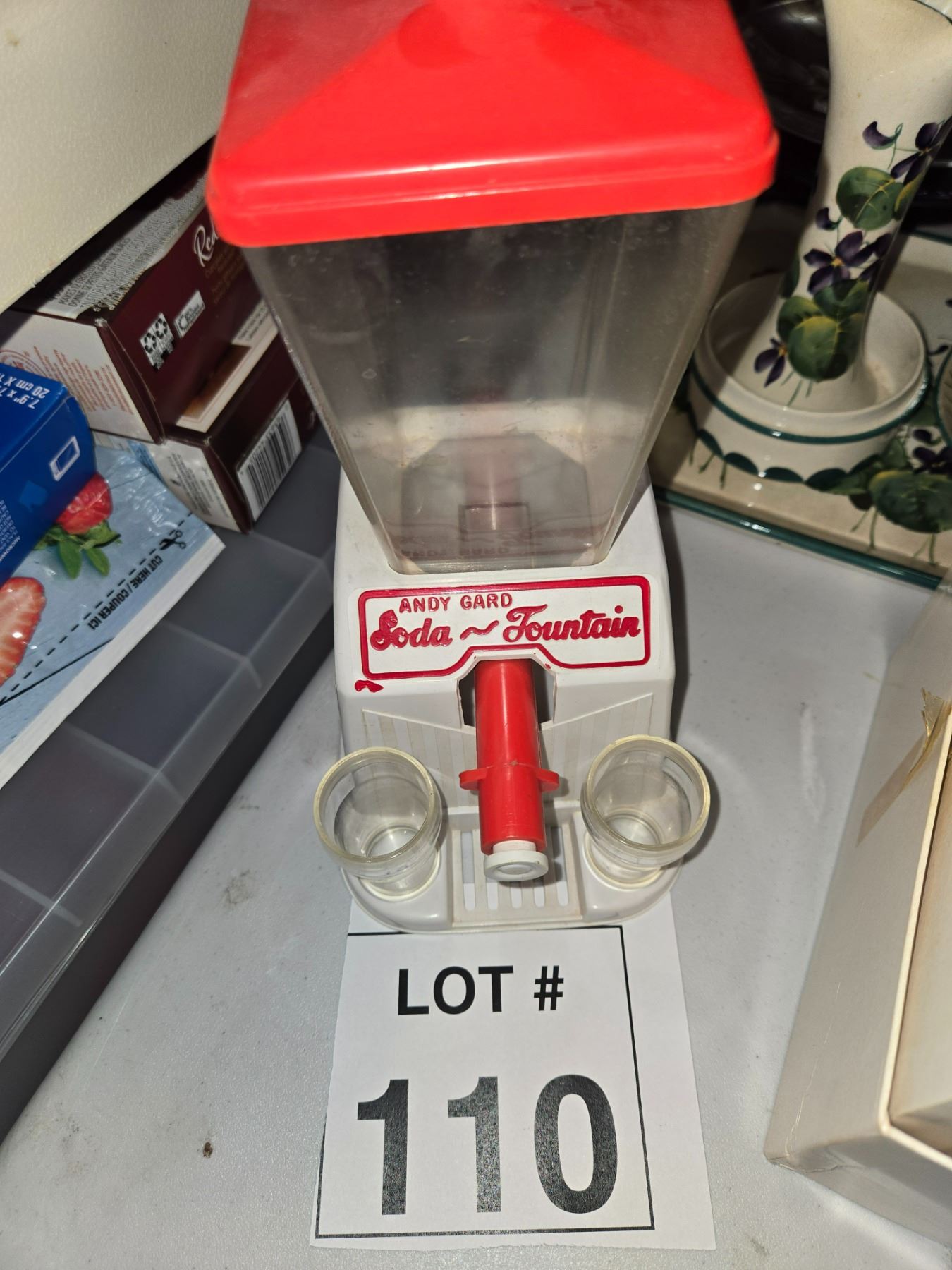 Andy Gard miniature soda fountain-style beverage dispenser toy with two small cups.