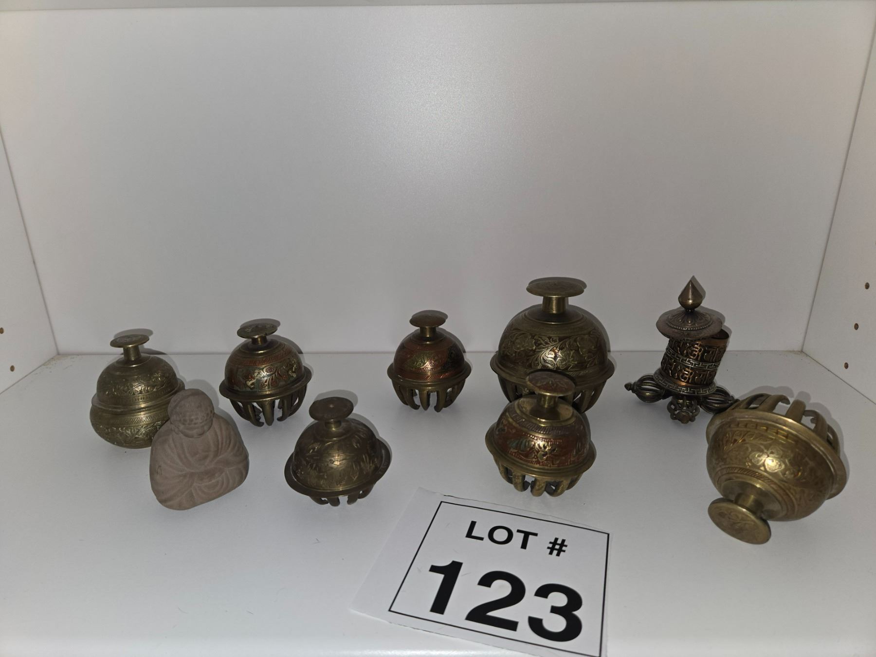 Assorted bronze and brass ritual objects including bell clusters and incense-related forms.