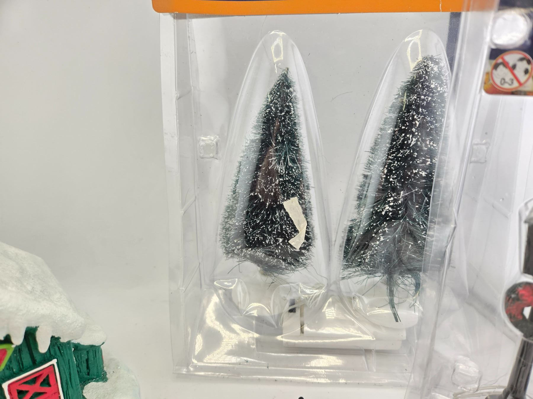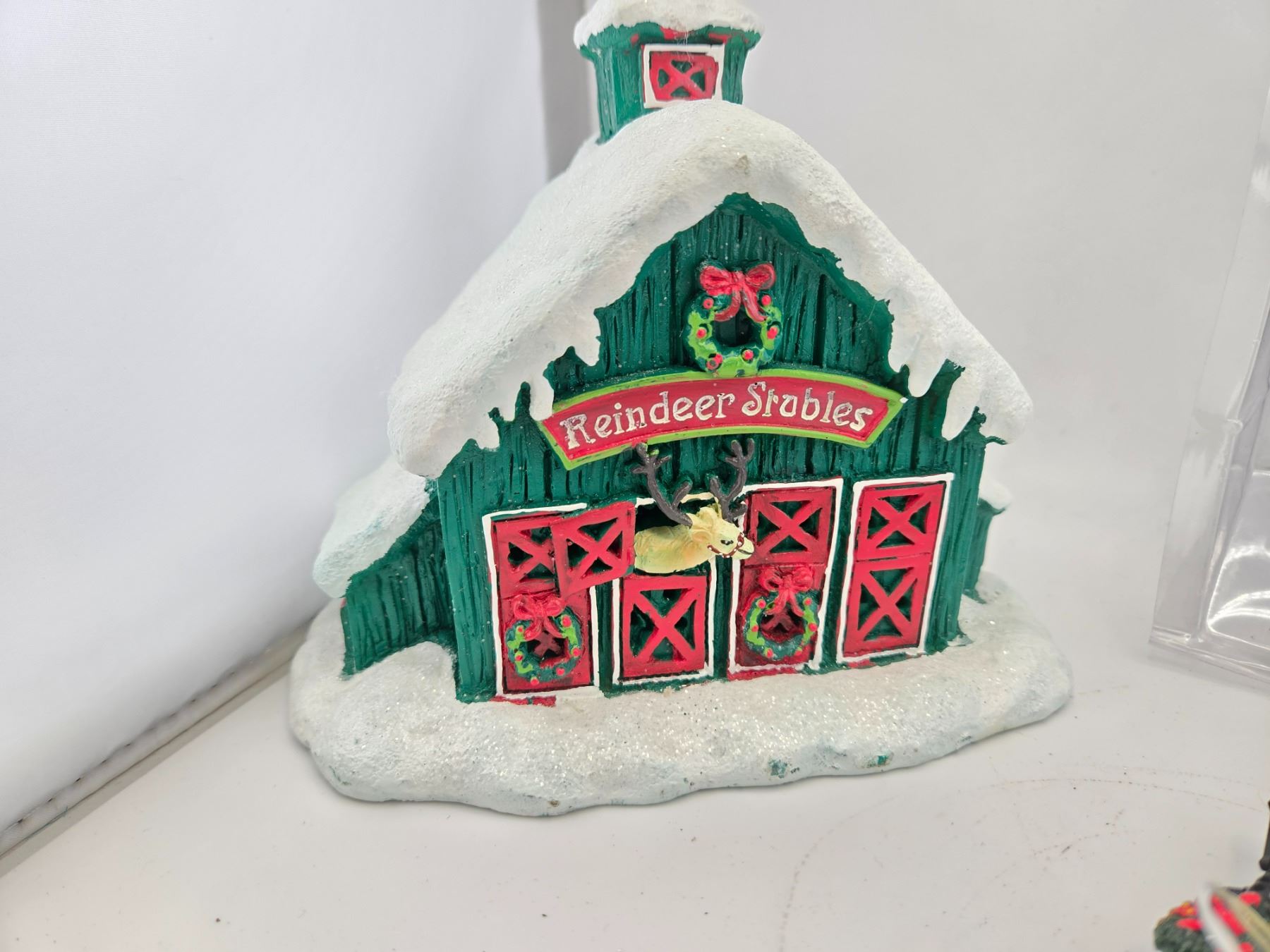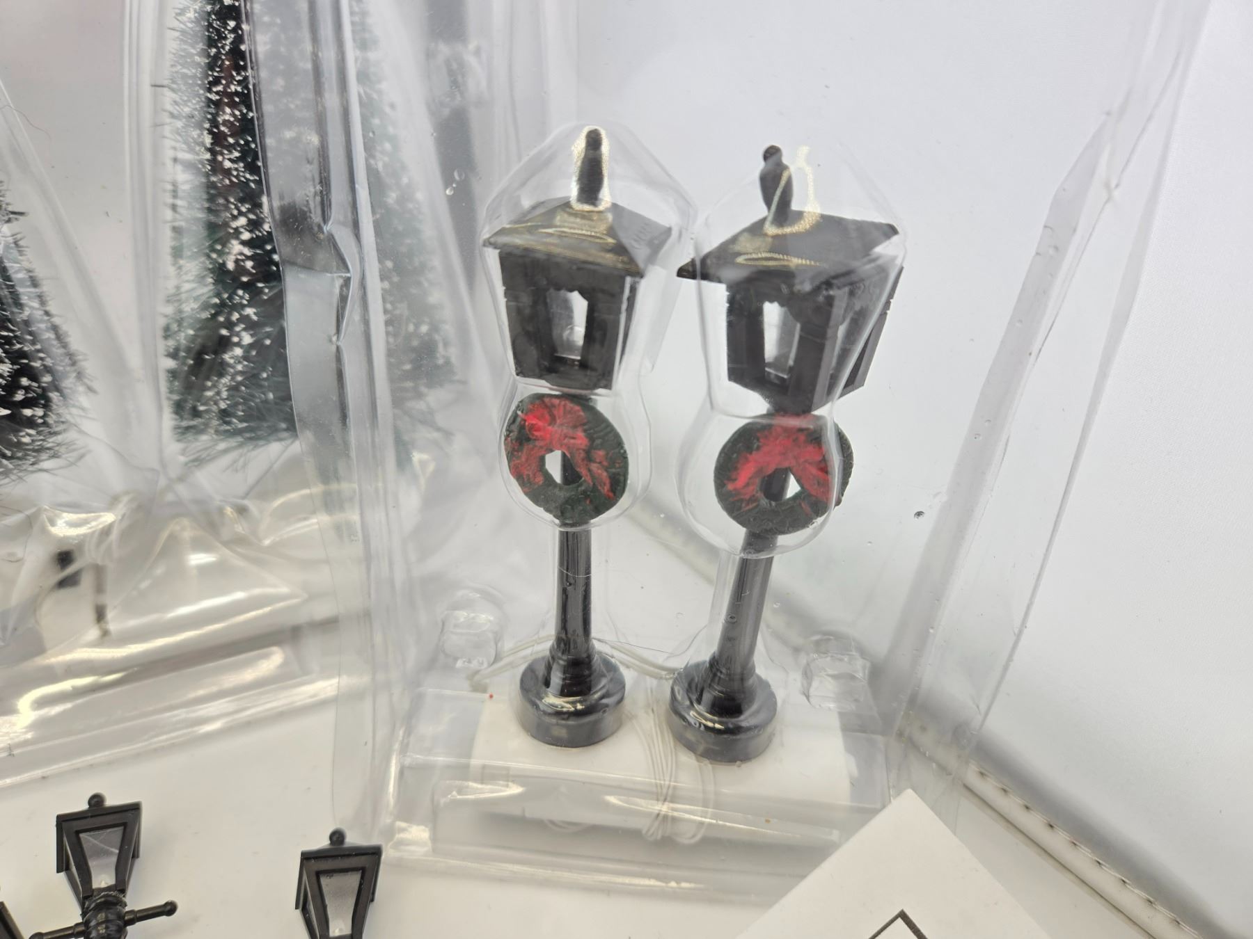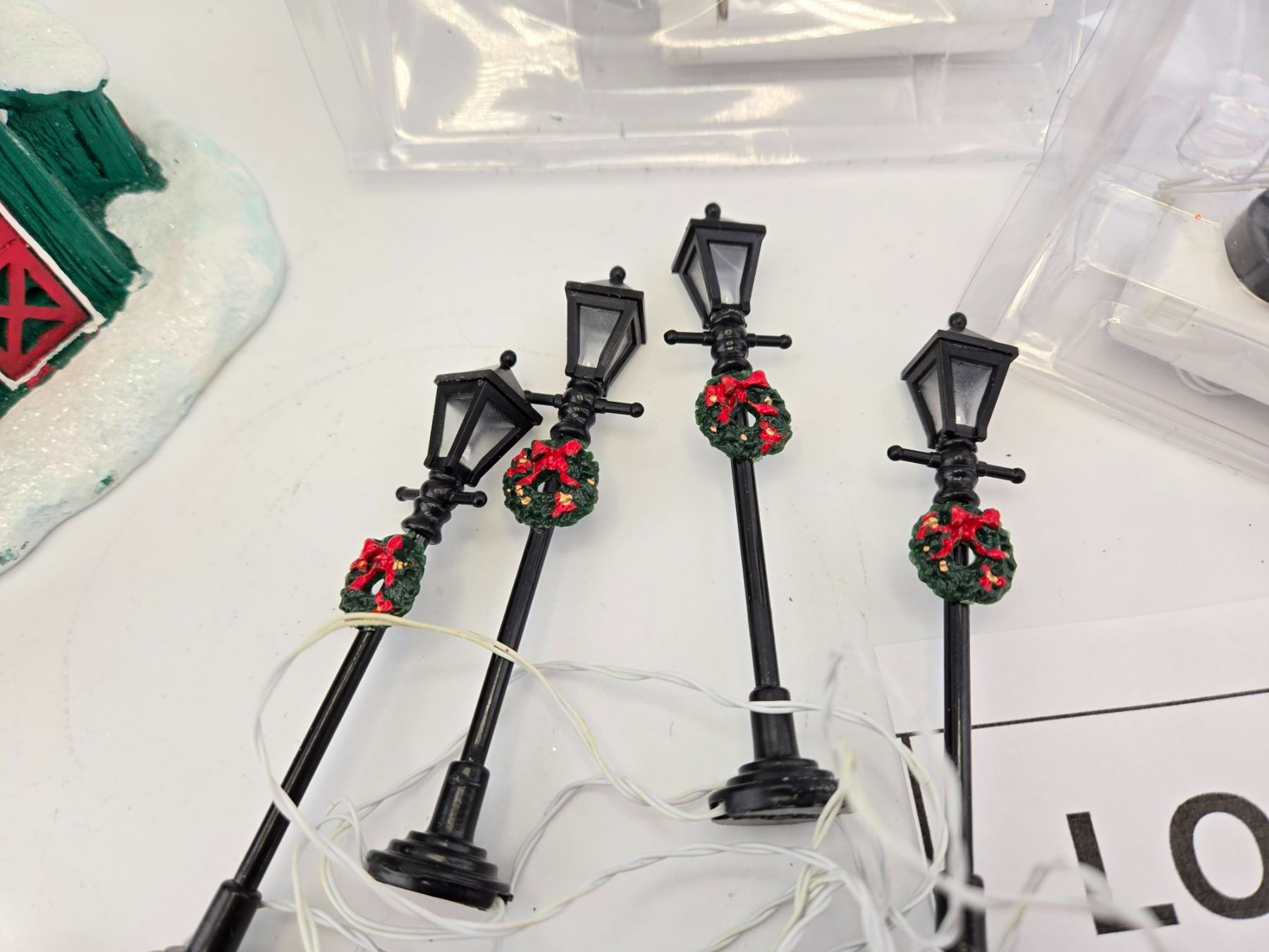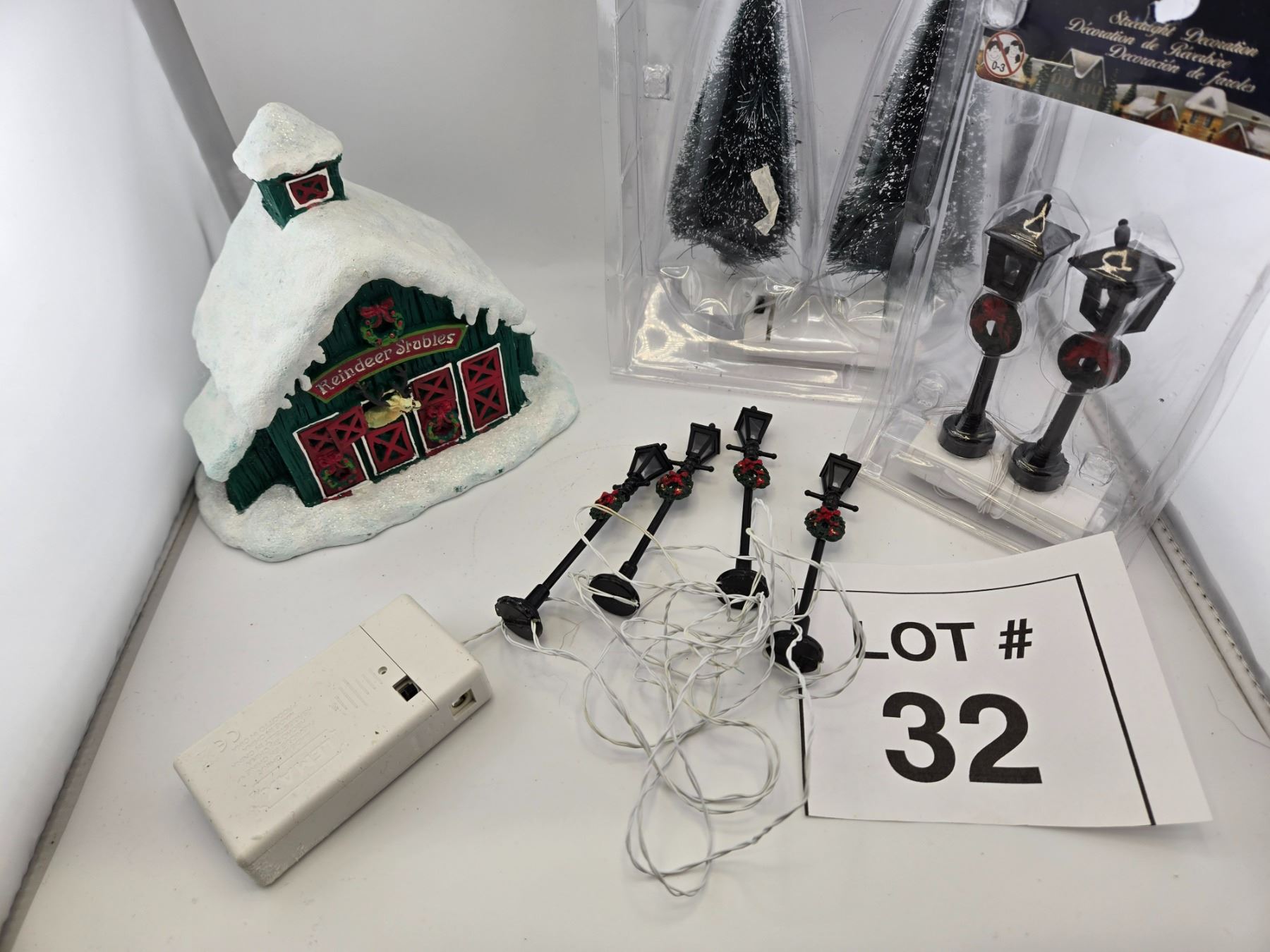 ASSORTED CHRISTMAS VILLAGE ACCESSORIES LOT WITH LAMPPOSTS, TREES, AND REINDEER STABLE