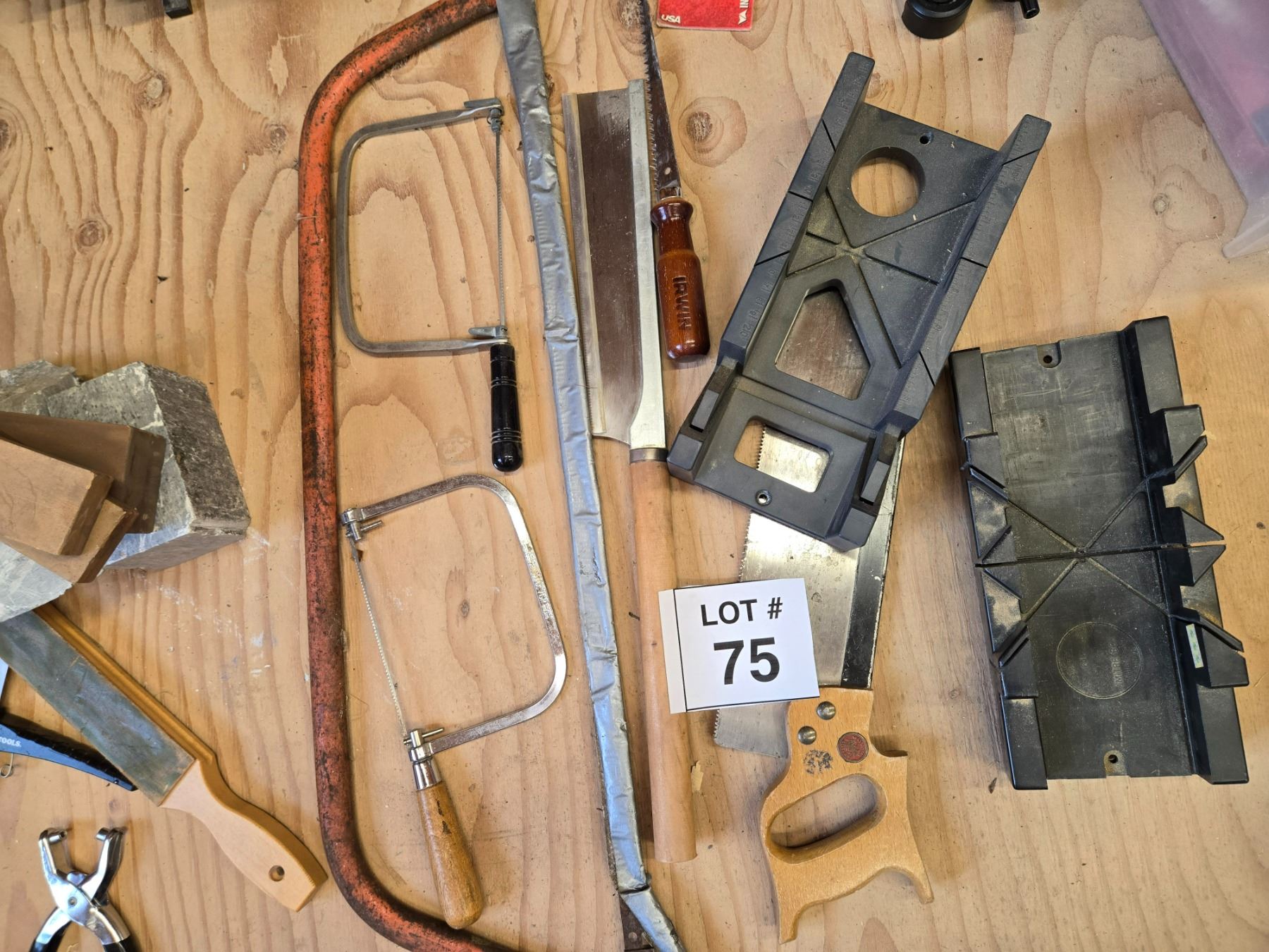 ASSORTED HAND SAWS, MITER BOX, AND WOODWORKING TOOLS