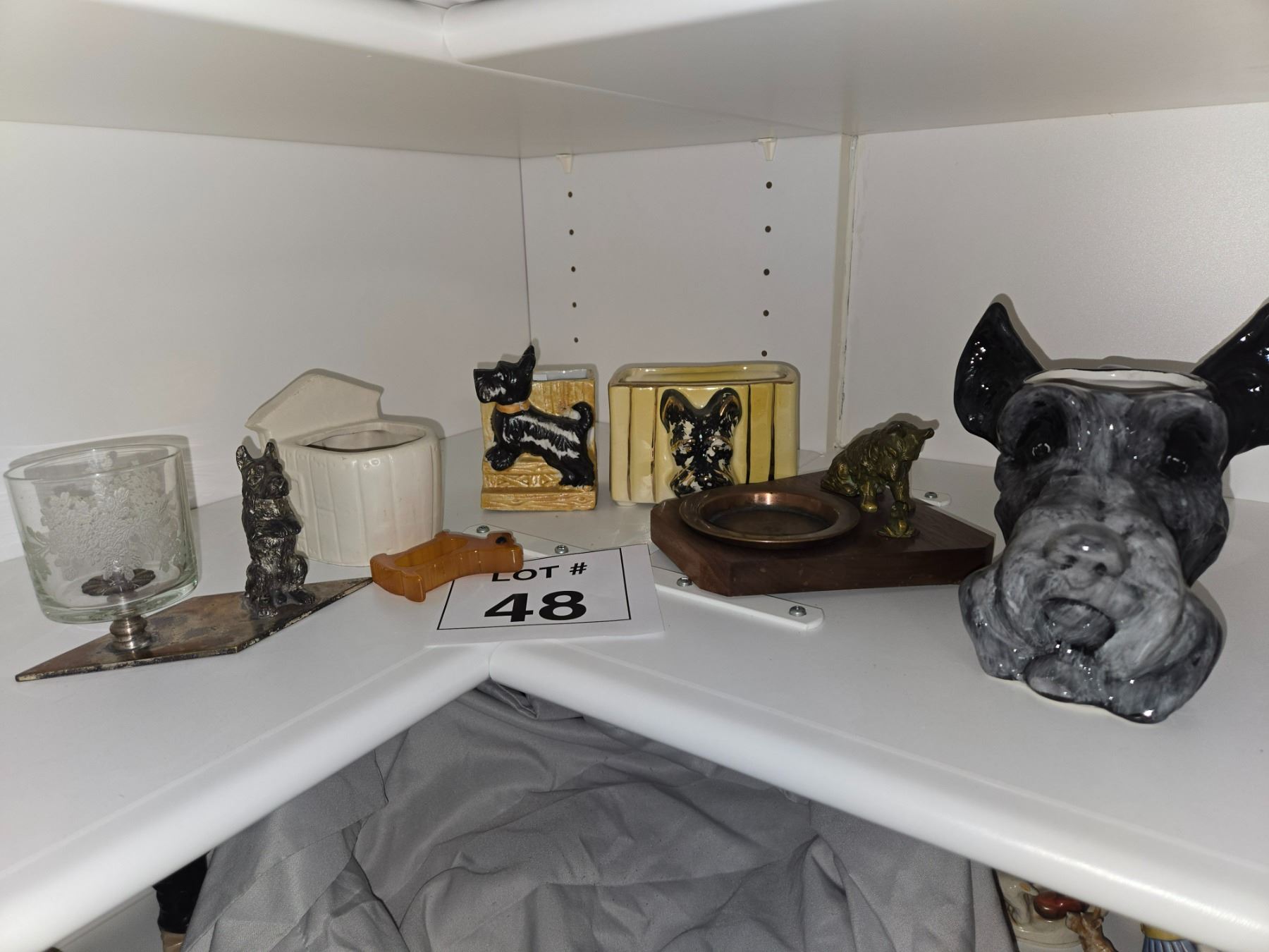 Large mixed lot of Scottie dog–themed desk and smoking accessories including ashtrays, small bronze-tone figures, glassware, ceramic containers, and novelty items mounted on wood bases.
