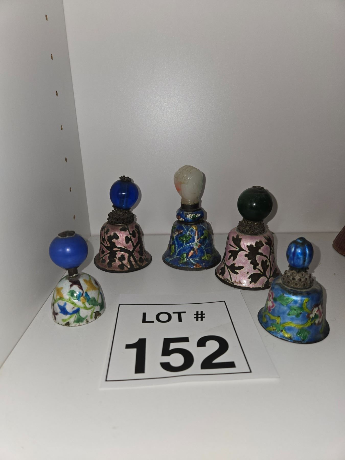 Collection of cloisonné enamel bells featuring floral and foliate designs in blue, green, and pink tones. Each topped with a rounded glass or stone finial. Mixed metal mounts with decorative collars.