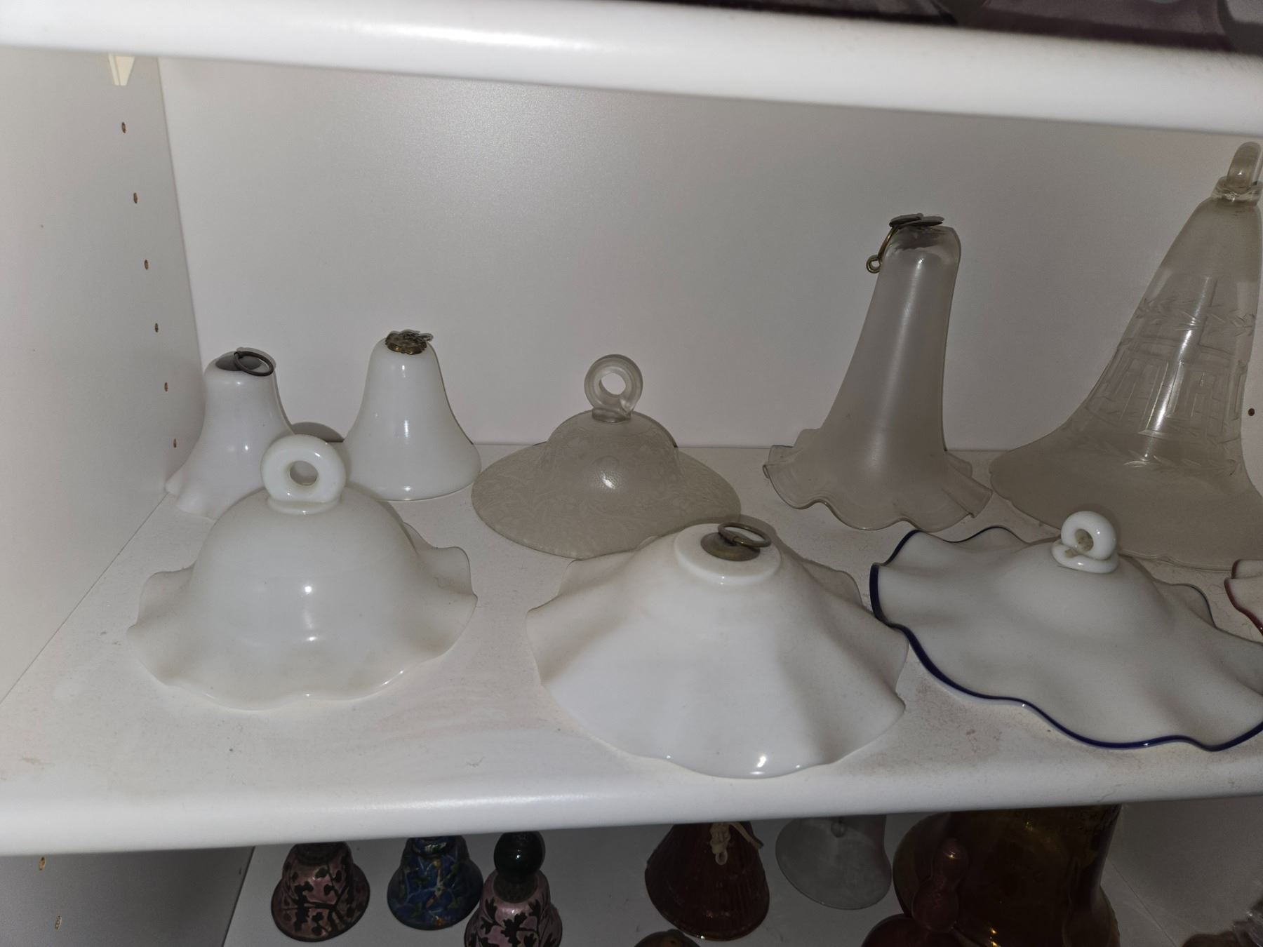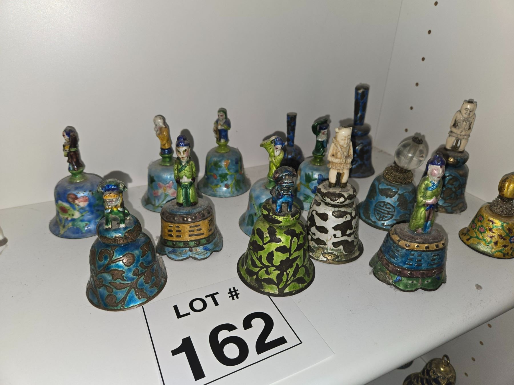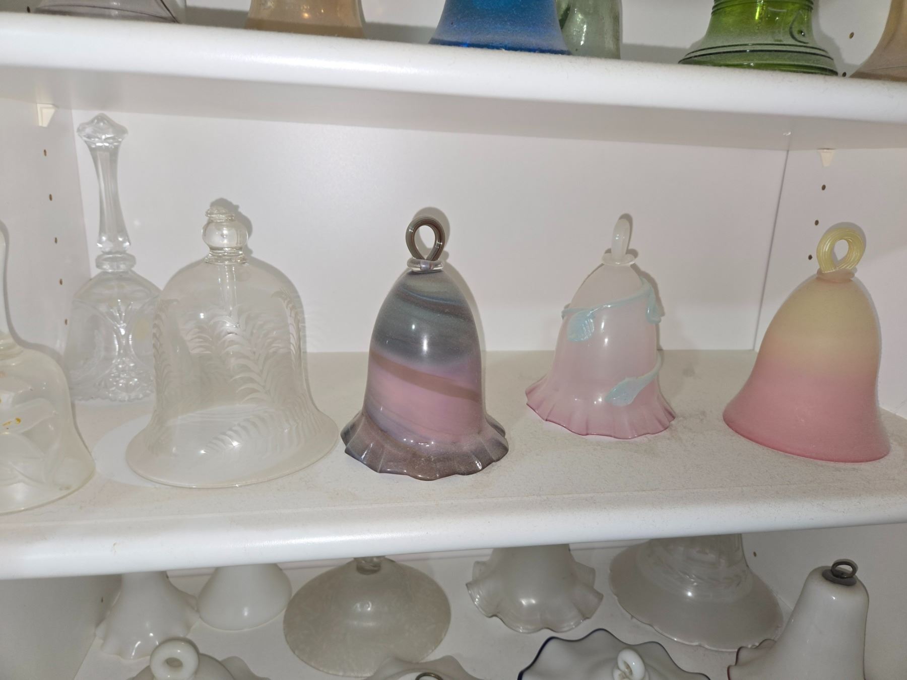 Large and varied collection of decorative bells featuring figural finials, enamel and cloisonné styles, frosted and colored art glass, and ceramic examples.