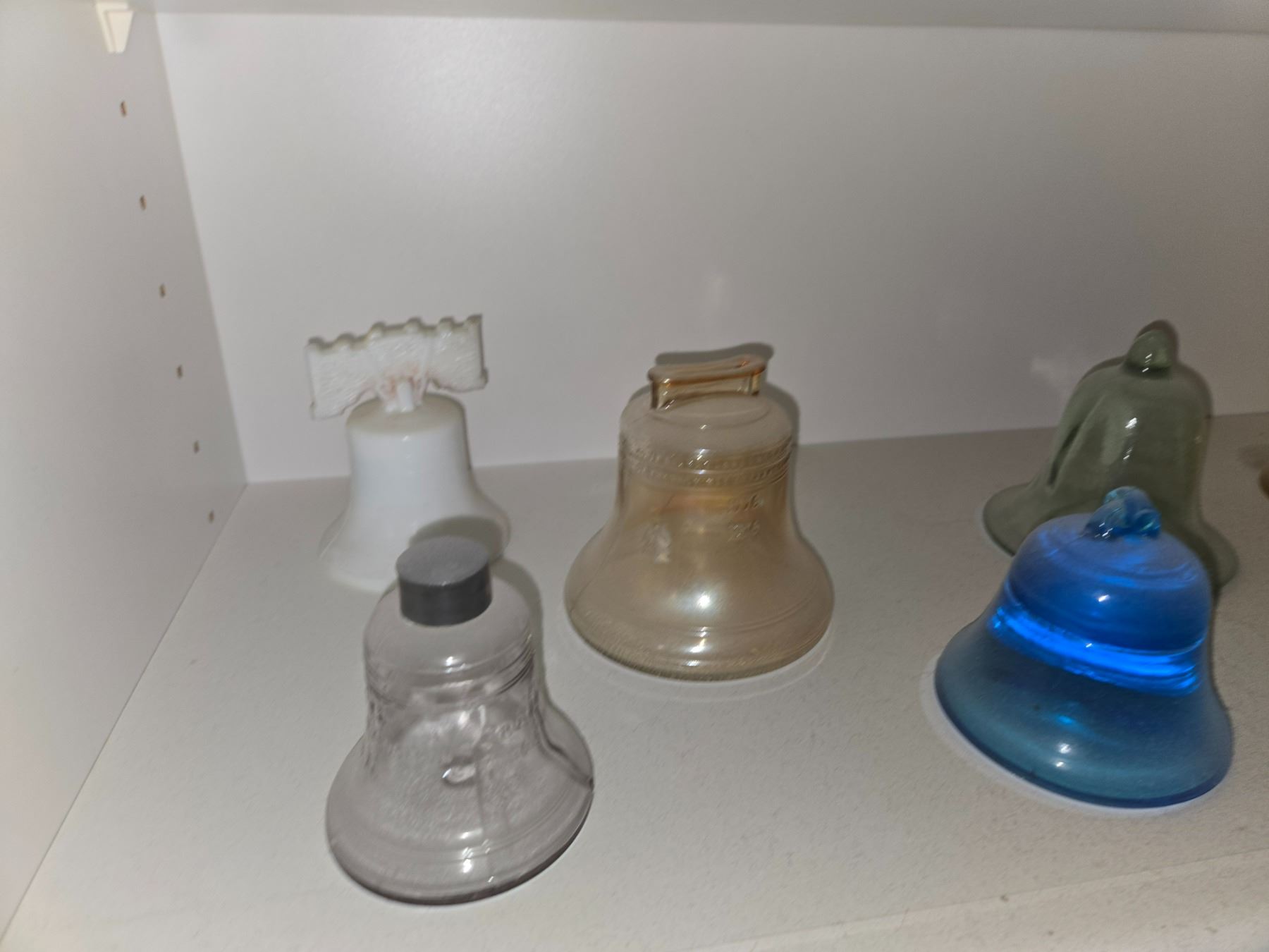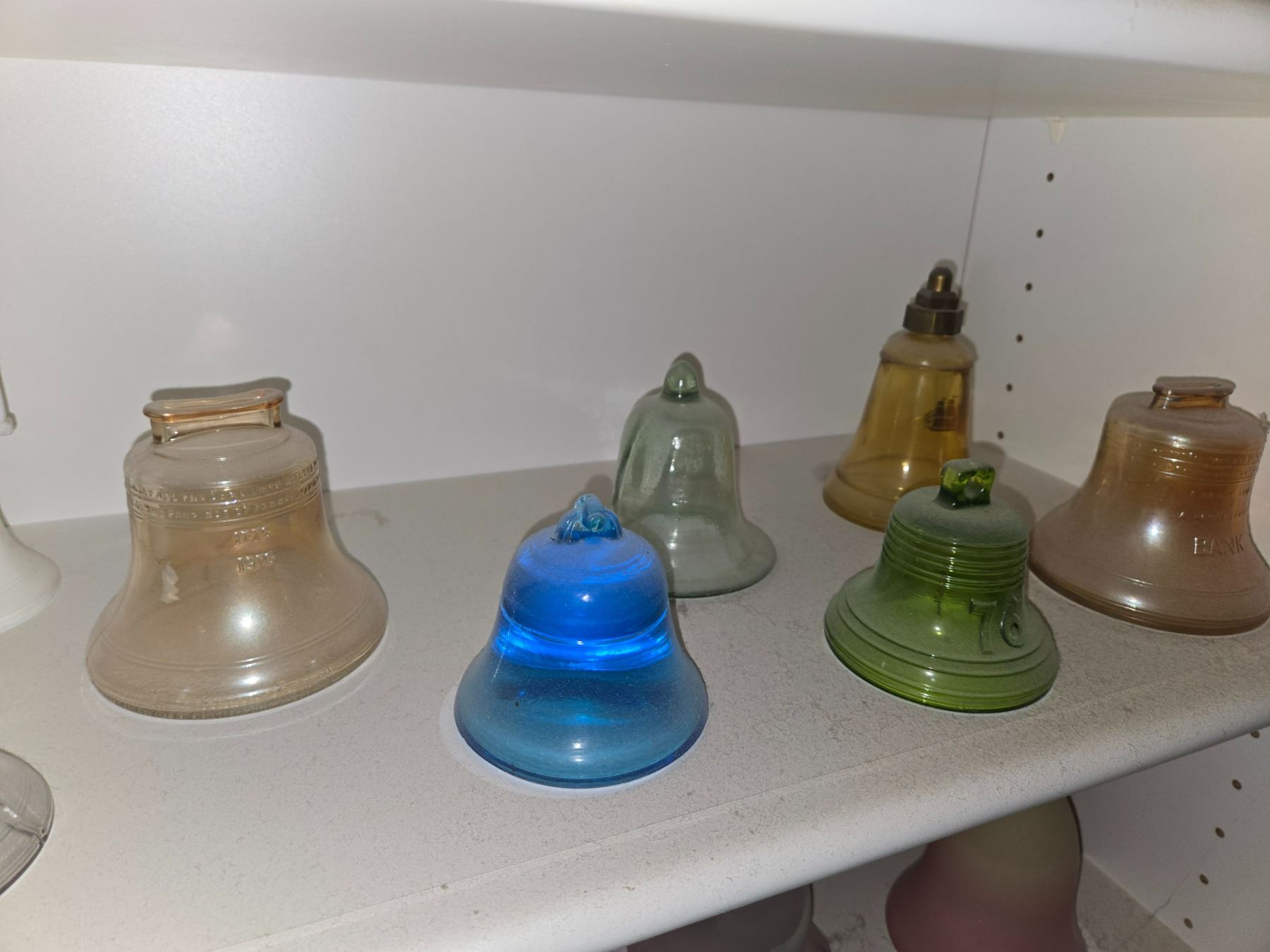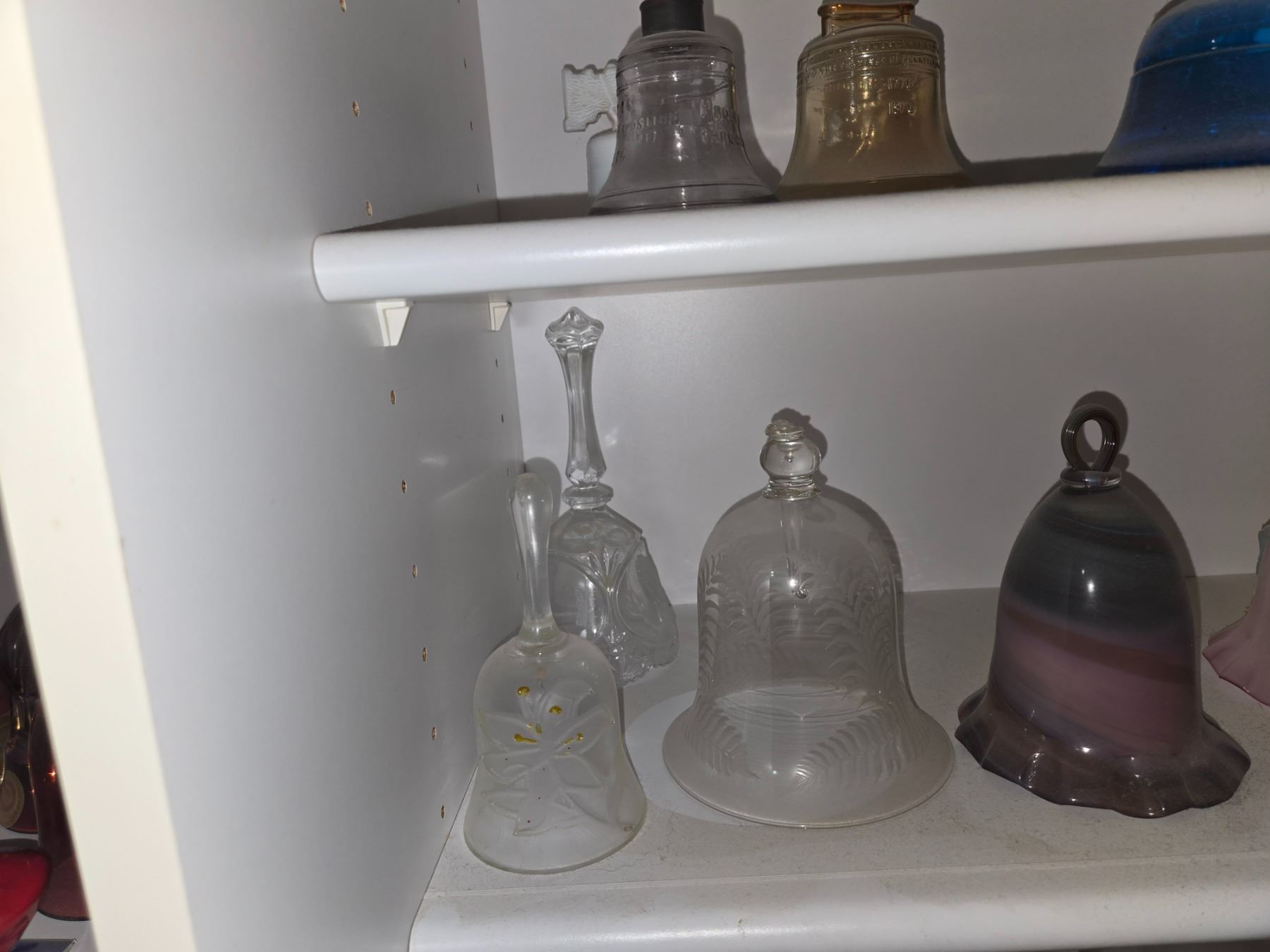 Large and varied collection of decorative bells featuring figural finials, enamel and cloisonné styles, frosted and colored art glass, and ceramic examples.