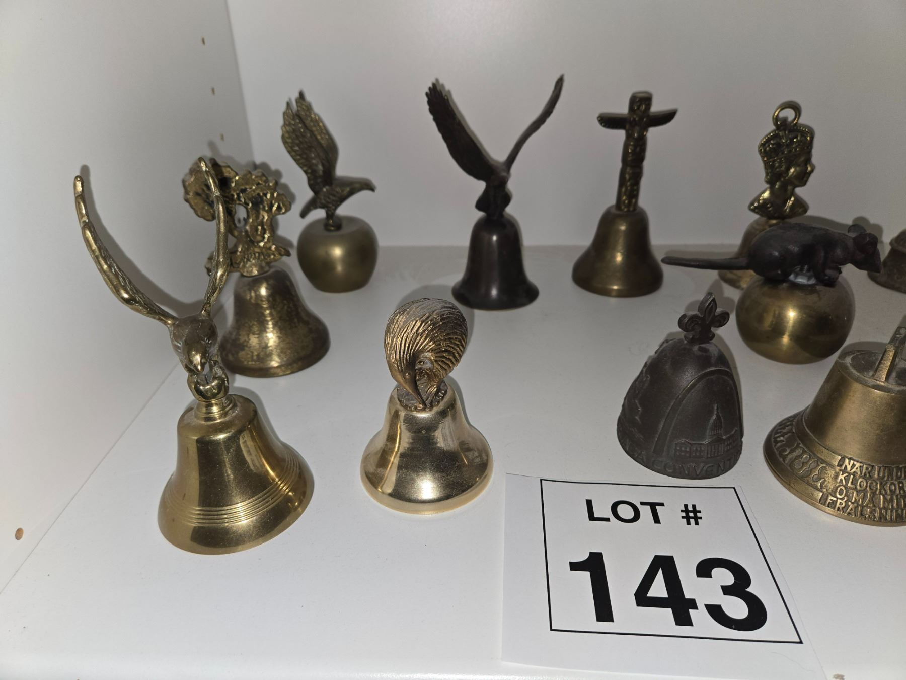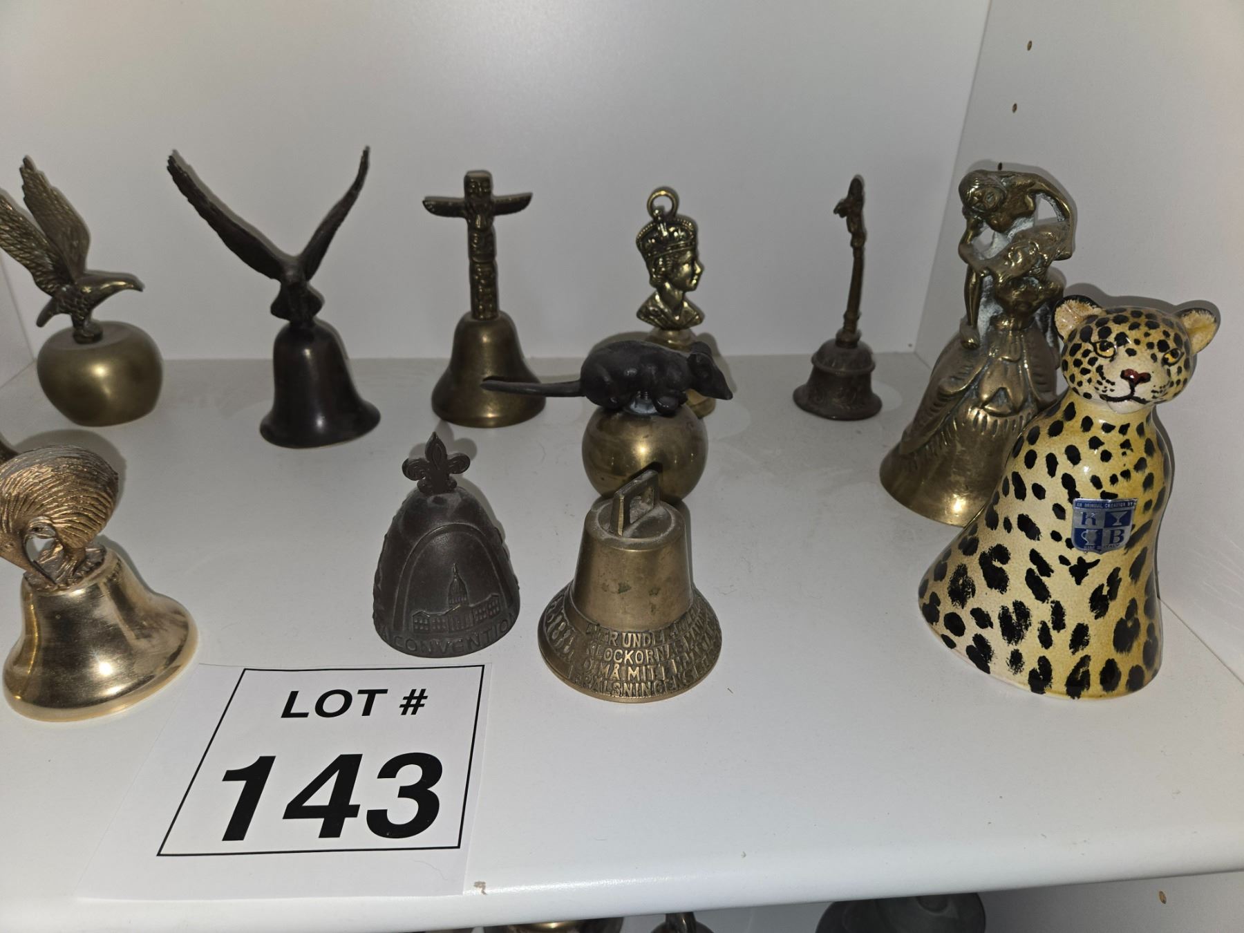 Large mixed group of decorative bells featuring birds, animals, religious figures, monuments, and novelty forms. Includes brass and darker metal finishes. One ceramic leopard figurine included as part of the lot.