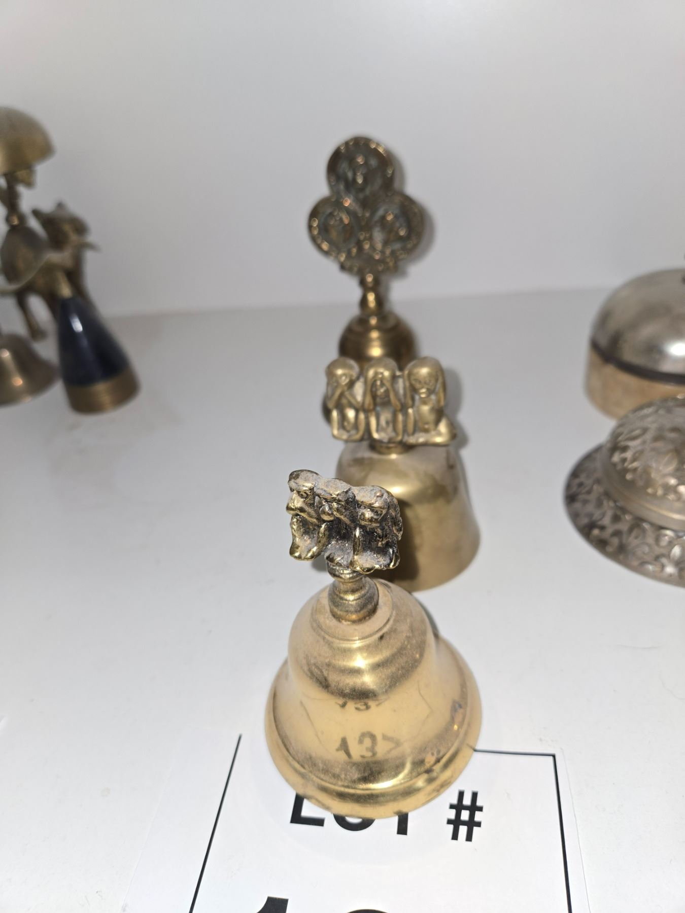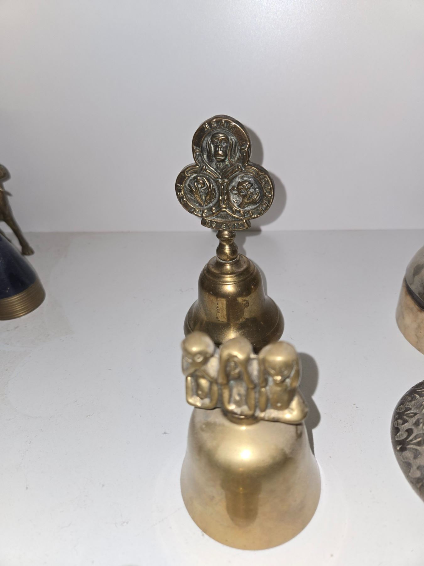 Small group of decorative brass bells featuring symbolic and figural finials, including a “Three Wise Monkeys” motif and a multi-face ornamental finial.