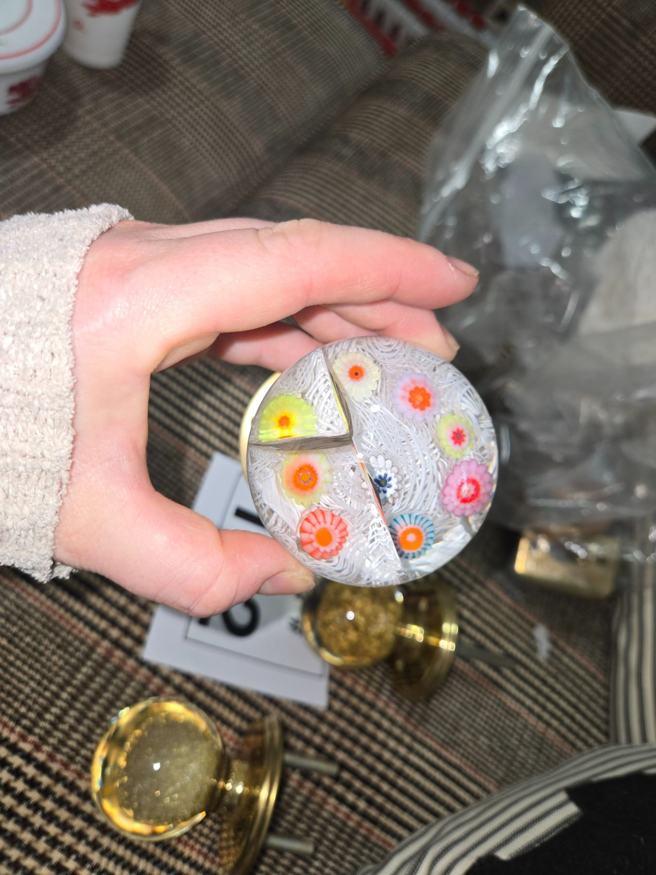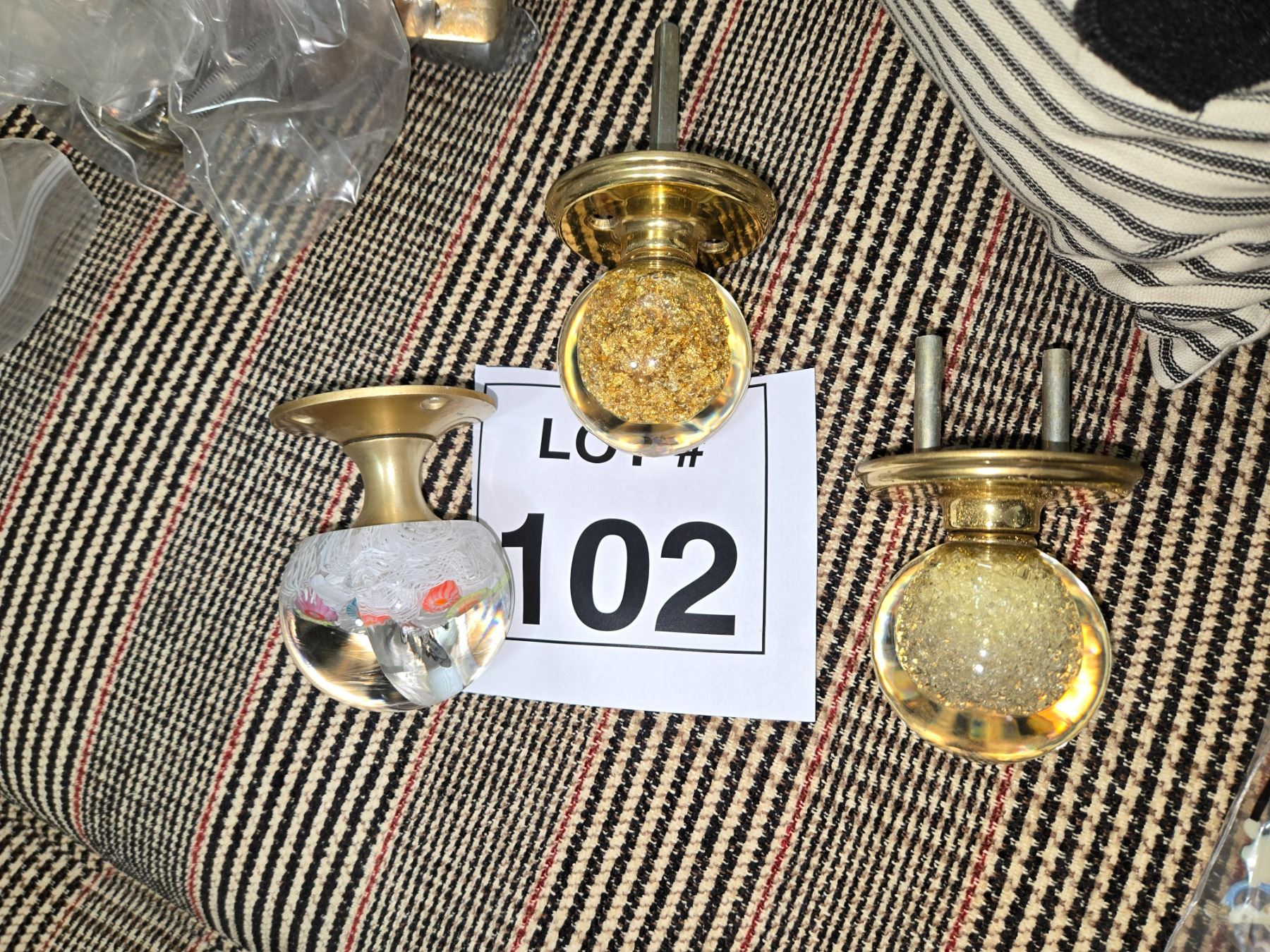 Three decorative glass doorknobs with brass hardware plates. Includes two gold-flake styles and one clear floral-etched glass knob.