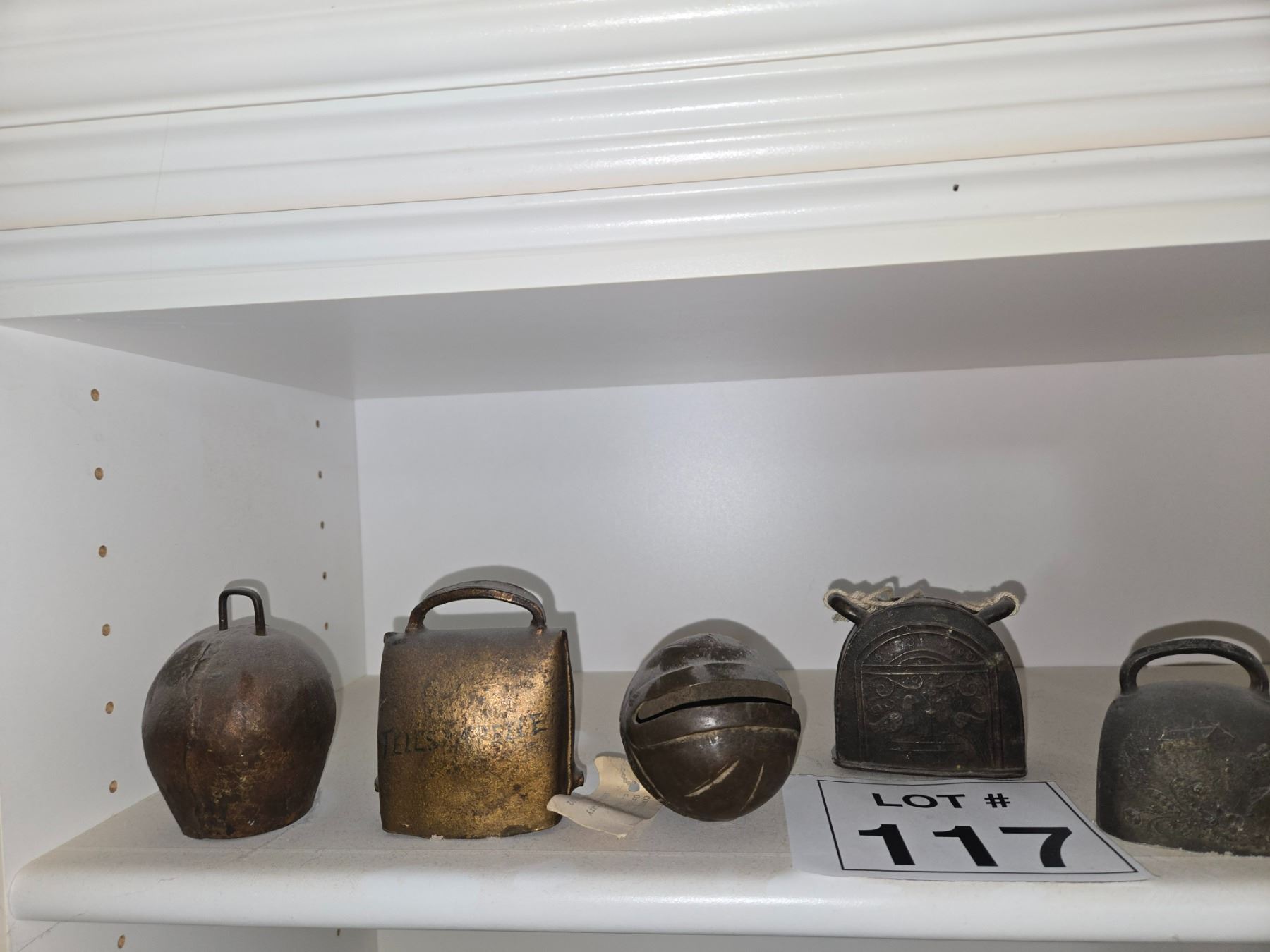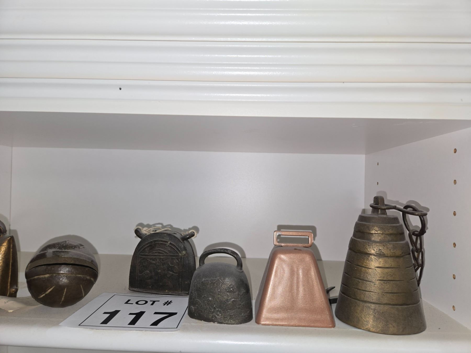 Group of antique livestock bells including iron and brass examples in various sizes and shapes. Surface wear, patina, and oxidation consistent with age and use.