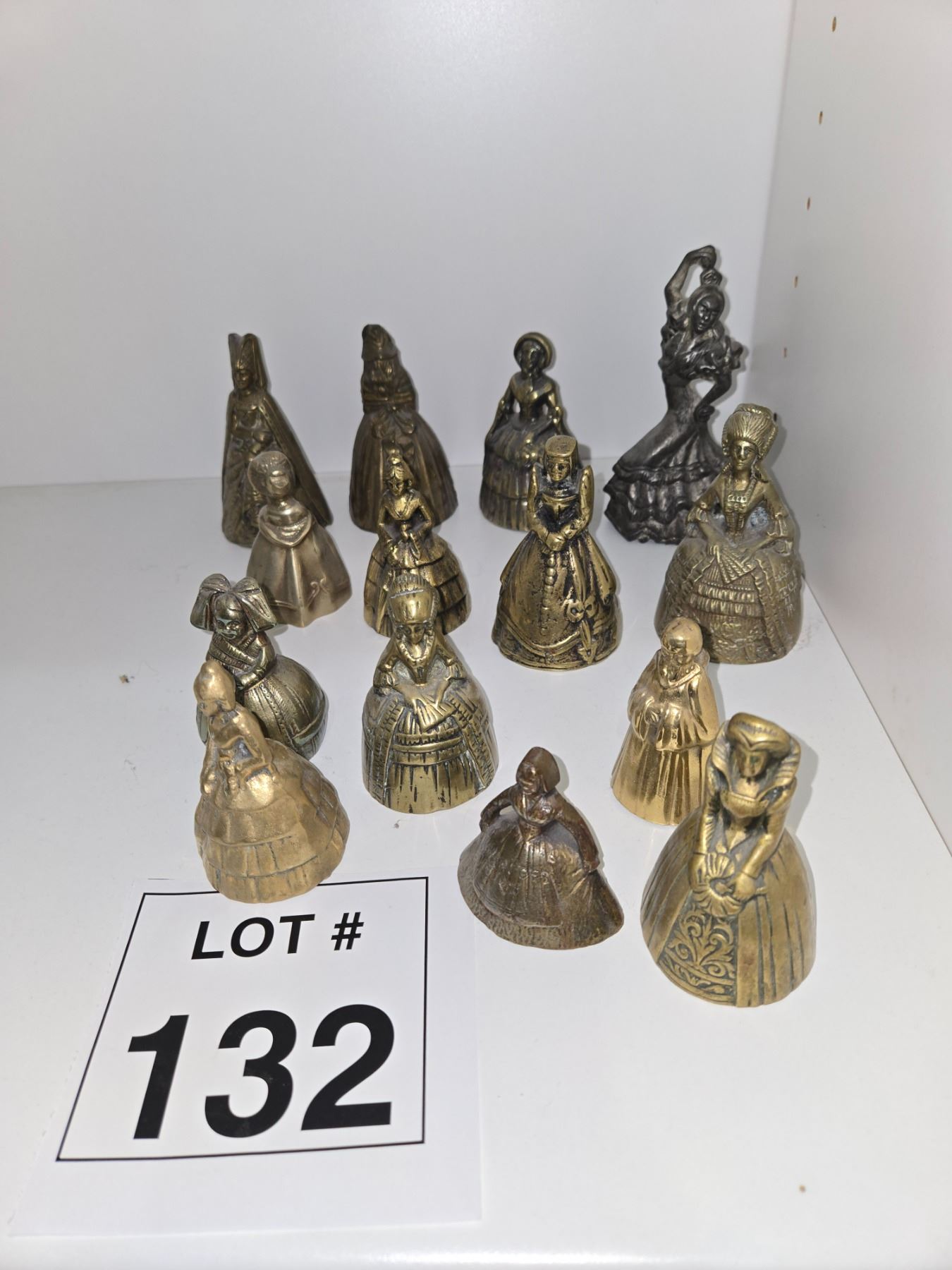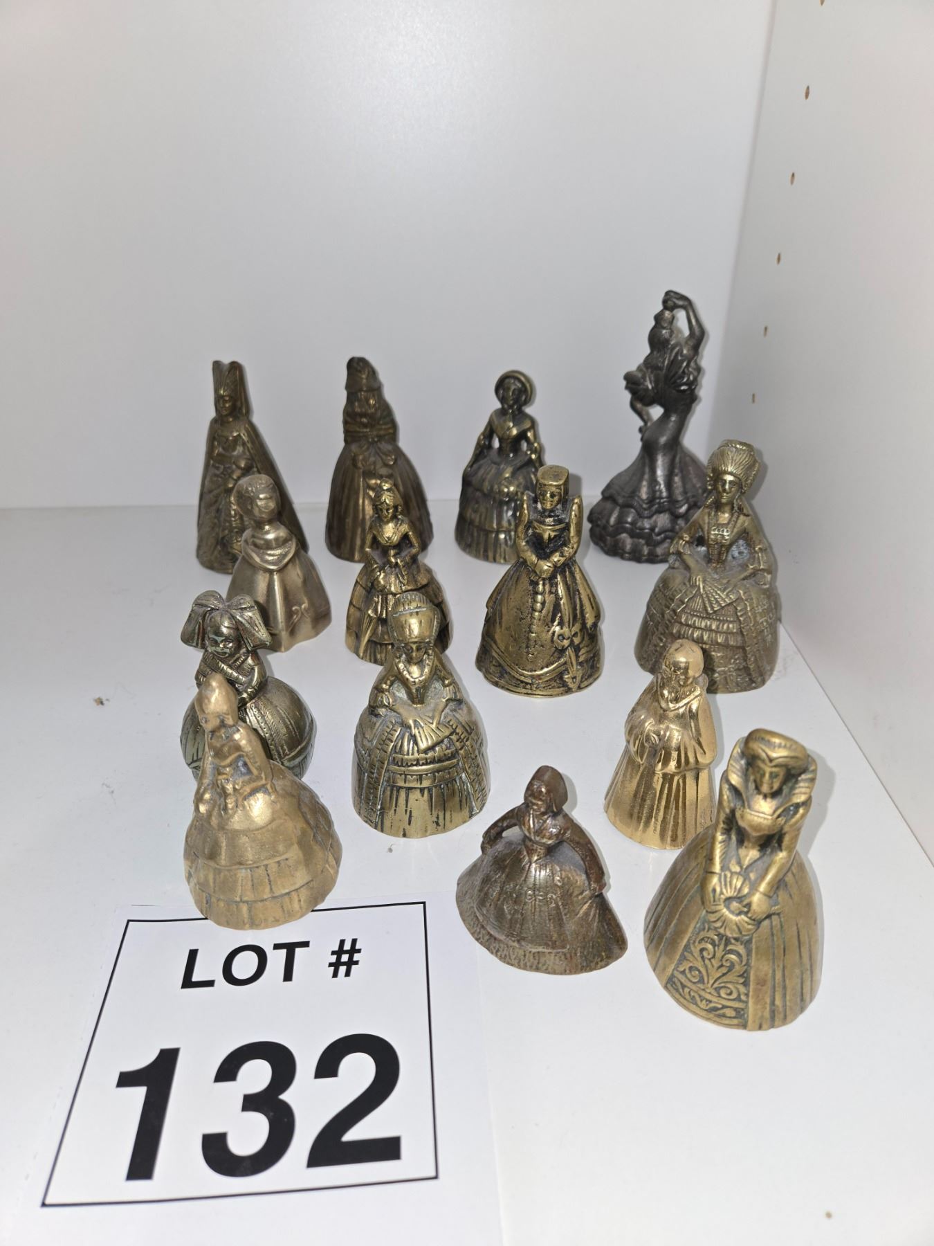 Group lot of decorative brass bells featuring women in period and traditional dress. Includes multiple figural finials with detailed skirts, headwear, and ornamental bases.