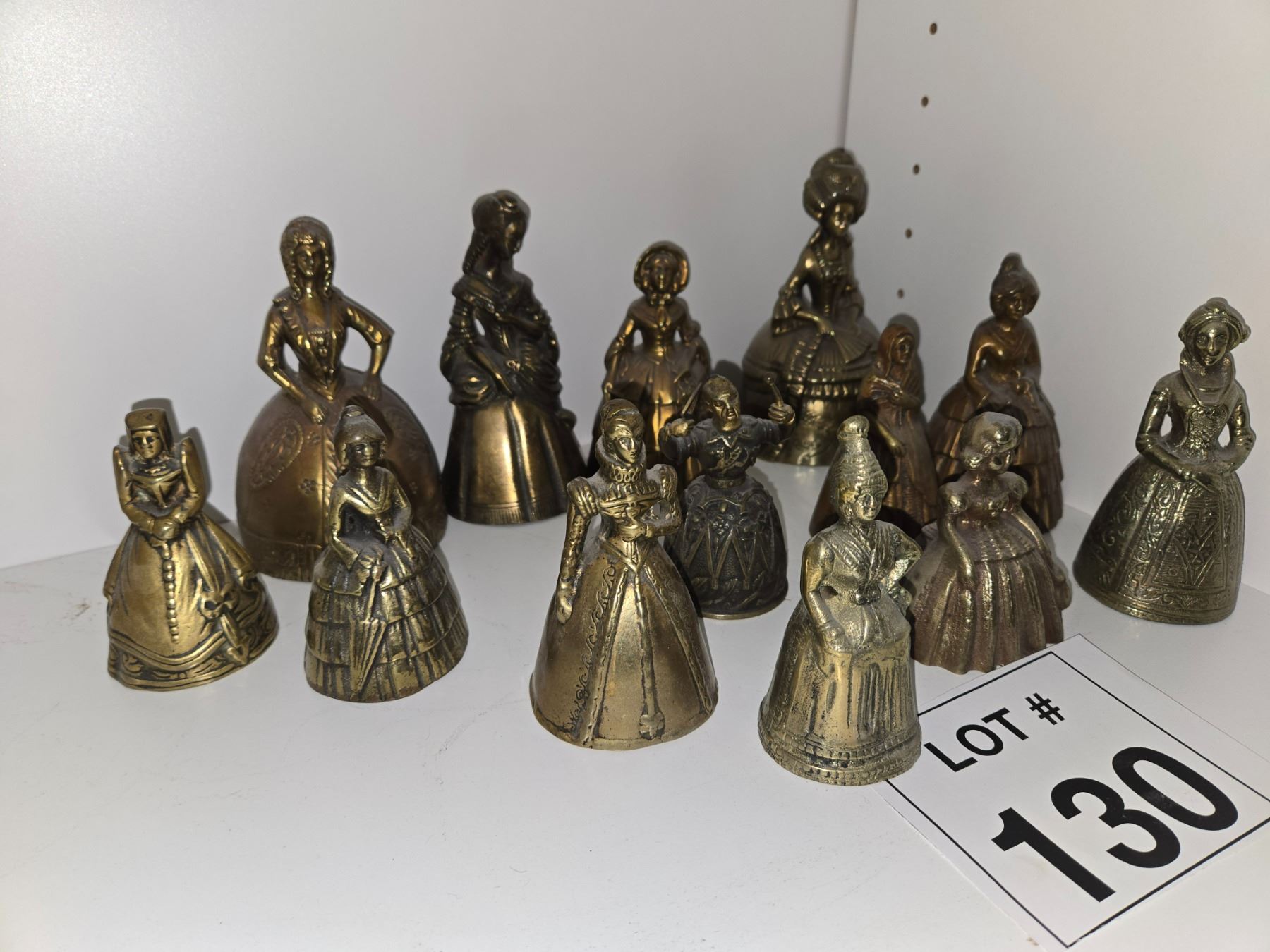 Large group of small brass bells, predominantly female figural forms in various dress styles.