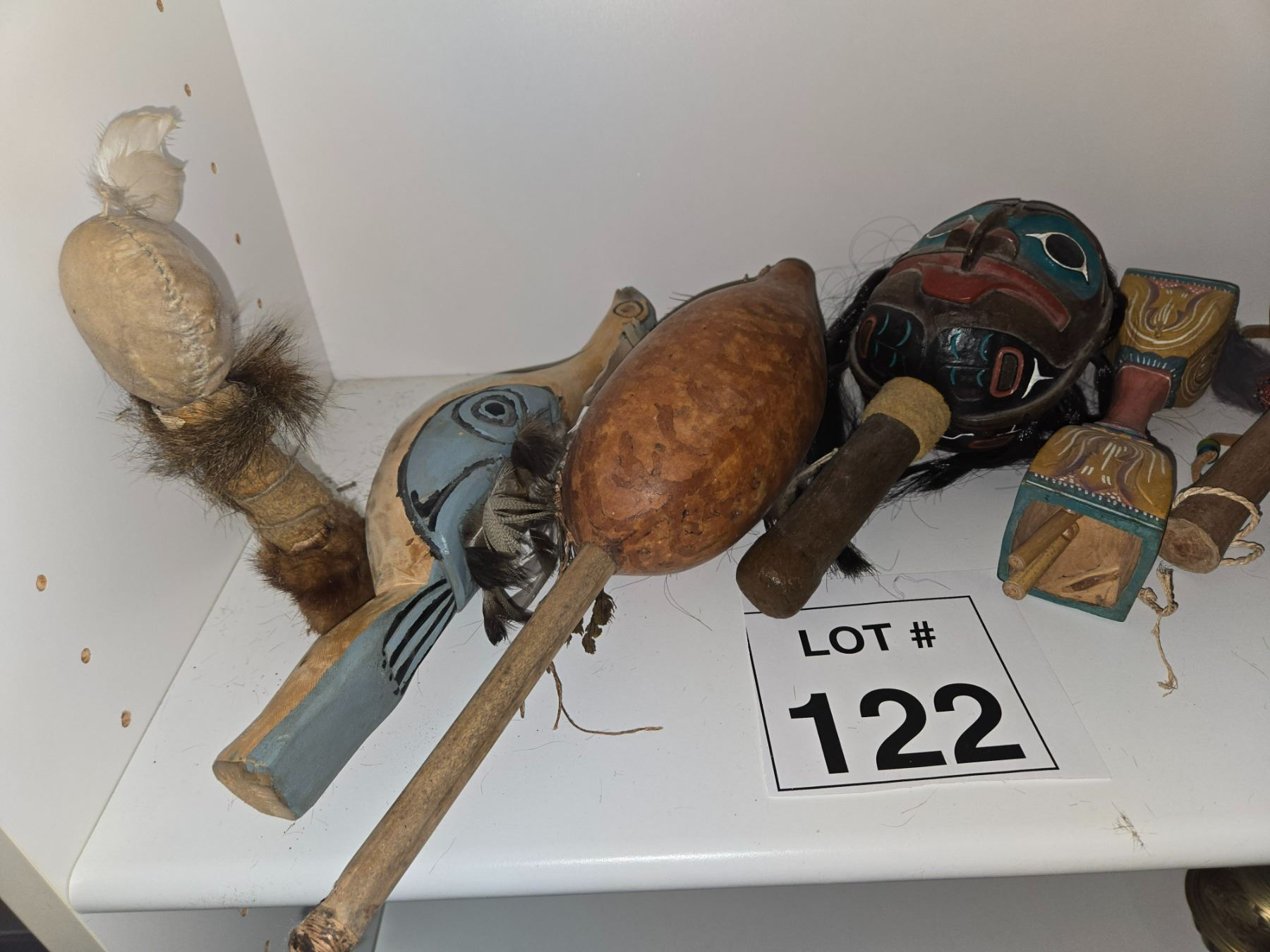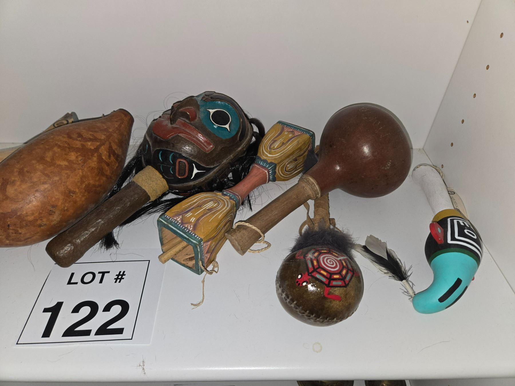 Group of Indigenous-style rattles and percussion objects constructed from gourd, wood, hide, and painted elements. Includes carved and decorated examples with natural materials.