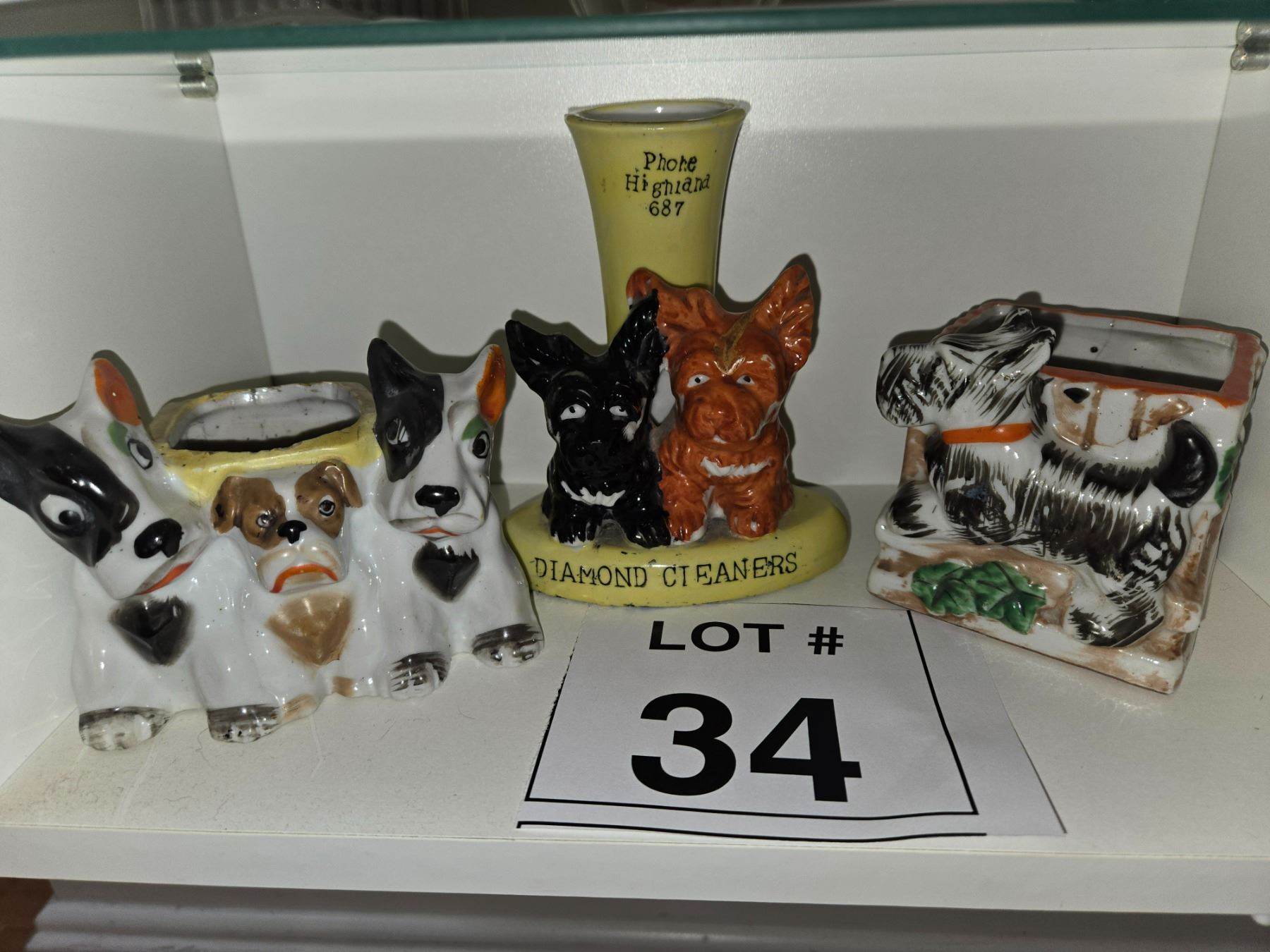 Four-piece lot of Japanese ceramic dog novelty items. Hand-painted glazed ceramic, produced for export.