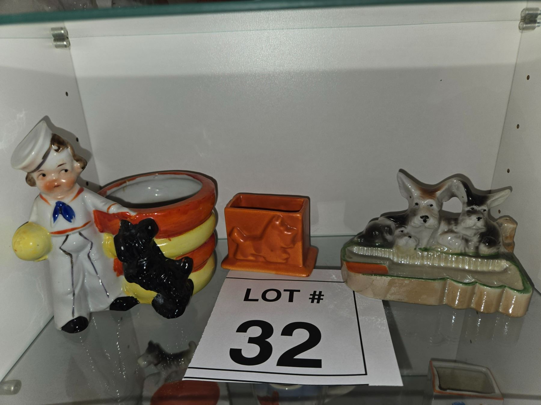 Three-piece lot of Japanese ceramic dog-themed novelty items, including a figural ashtray, a mug with raised dog decoration, and a small planter. Hand-painted glazed ceramic made for export.