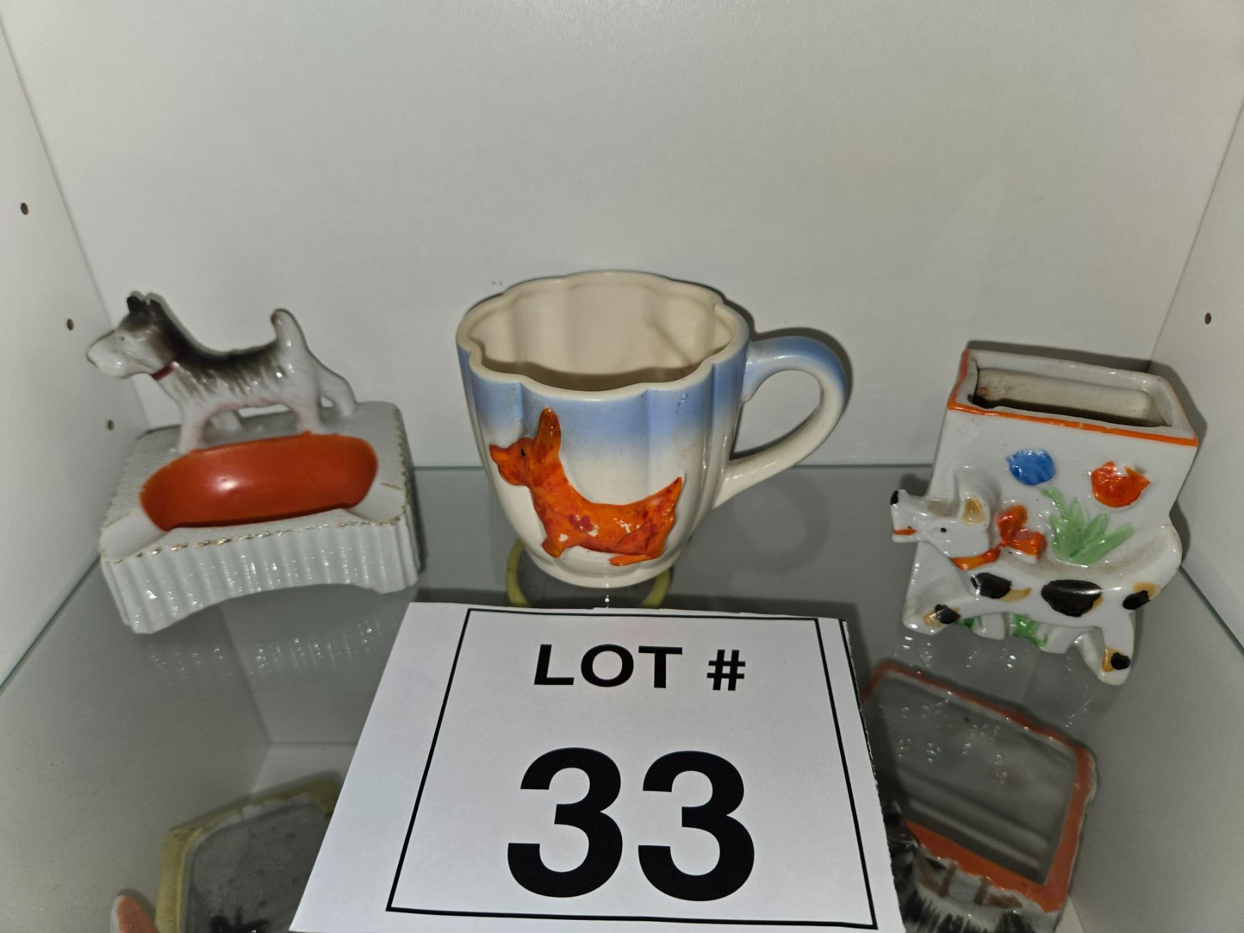 Three-piece lot of Japanese ceramic dog-themed novelty items, including a figural ashtray, a mug with raised dog decoration, and a small planter. Hand-painted glazed ceramic made for export.