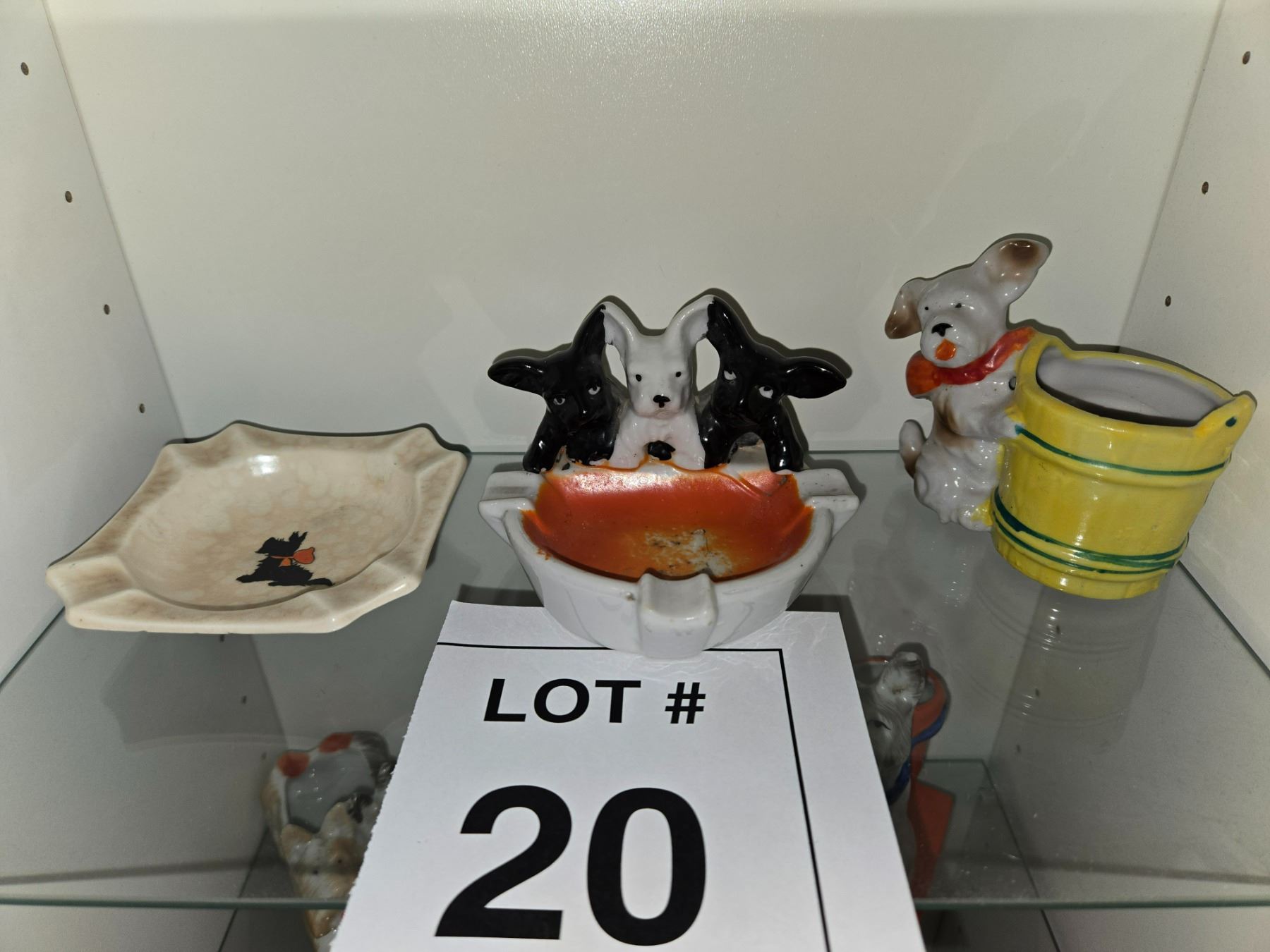 Lot of three Japanese ceramic dog-themed ashtrays and small trays, including multi-dog figural ashtray and shallow dish. Hand-painted glazed ceramic, produced for export during the Showa period.