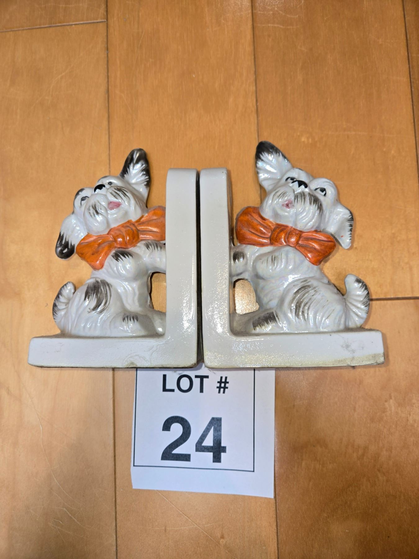 Matching pair of Japanese ceramic dog bookends featuring seated dogs with orange bow accents. Glazed ceramic with molded bases. Classic mid-century Japanese export novelty items.