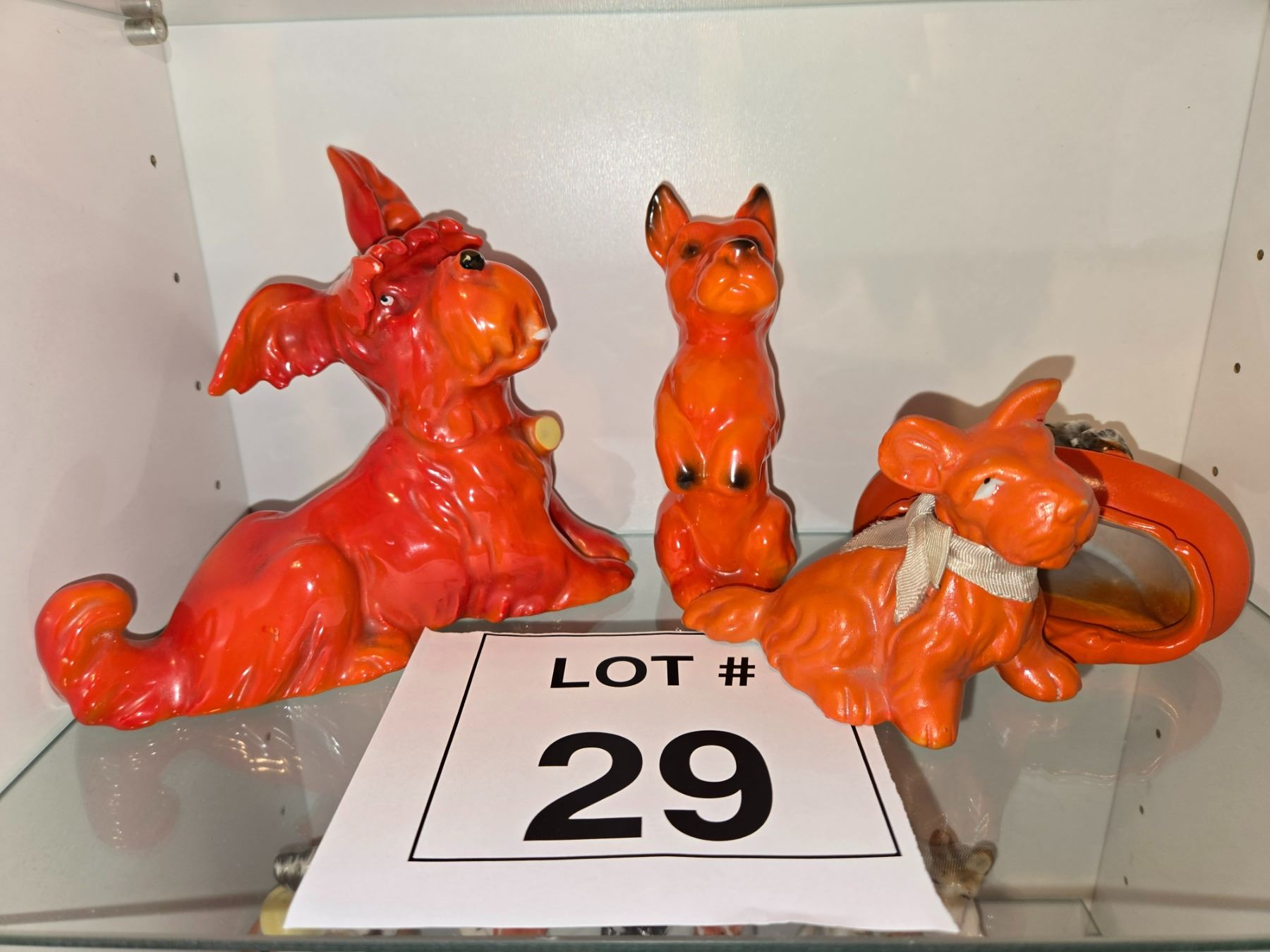 Four-piece lot of larger Japanese ceramic dog figures in orange and red glazes, including seated and standing dogs and a matching ashtray. Bold mid-century styling. Hand-painted glazed ceramic produced for export.