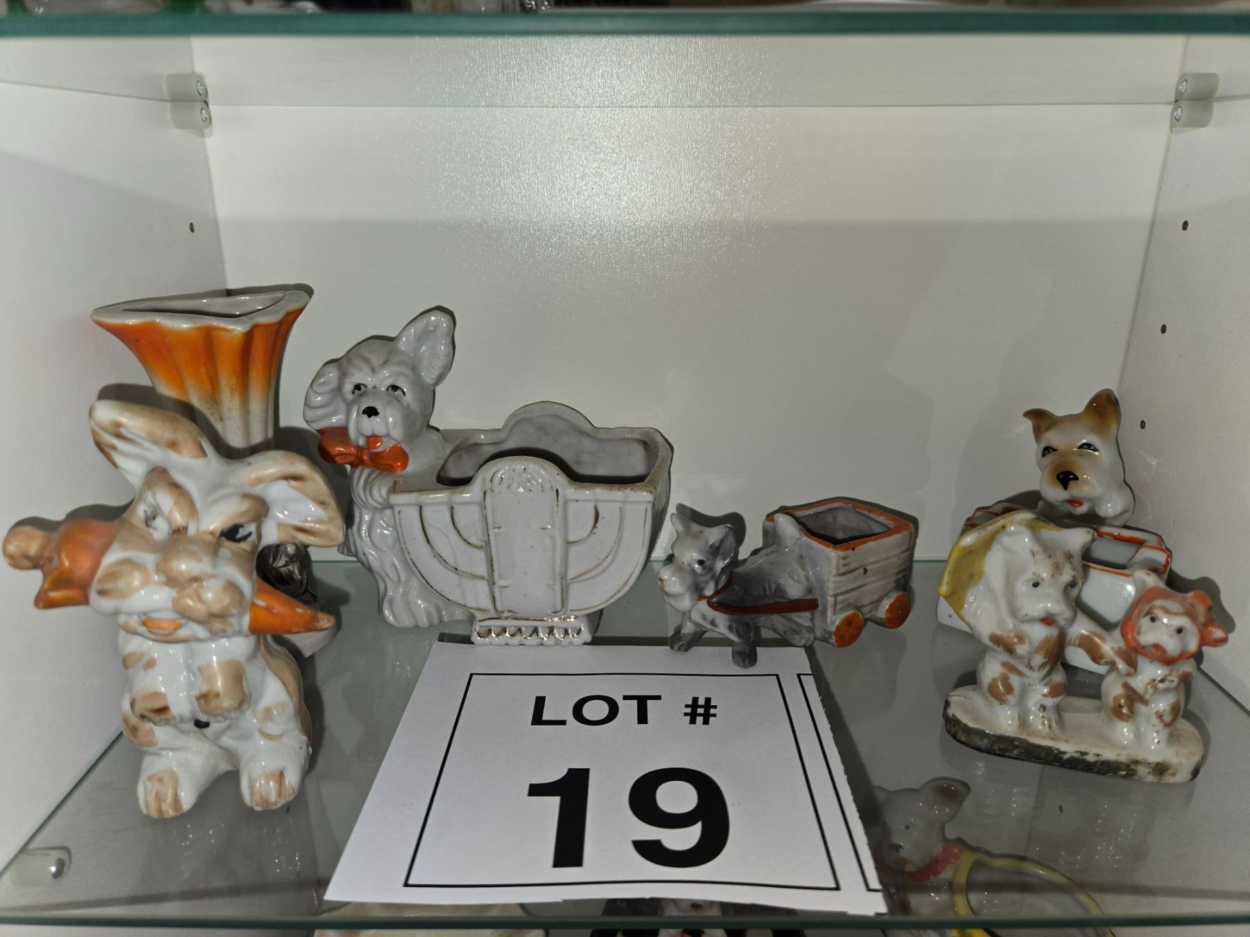 Five-piece lot of Japanese ceramic dog planters and figurines, including wagon-form planter and standing dog figures. Glazed and hand-painted ceramic. Popular mid-century Japanese export novelty ware.