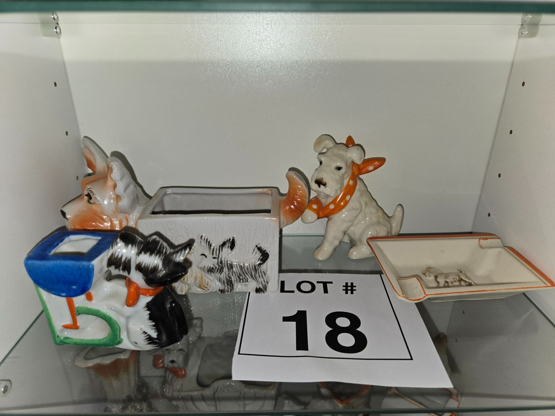 Assorted lot of four Japanese ceramic dog-themed novelty items, including small trays, containers, and figural accessories. Hand-painted with cream, orange, and black glazes. Typical Japanese export ceramics made for Western markets. Condition varies across pieces.