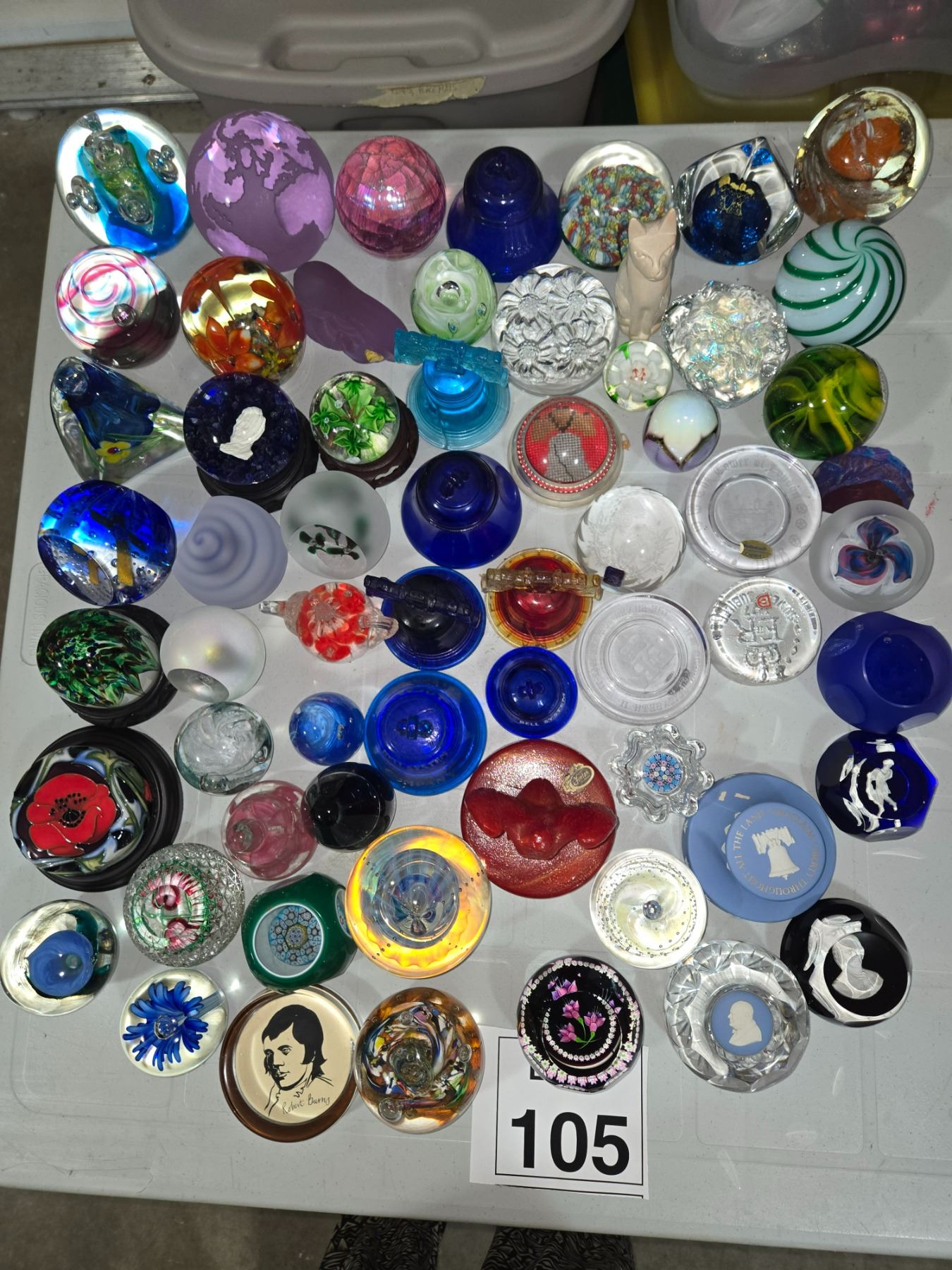 Assortment of art glass paperweights including millefiori, controlled bubbles, cameo silhouettes, floral encased designs, sculpted inclusions, abstract forms, and commemorative pieces.