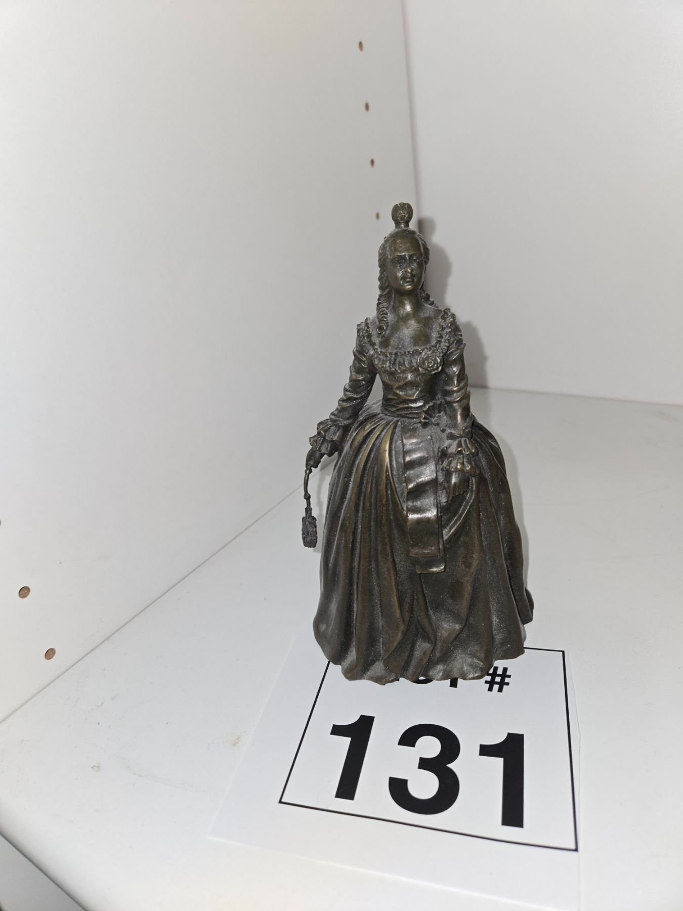 Single large brass bell featuring a finely cast female figure in period dress. Heavier weight and more detailed modeling than typical souvenir bells. Patina consistent with age.