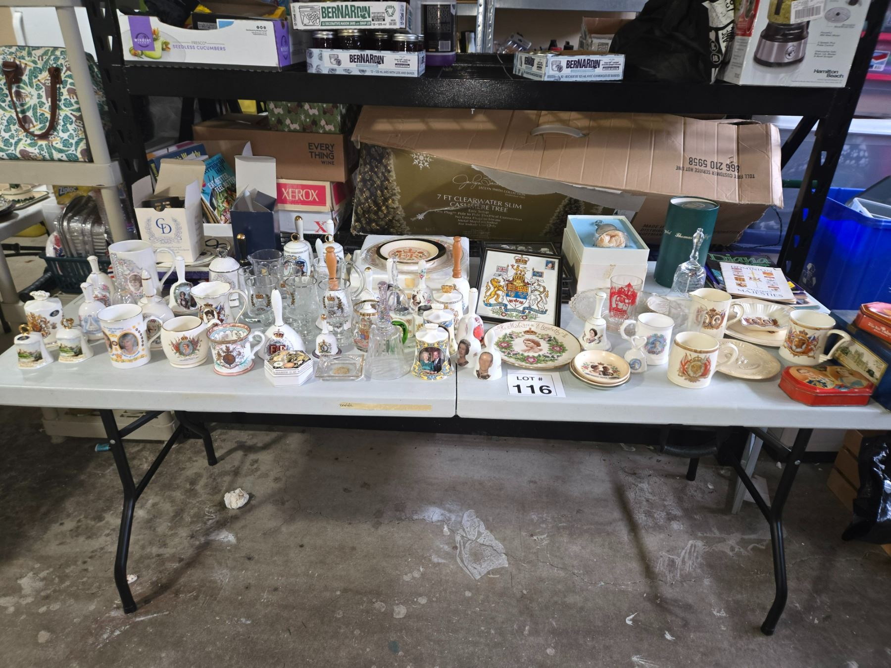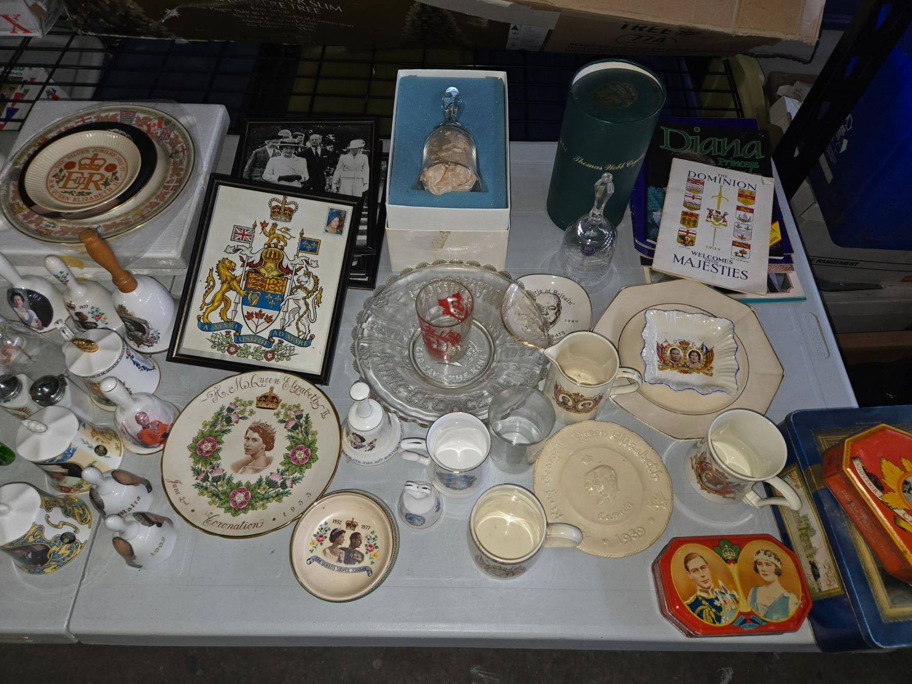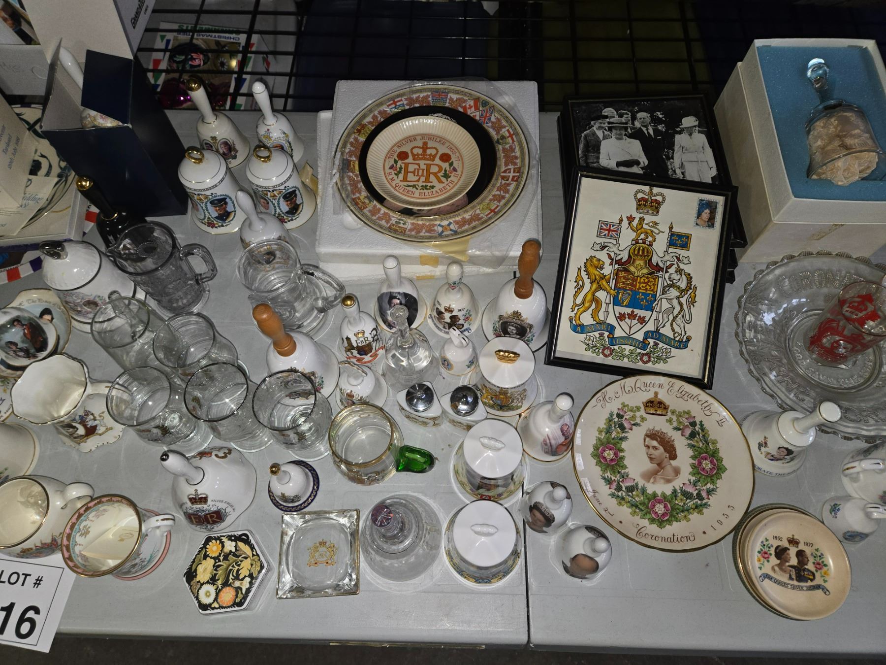 Extensive mixed lot of British royal commemorative items including Queen Elizabeth II coronation (1953), Silver Jubilee (1977), and related events. Includes ceramic bells, mugs, jugs, plates, lidded vessels, tankards, and assorted glassware.