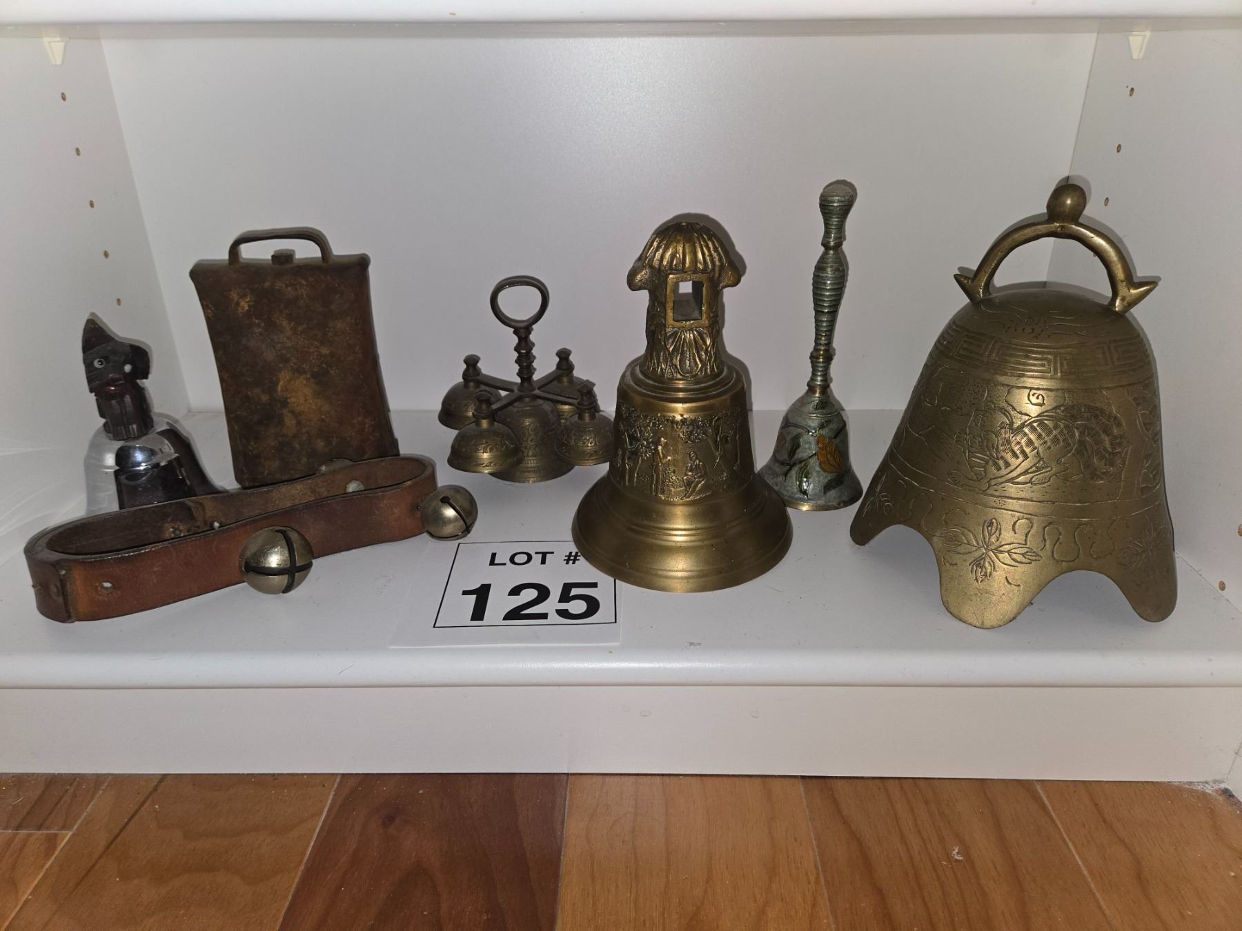 Mixed lot of bells including a large engraved brass bell, multi-bell cluster, handled bells, and strap-mounted jingle bells. Mixed materials and sizes with notable patina and wear.