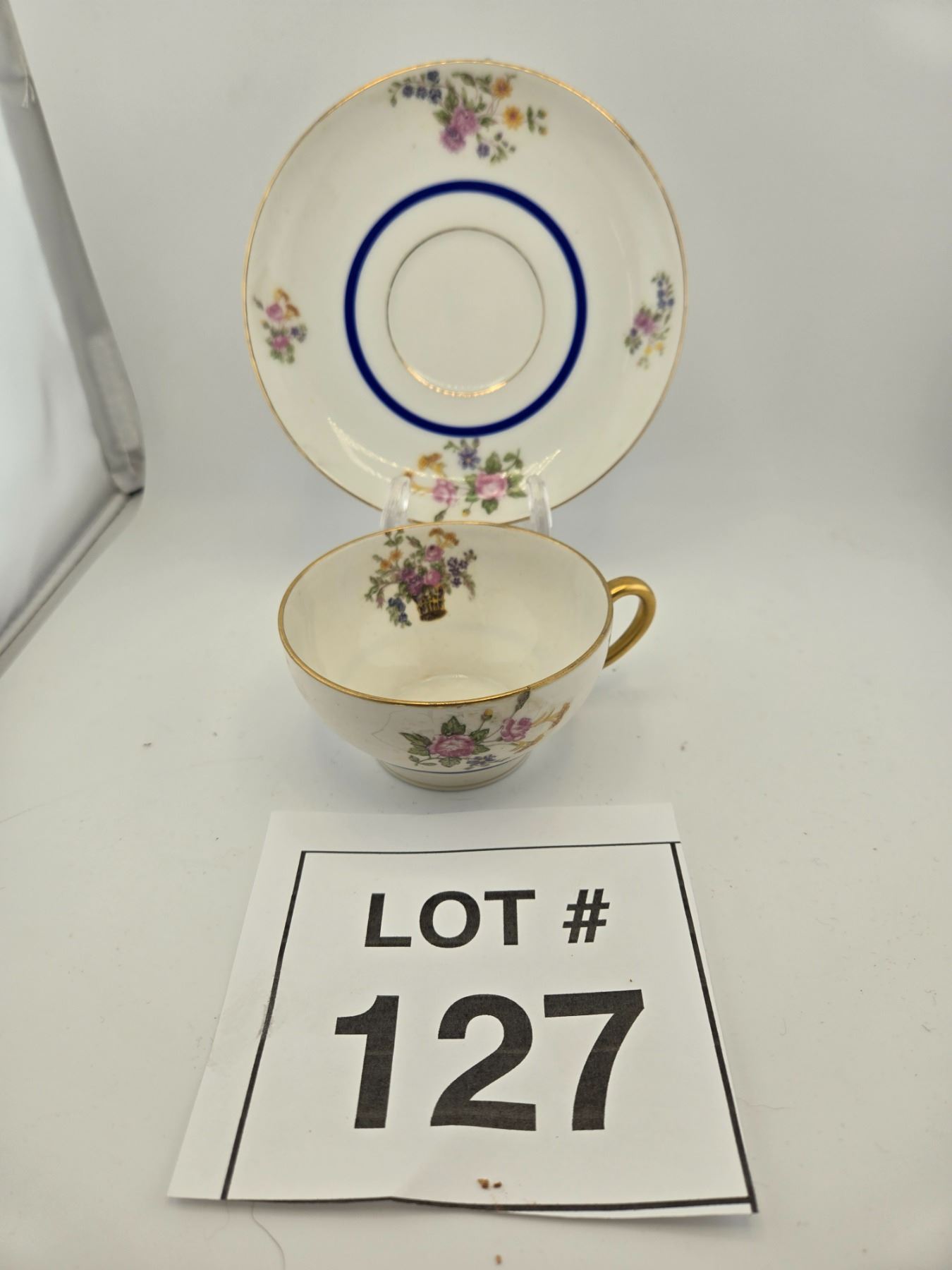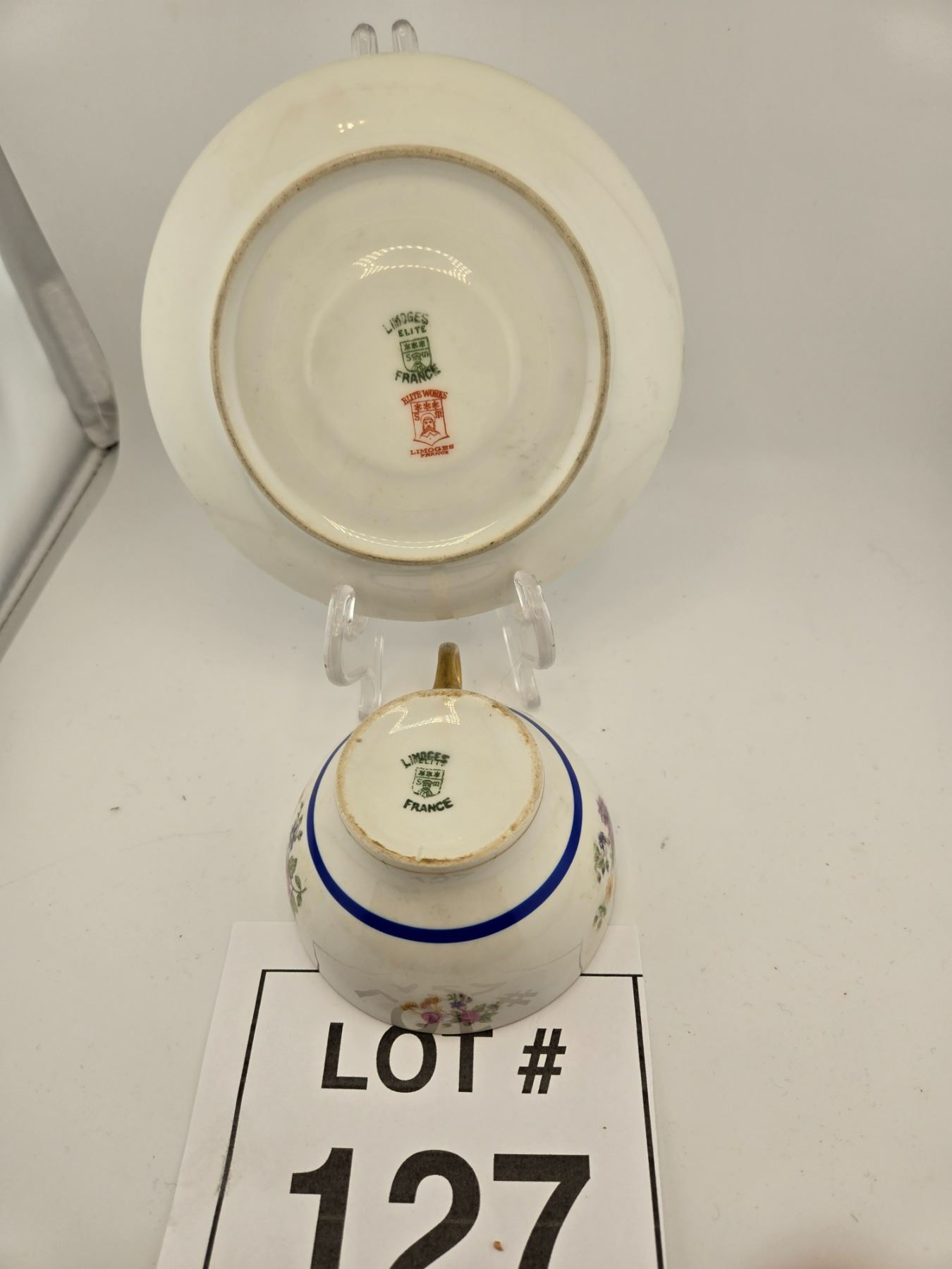 LIMOGES FRANCE PORCELAIN TEACUP AND SAUCER WITH FLORAL DECORATION