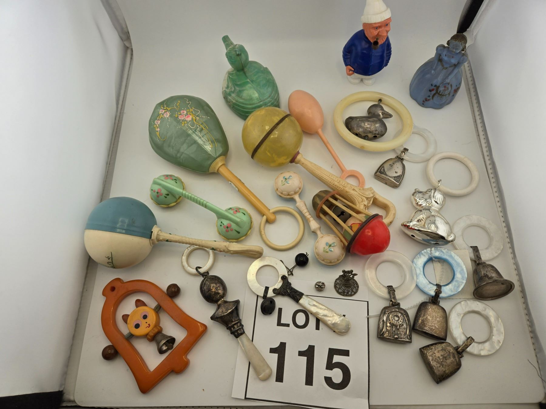 MIXED GROUP OF VINTAGE BABY RATTLES, TEETHING RINGS, BELLS, AND NOVELTY TOYS