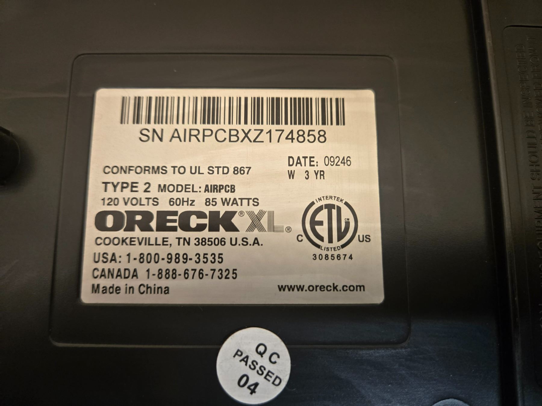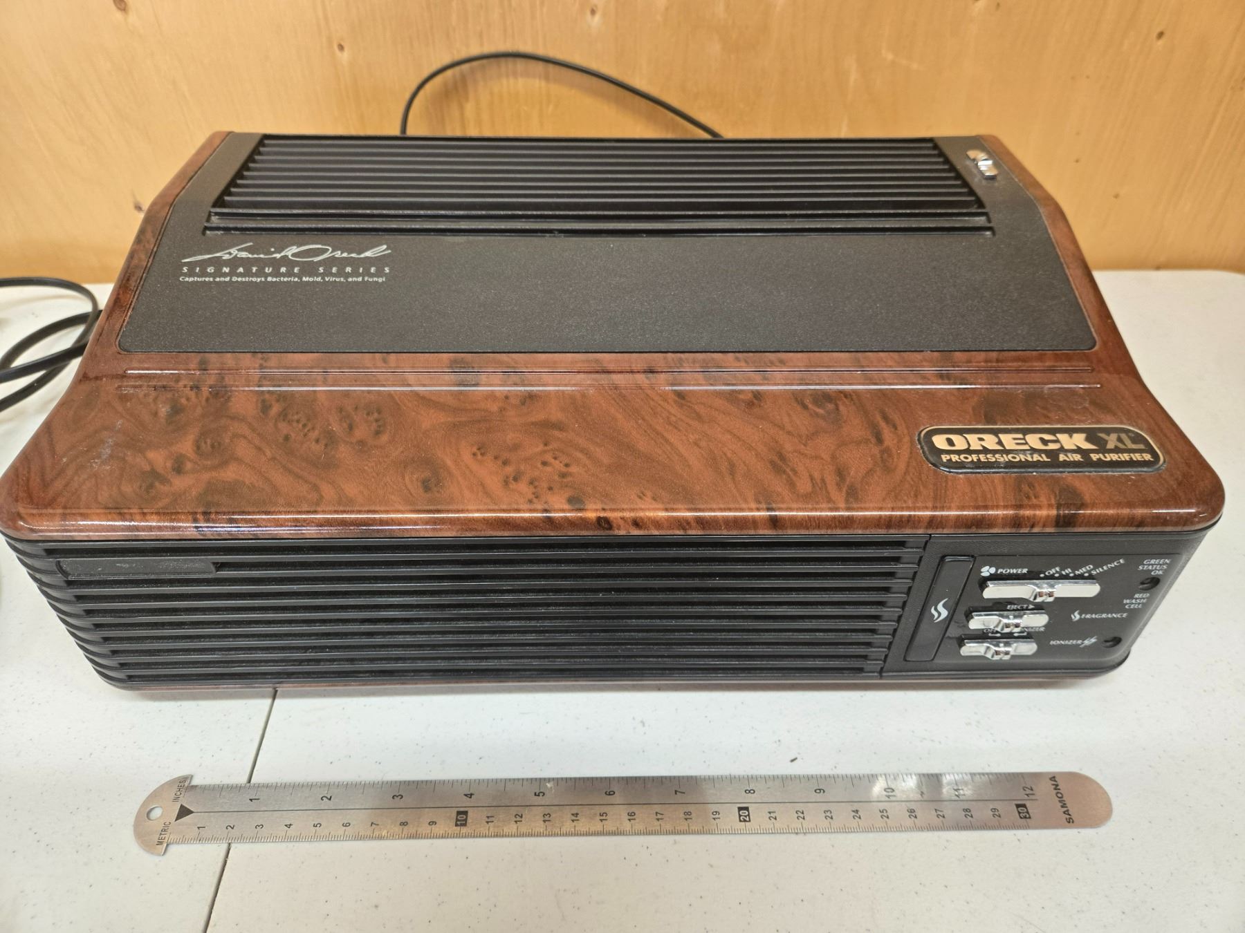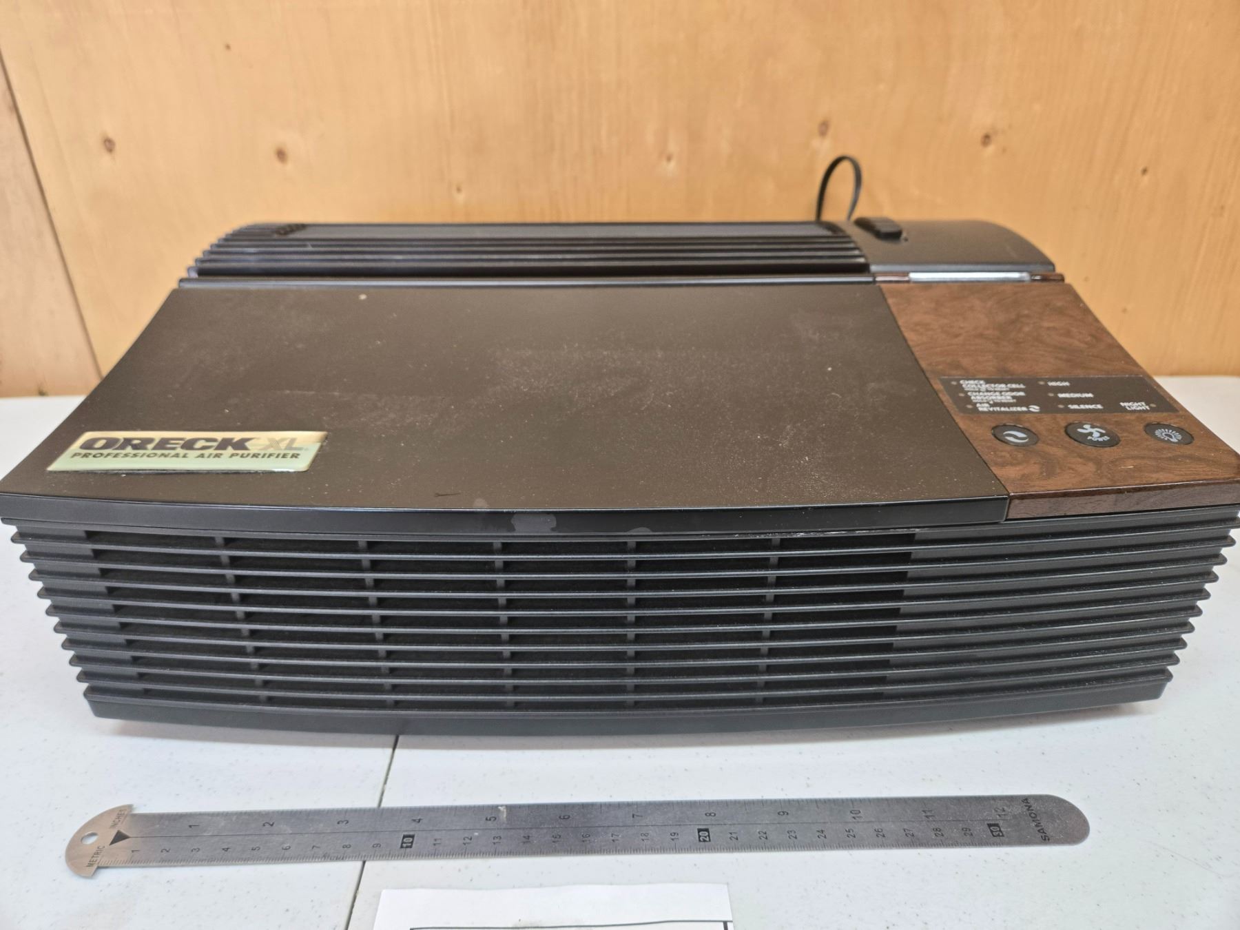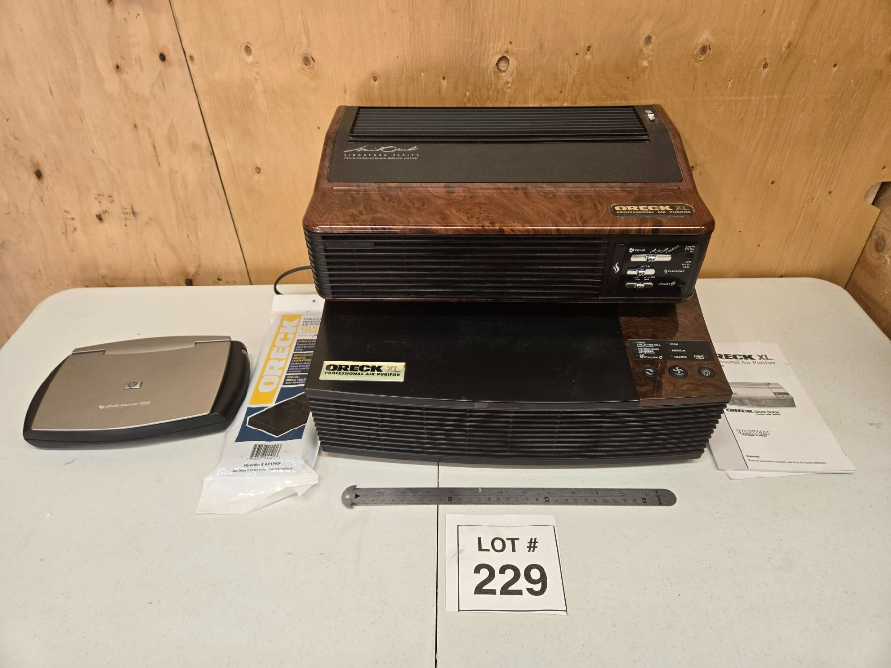 Lot includes two Oreck XL Professional air purifiers (models AIRPCB and AIR8SD) with manuals and accessories, and one HP ScanJet flatbed scanner (model C9900A). TESTED AND WORKING.