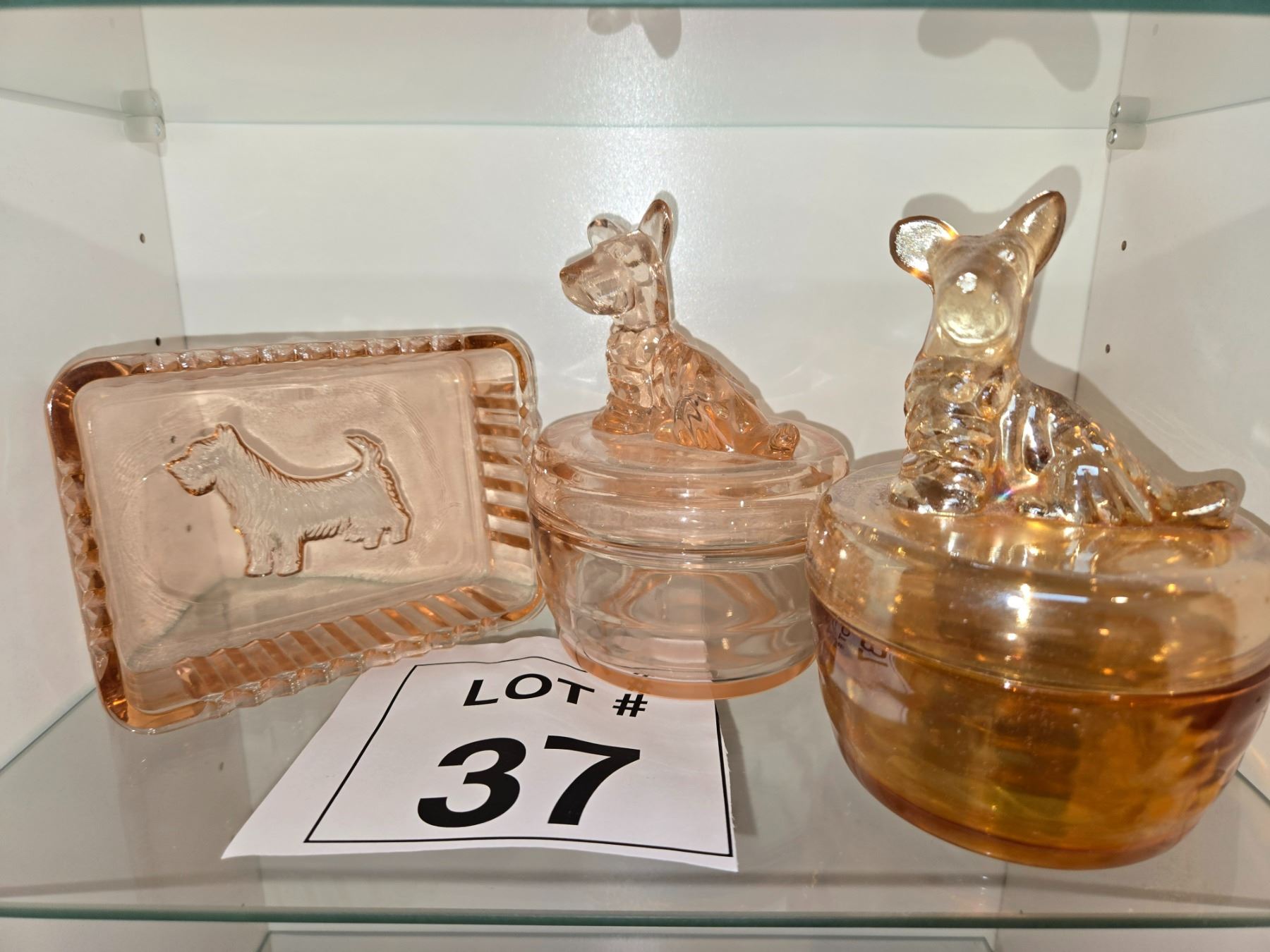 Three-piece lot of pink Depression glass including two lidded powder jars topped with seated dog finials and one rectangular dog-motif trinket dish. Pressed glass construction with molded details.