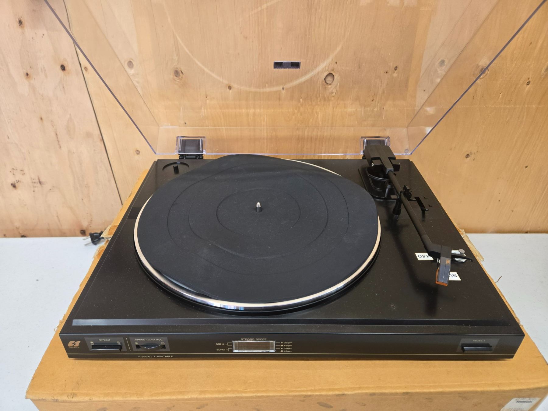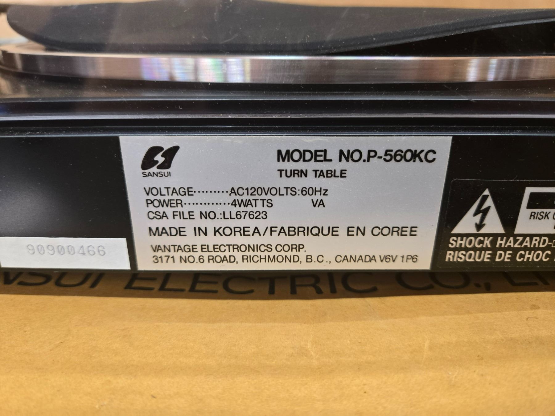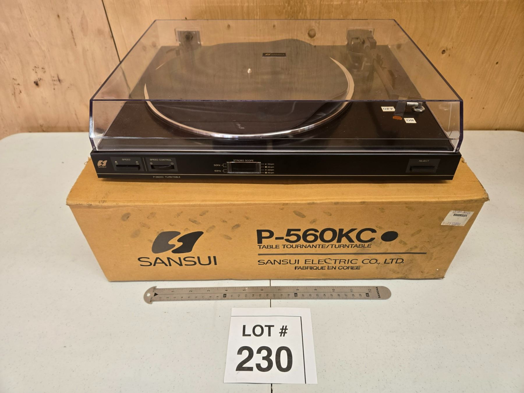 Sansui P-560KC direct-drive turntable with original dust cover and original Sansui box. Features electronic speed control, strobe scope with 33/45 RPM indication, pitch adjustment, and cueing lever. Made in Korea by Sansui Electric Co., Ltd. TESTED AND WORKING.