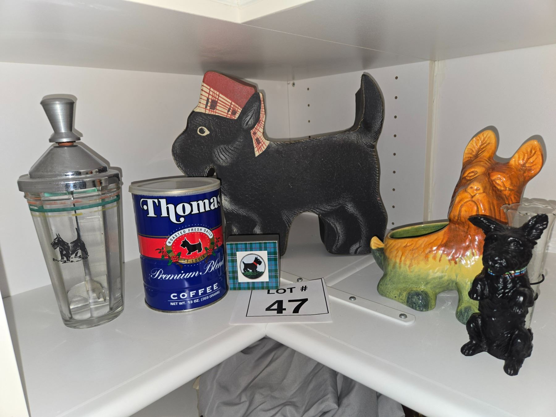 Assorted group of Scottie dog collectibles including a vintage Thomas coffee tin, ceramic and pottery planters, a glass container with Scottie motif, and novelty decorative items