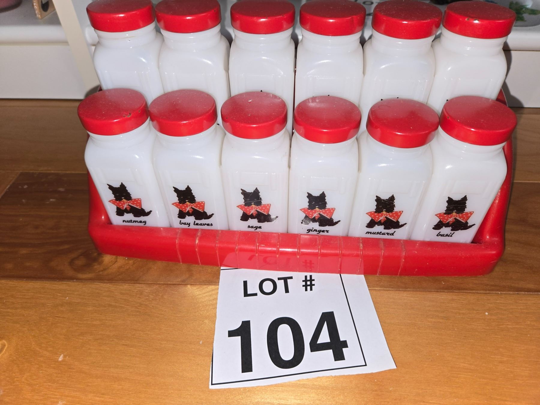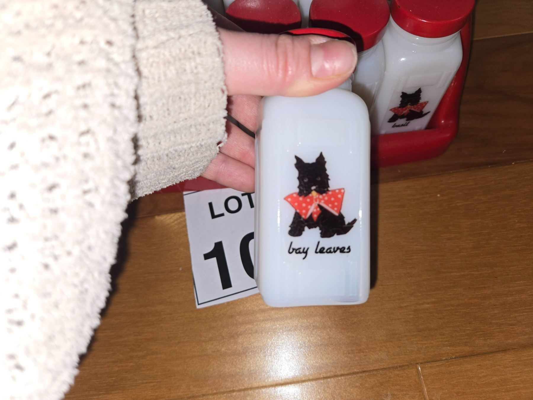 Complete set of 12 vintage spice jars with red lids and Scottie dog labels. Includes original red plastic counter rack.