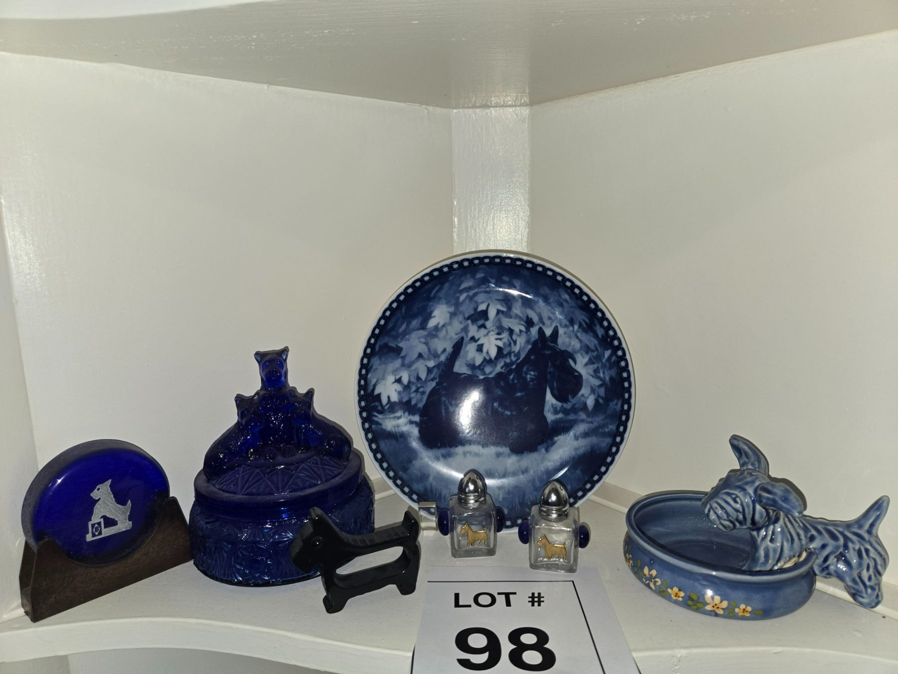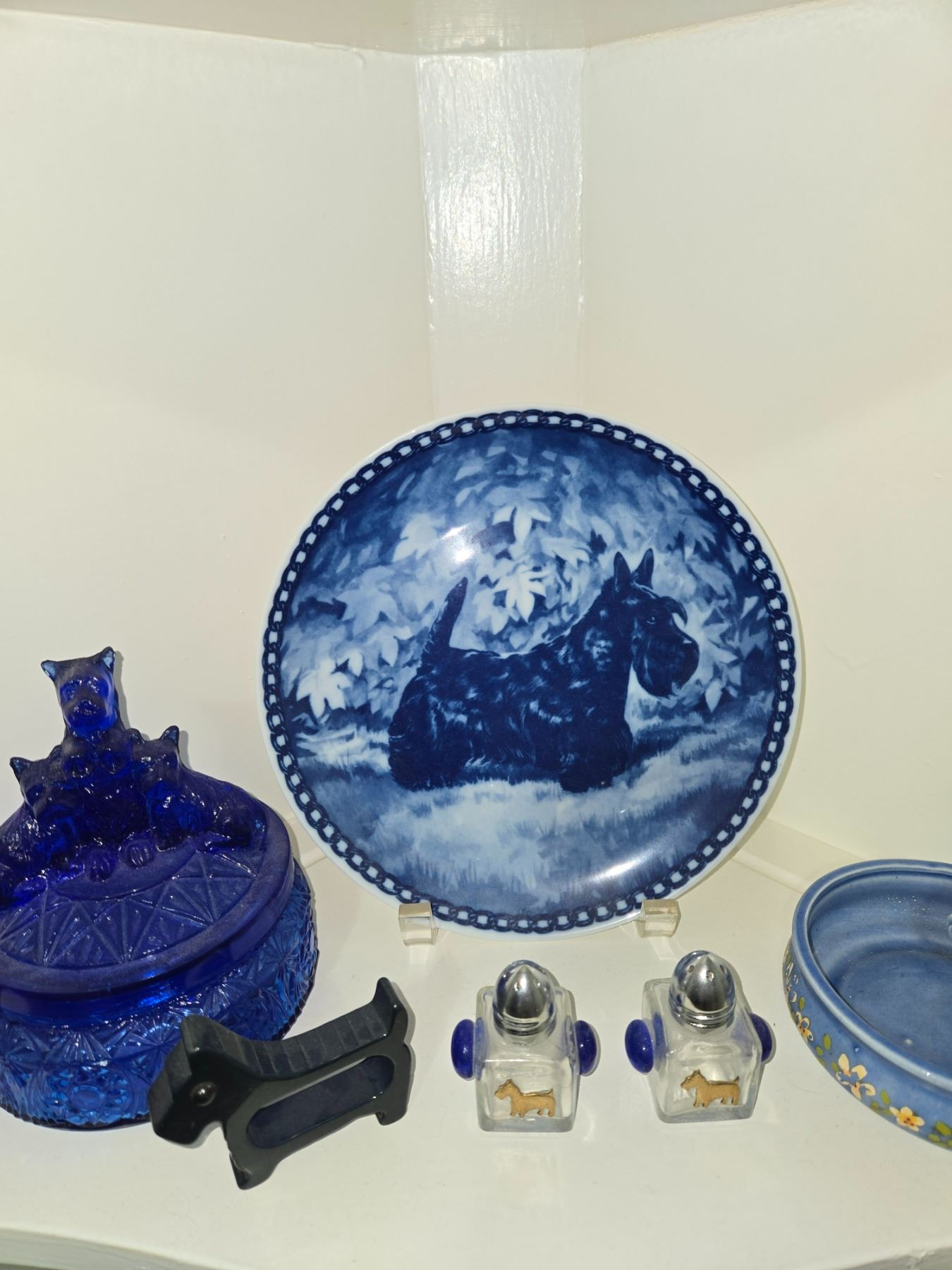 Group of Scottish Terrier–themed blue glass and ceramic items including covered dish, display plate, salt and pepper shakers, desk plaque, figurine, and trinket holder.