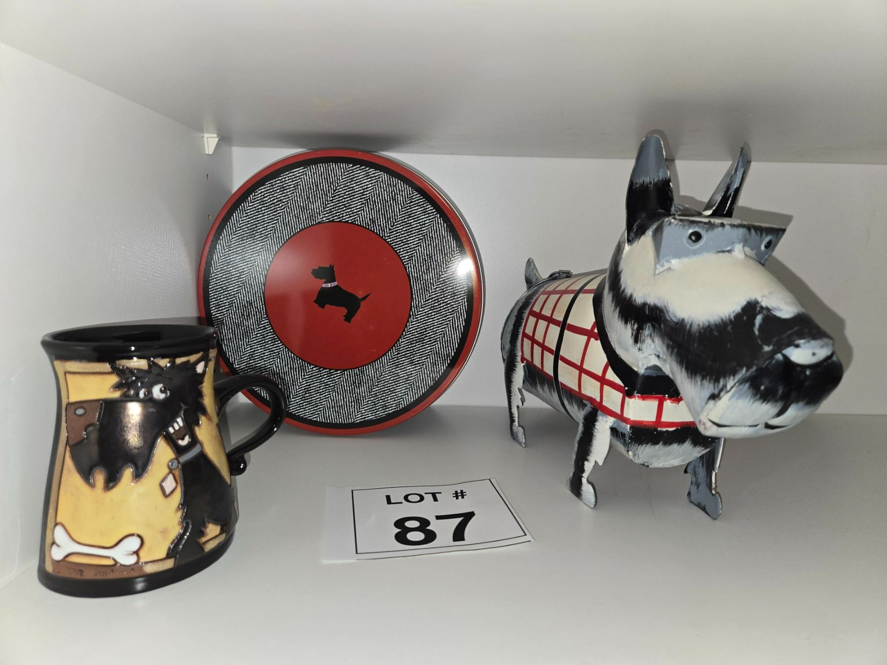 Group lot including a painted Scottish Terrier figurine, decorative plate with Scottie motif, and novelty mug.