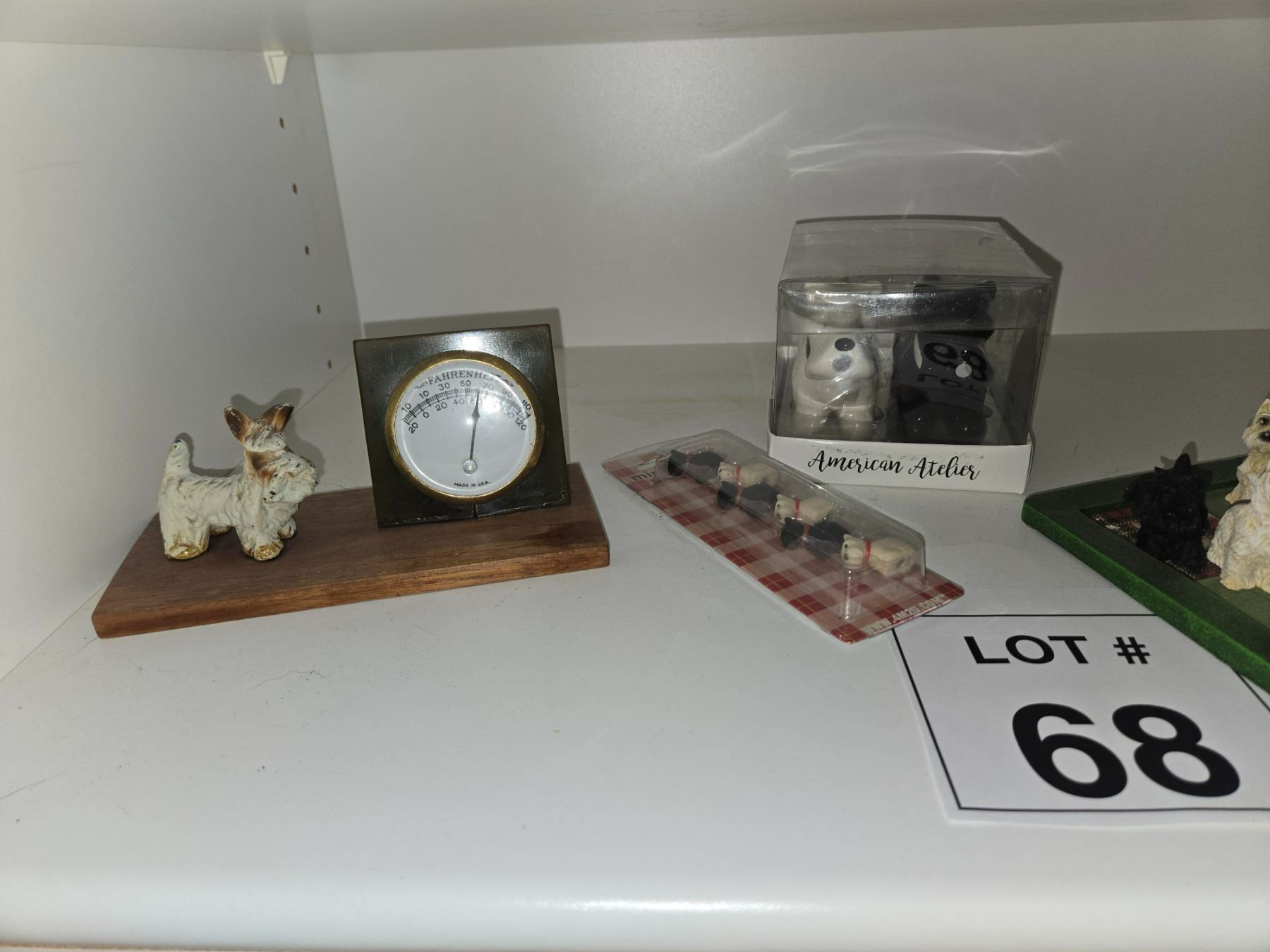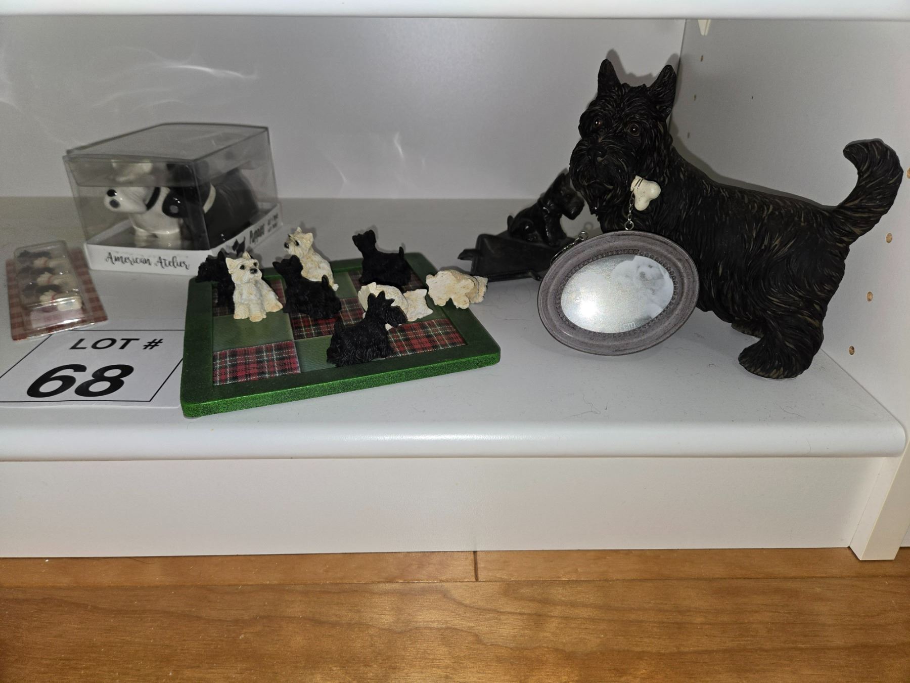 Scottish Terrier themed display lot featuring grouped figurines on tartan base, framed novelty photo piece, boxed miniatures, and a larger Scottie dog figure with hanging frame medallion.