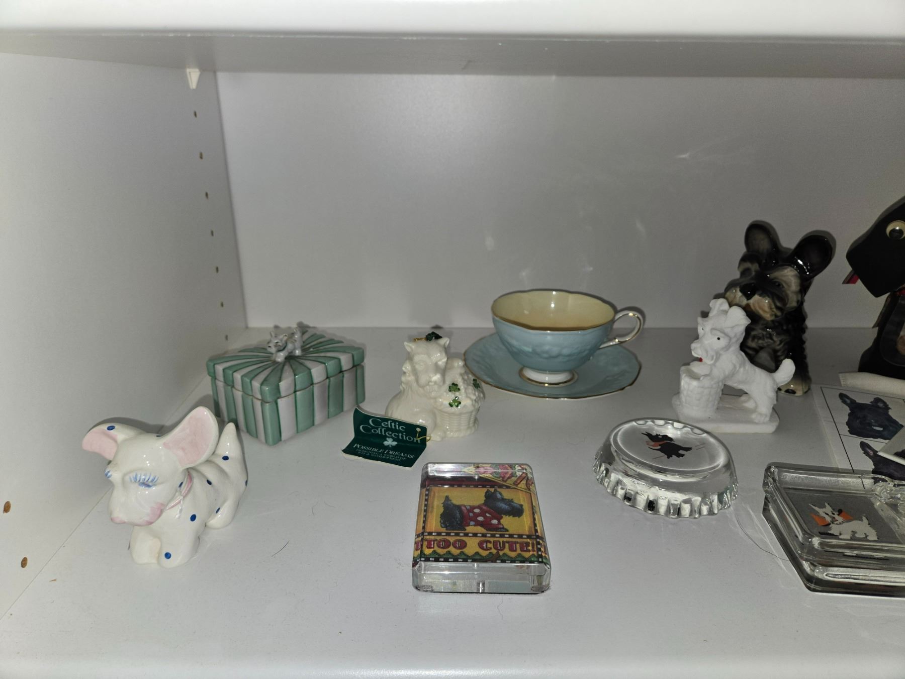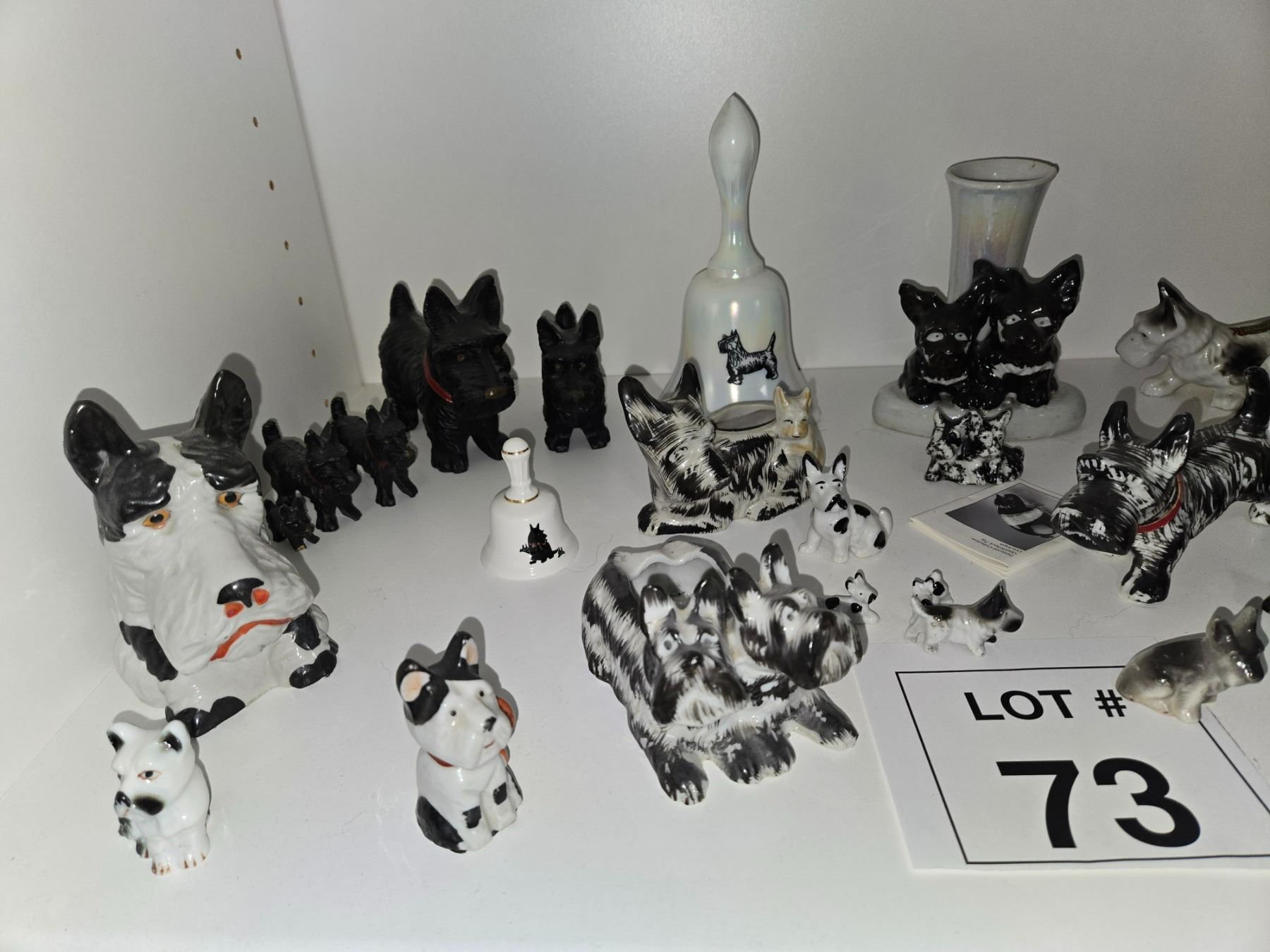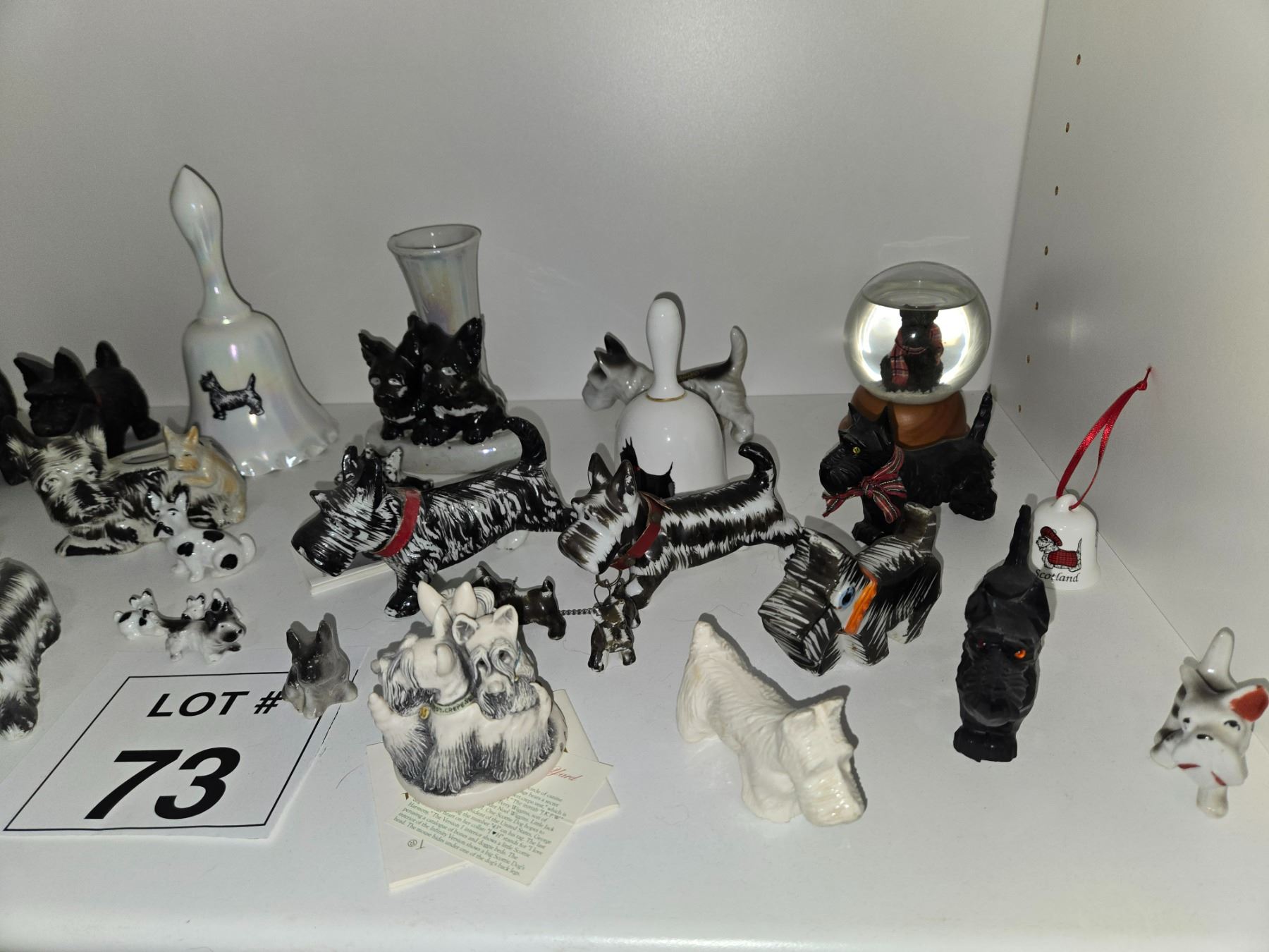Large mixed group of Scottish Terrier–themed collectibles including ceramic figurines, resin miniatures, glass pieces, novelty items, and small décor objects.