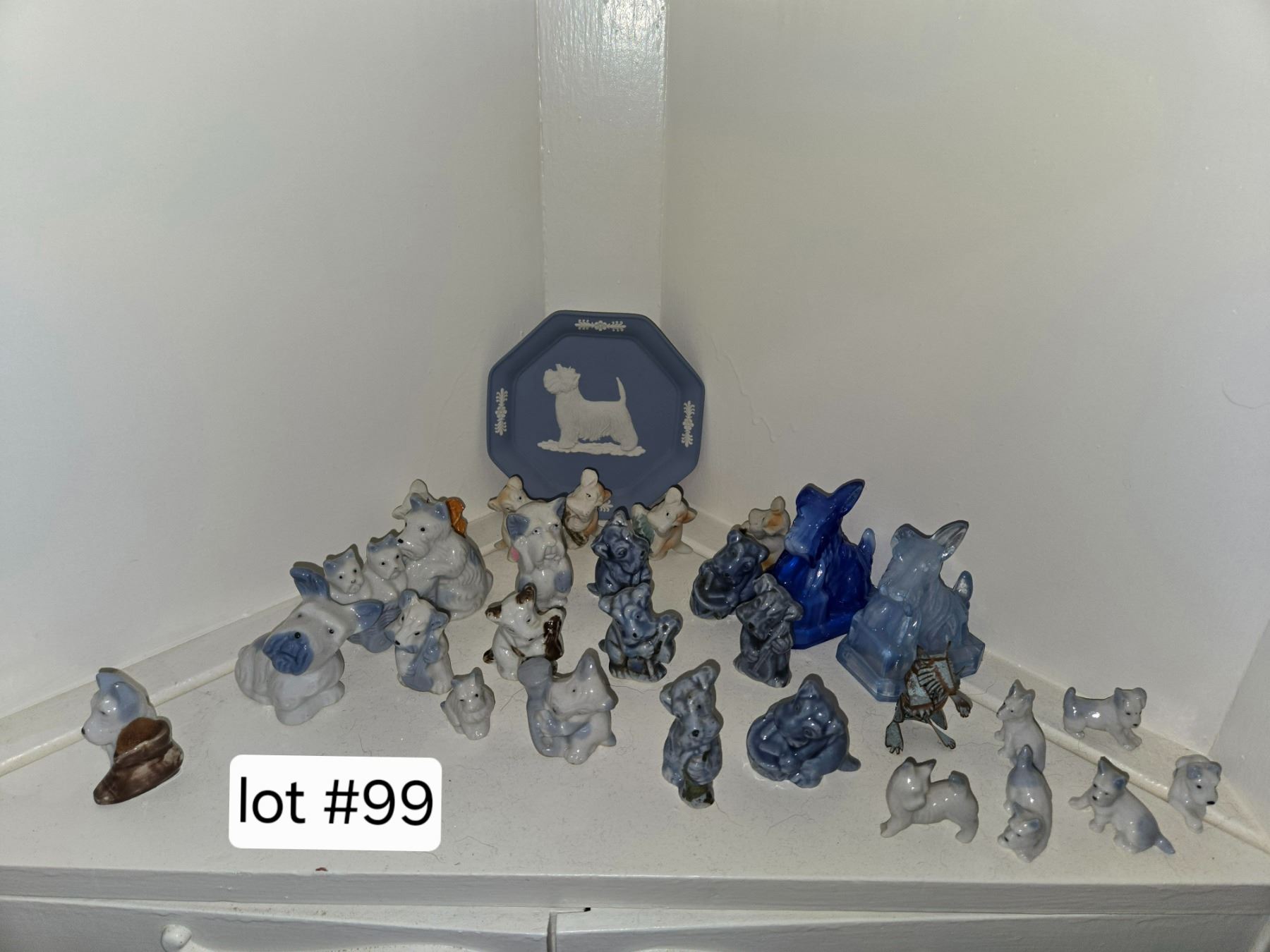 Large group of miniature Scottish Terrier ceramic figurines in blue, white, and gray glazes, including seated, standing, and novelty forms. Includes a blue Wedgwood-style jasperware plaque with white Scottie relief. Mixed sizes and makers.