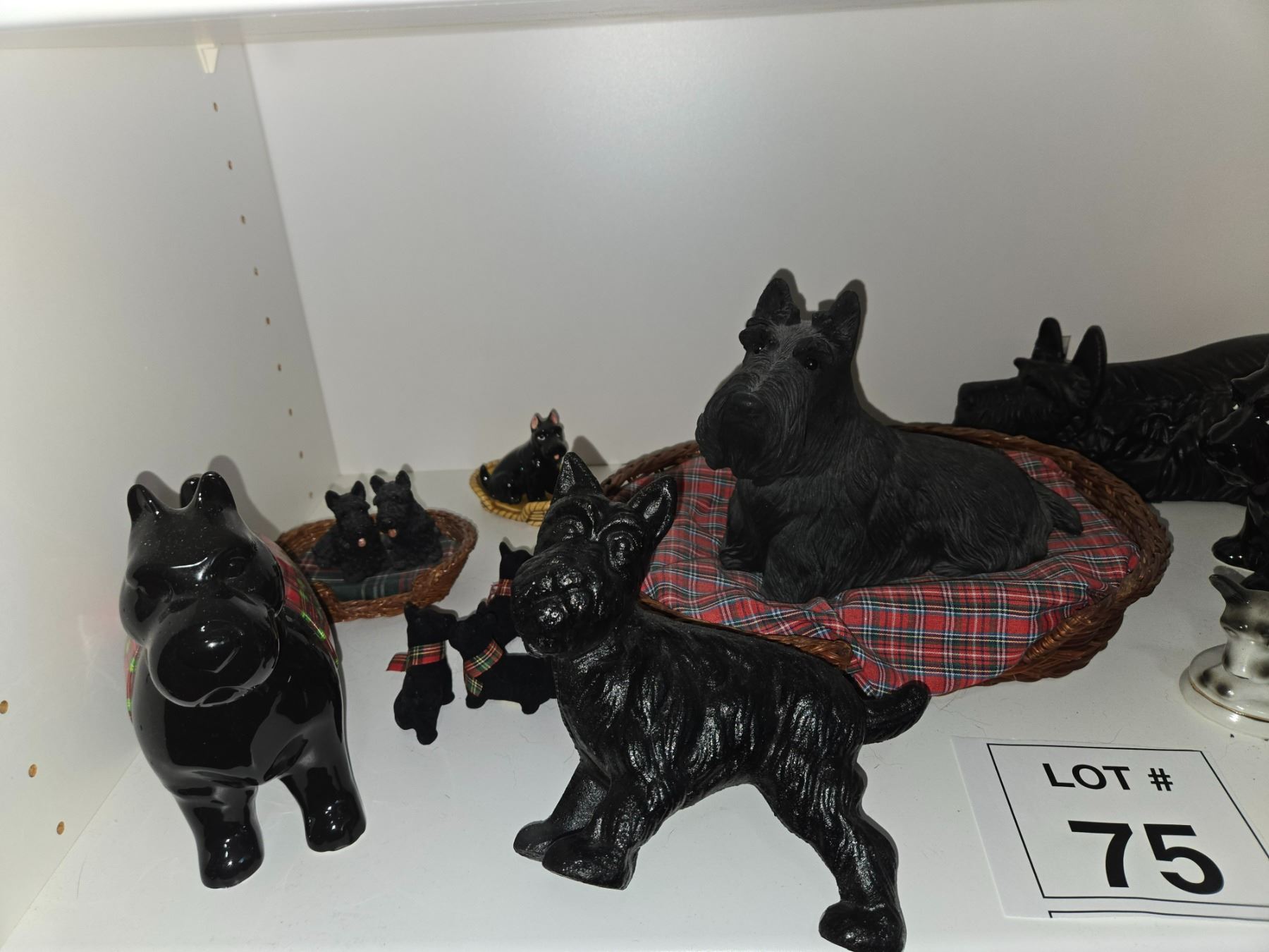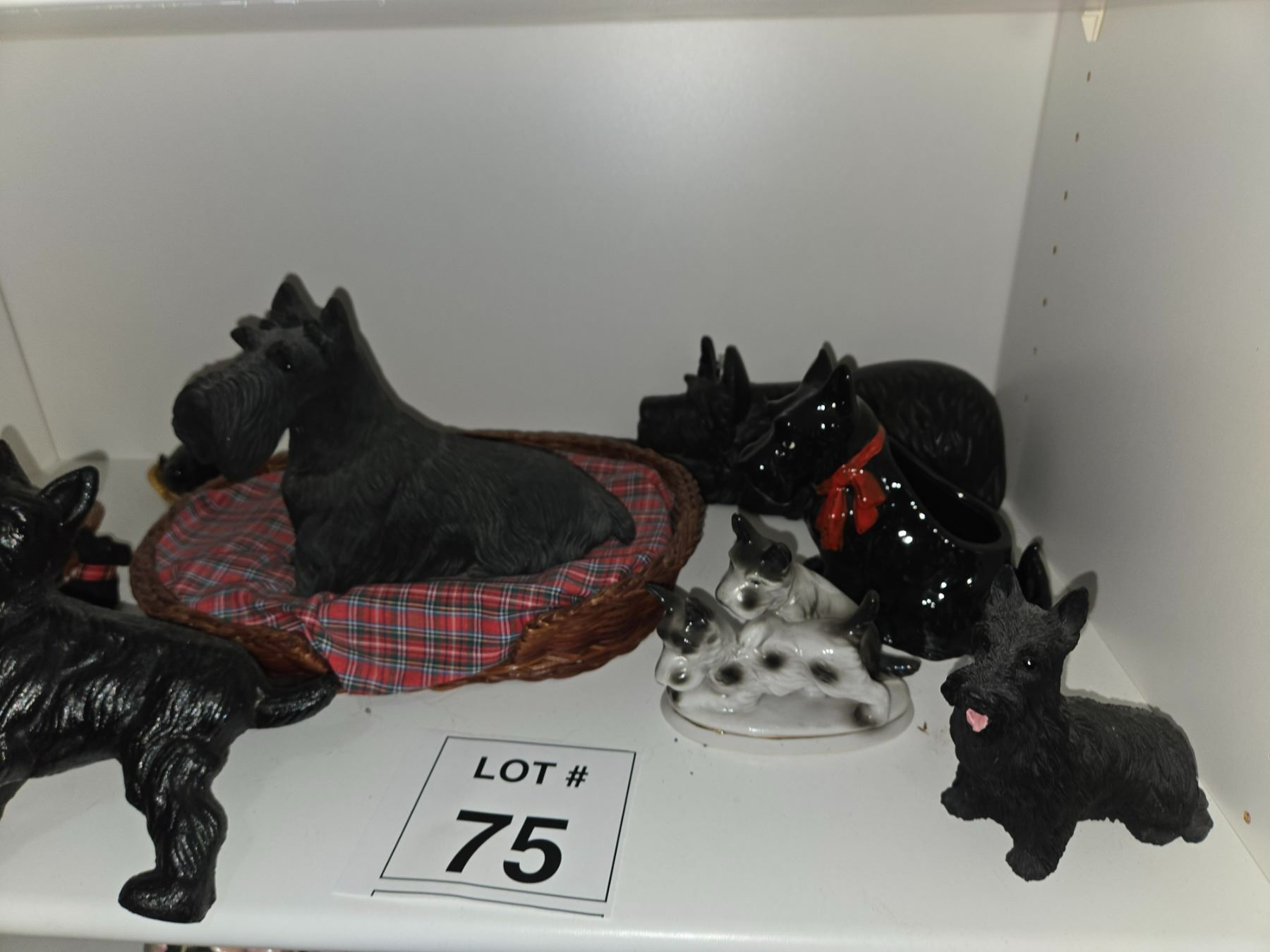 Mixed lot of Scottish Terrier–themed novelty items including ceramic figurines, glass ashtrays, trinket boxes, decorative pieces, and small collectibles.