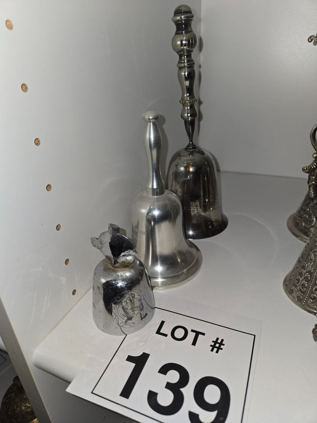 Group of metal hand bells with turned handles in silver-tone and darker finishes.
