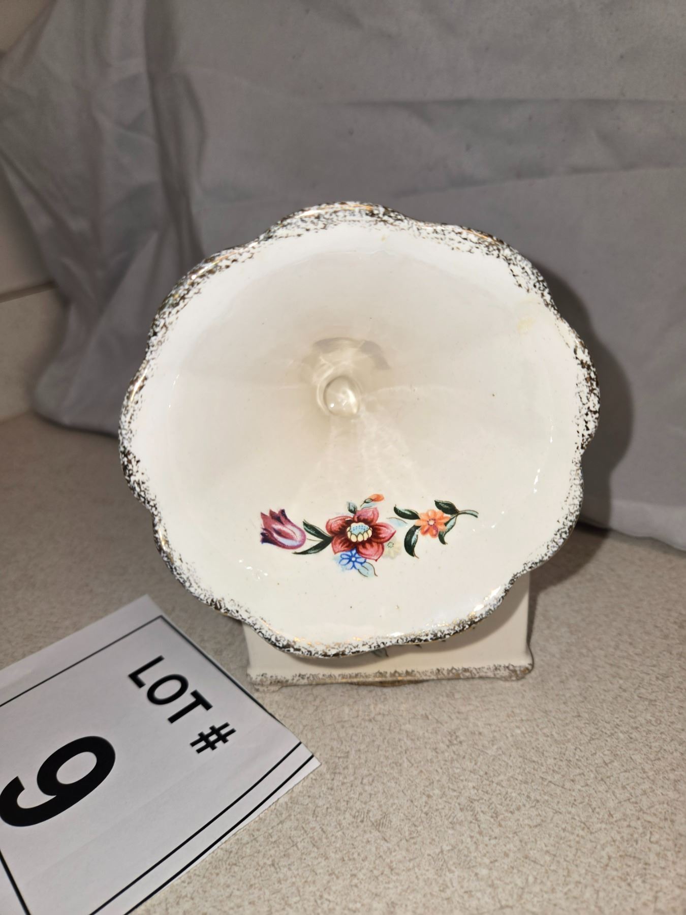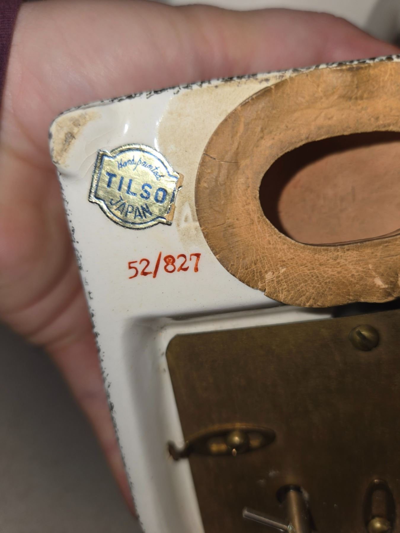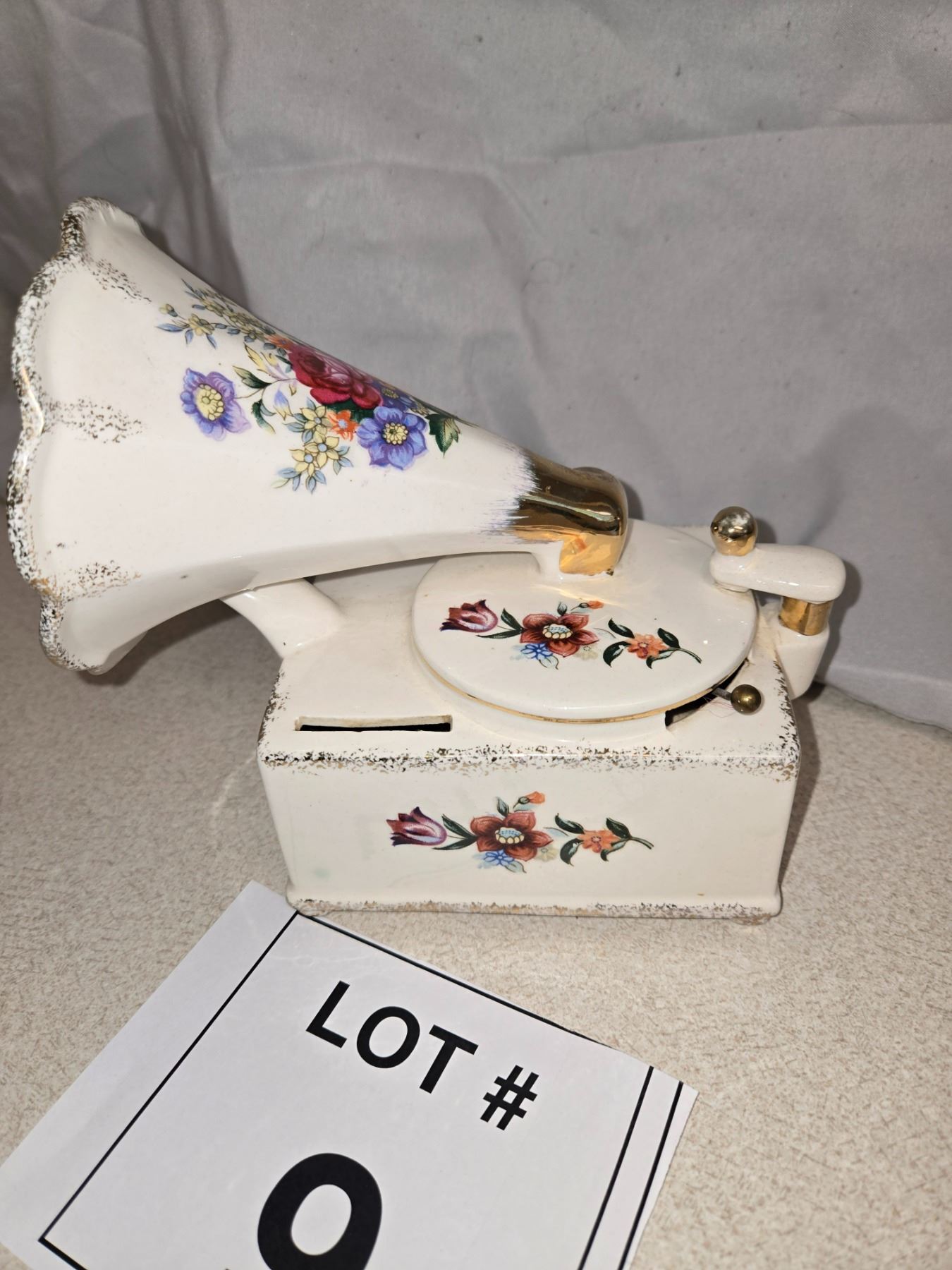 Porcelain gramophone-form music box (TILSO JAPAN), hand-decorated floral design with gilt accents. Labeled limited edition 52/827. Mechanical music movement. Age-related wear, light crazing, and finish wear consistent with vintage decorative ceramics. Attractive display piece. Sold as one item.