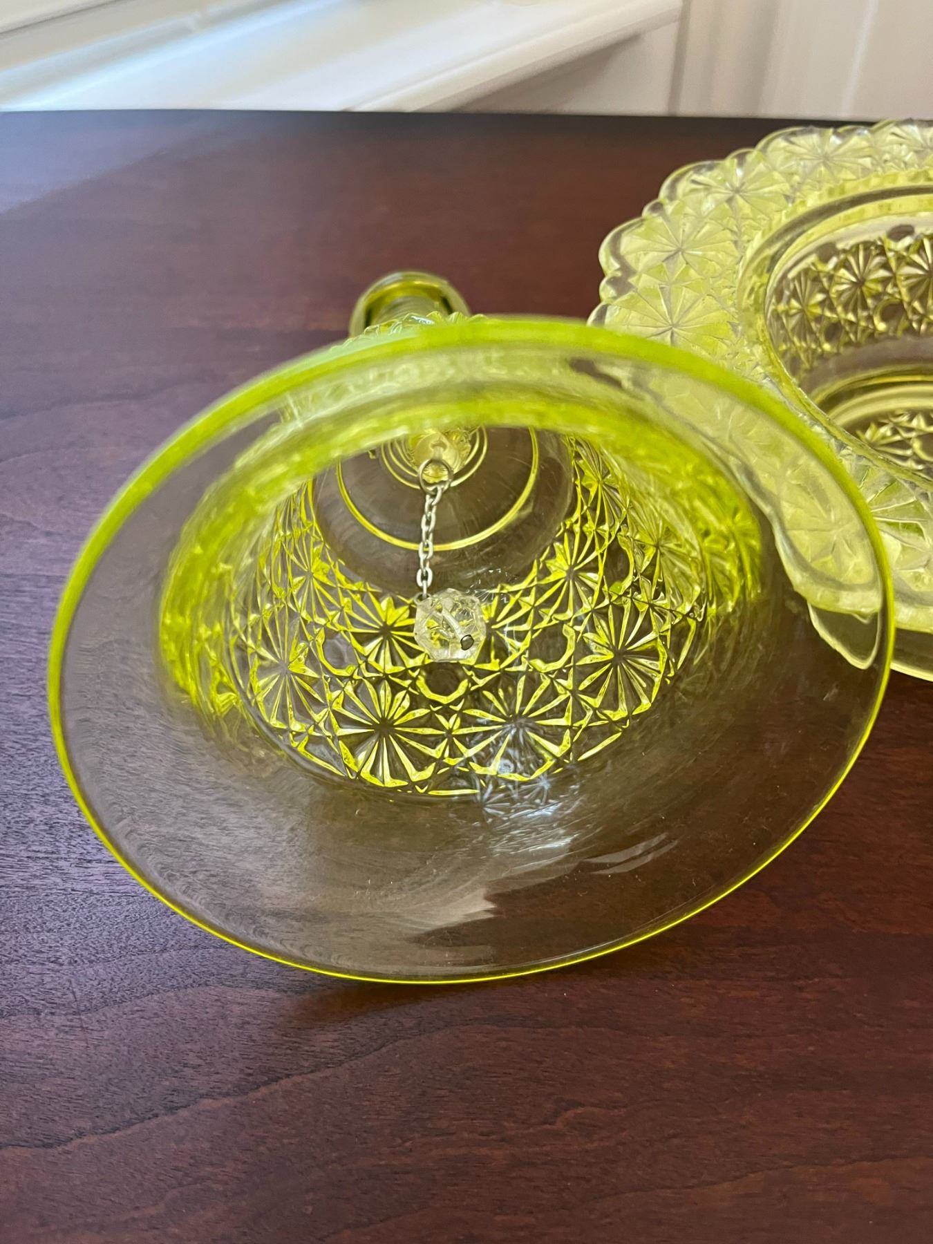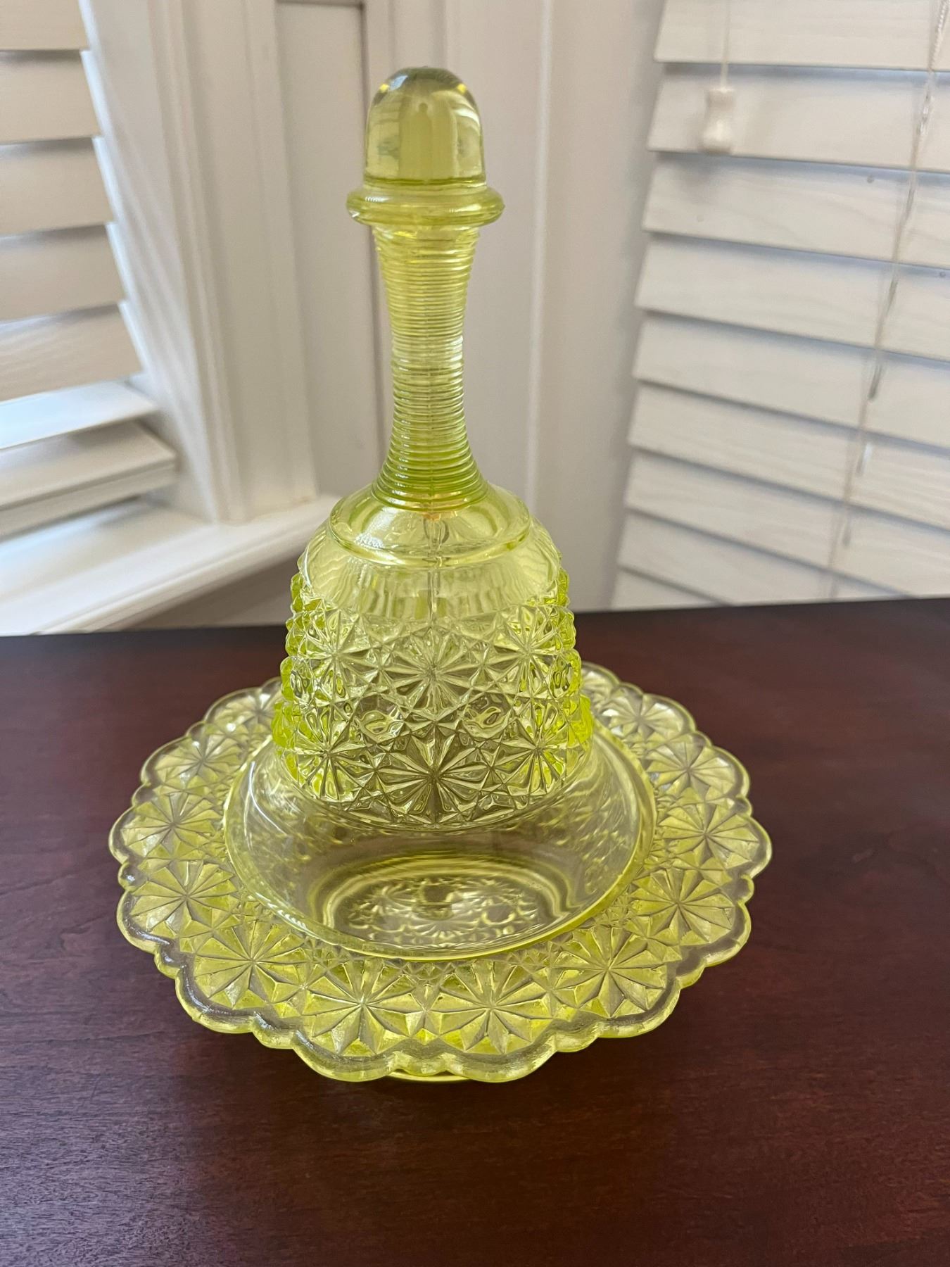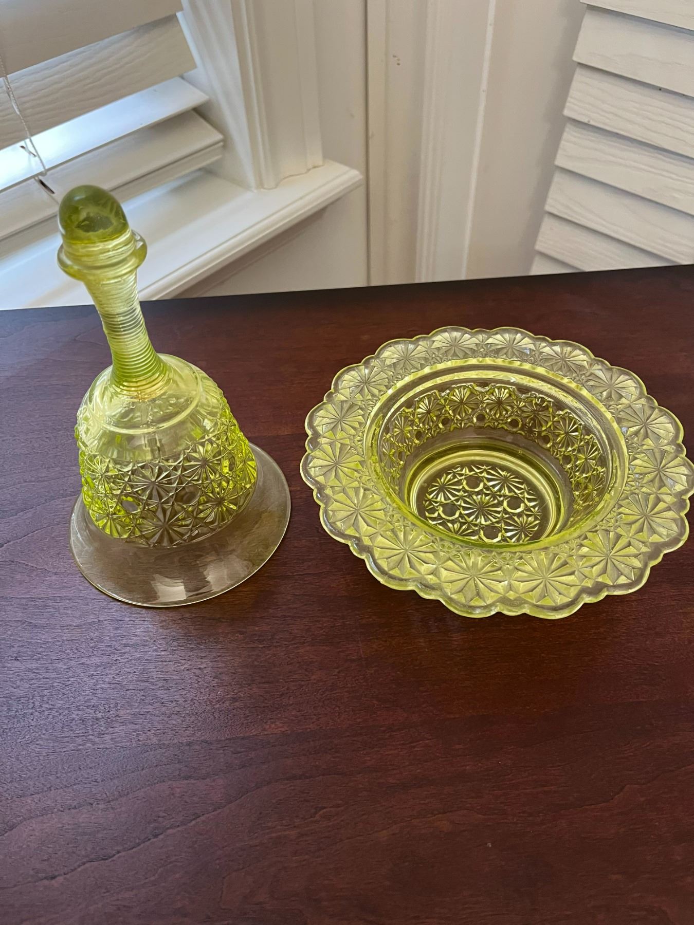 Vintage uranium glass grouping consisting of a pressed glass bell and a matching pressed glass bowl or dish. Both pieces exhibit the characteristic yellow-green coloration associated with uranium glass and will fluoresce bright green under ultraviolet (black) light.