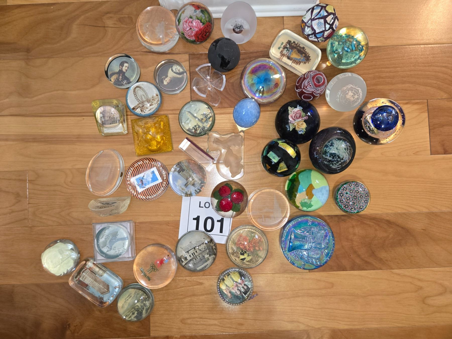 Collection of glass paperweights and desk objects in clear, art glass, millefiori-style, photographic souvenir, and novelty forms.