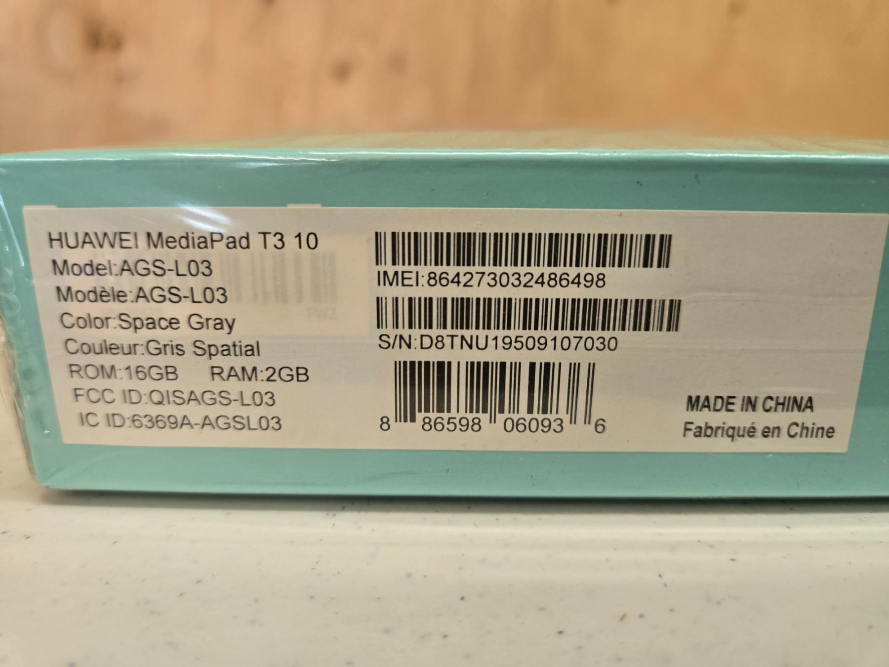 • Huawei MediaPad T3 10 tablet, model AGS-L03 (16GB ROM, 2GB RAM), sealed in box