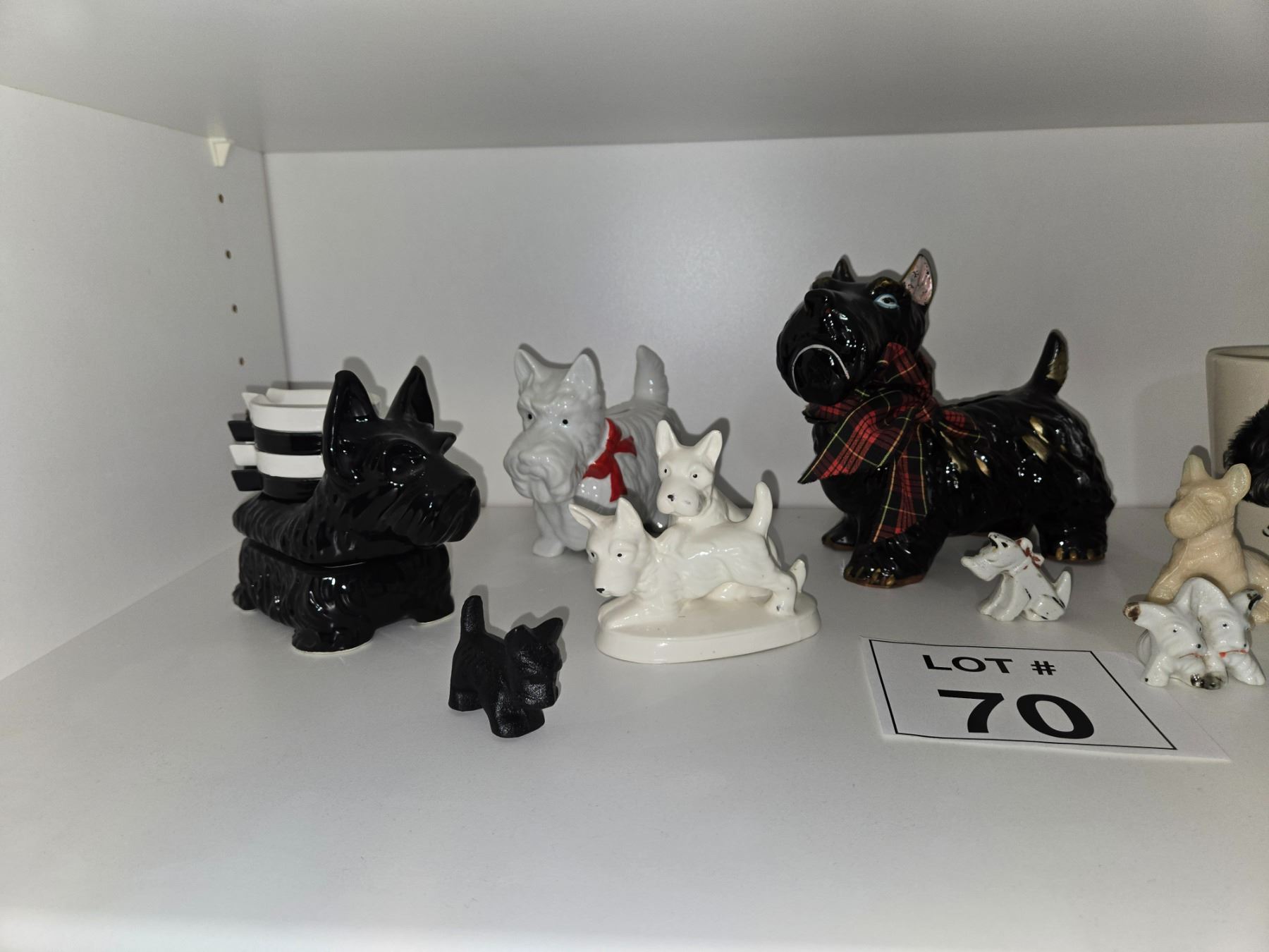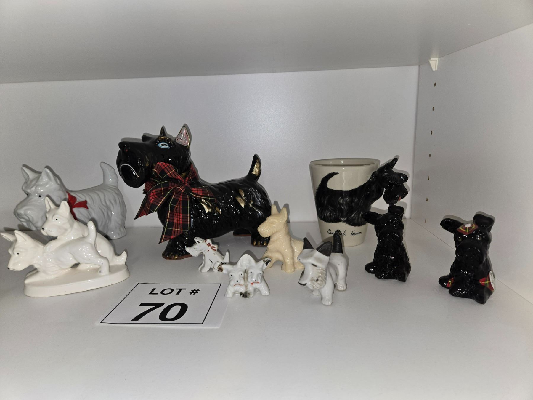 Collection of glossy black ceramic Scottish Terrier figurines in various poses and sizes. Likely mid-20th century decorative ceramics.