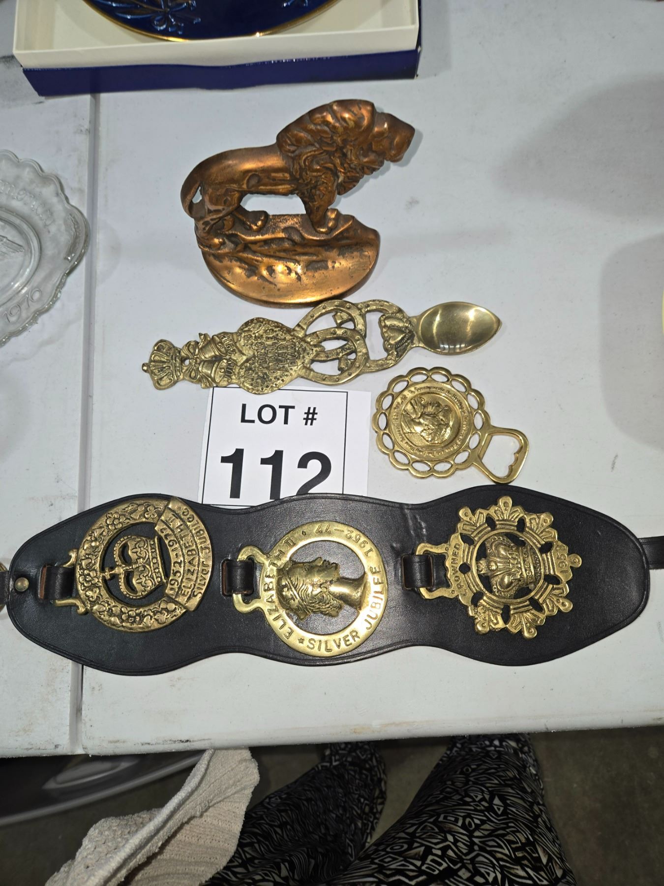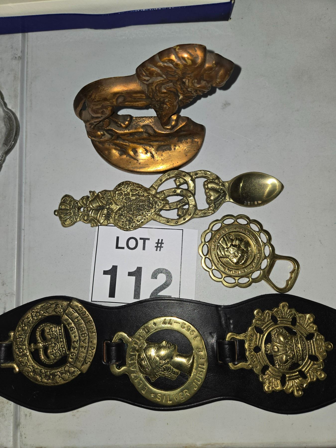 Group of vintage brass and metal items including a Queen Elizabeth II Silver Jubilee (1977) belt plaque, decorative brass spoon, bottle opener, and figural ornament.