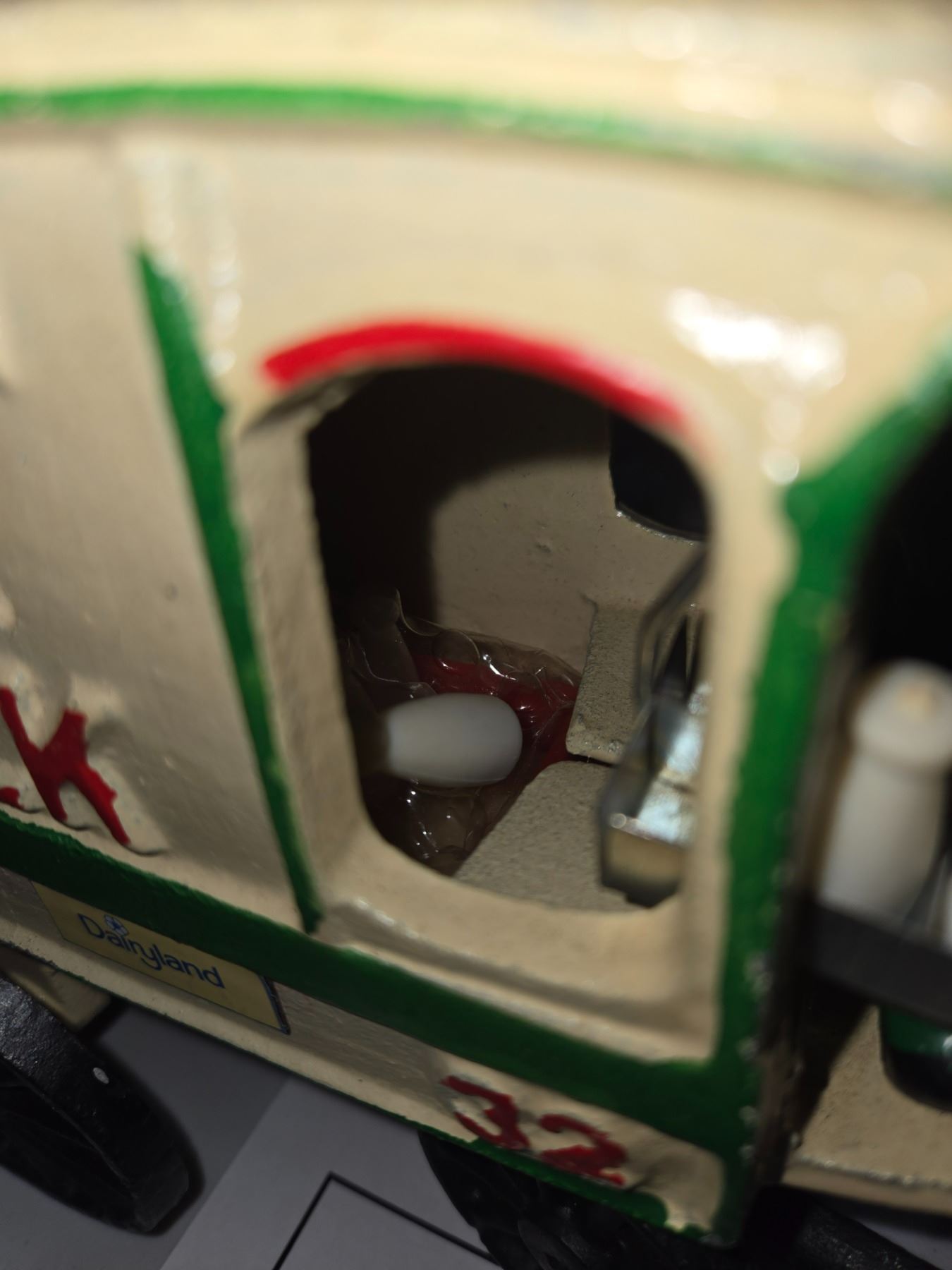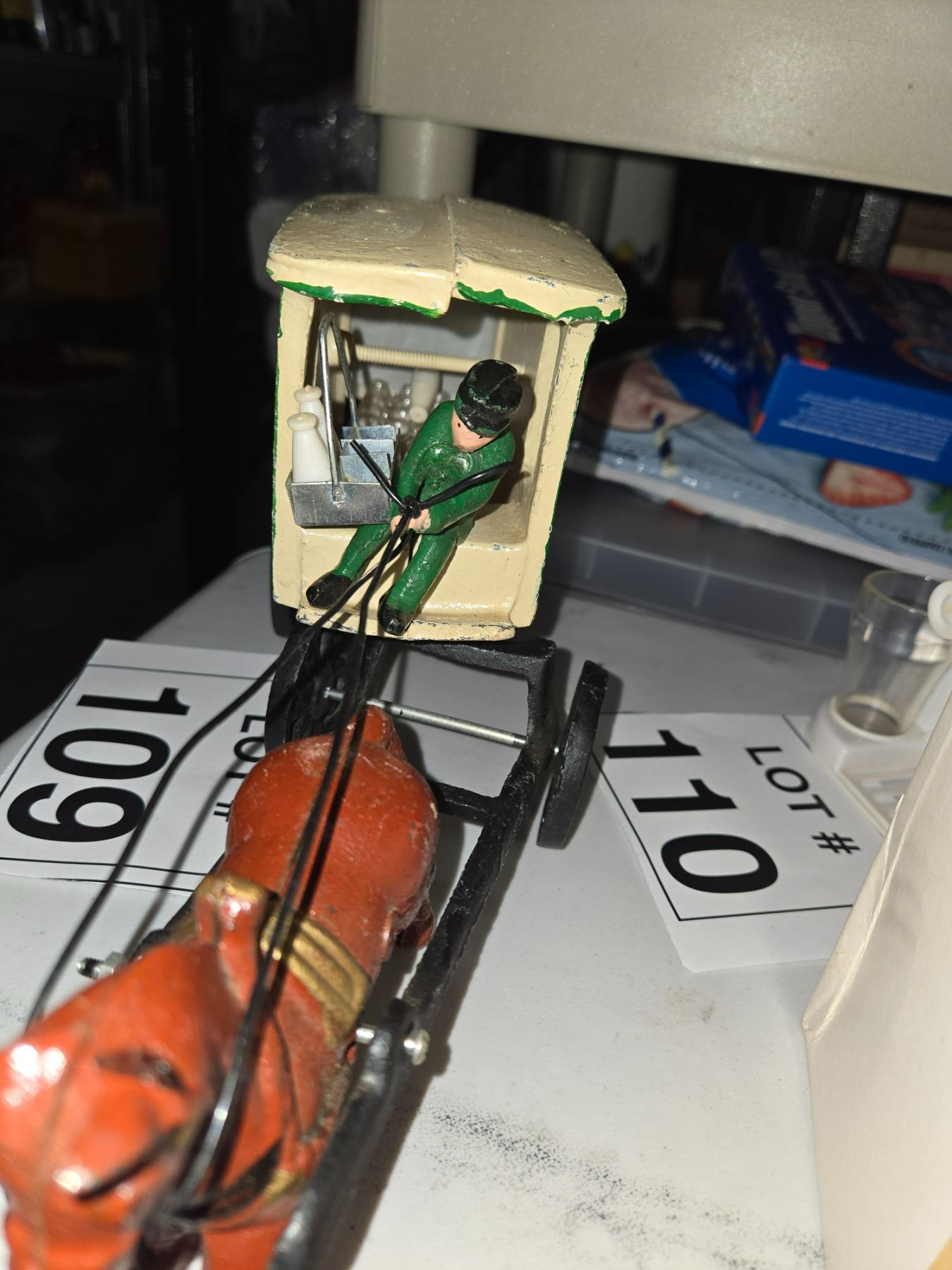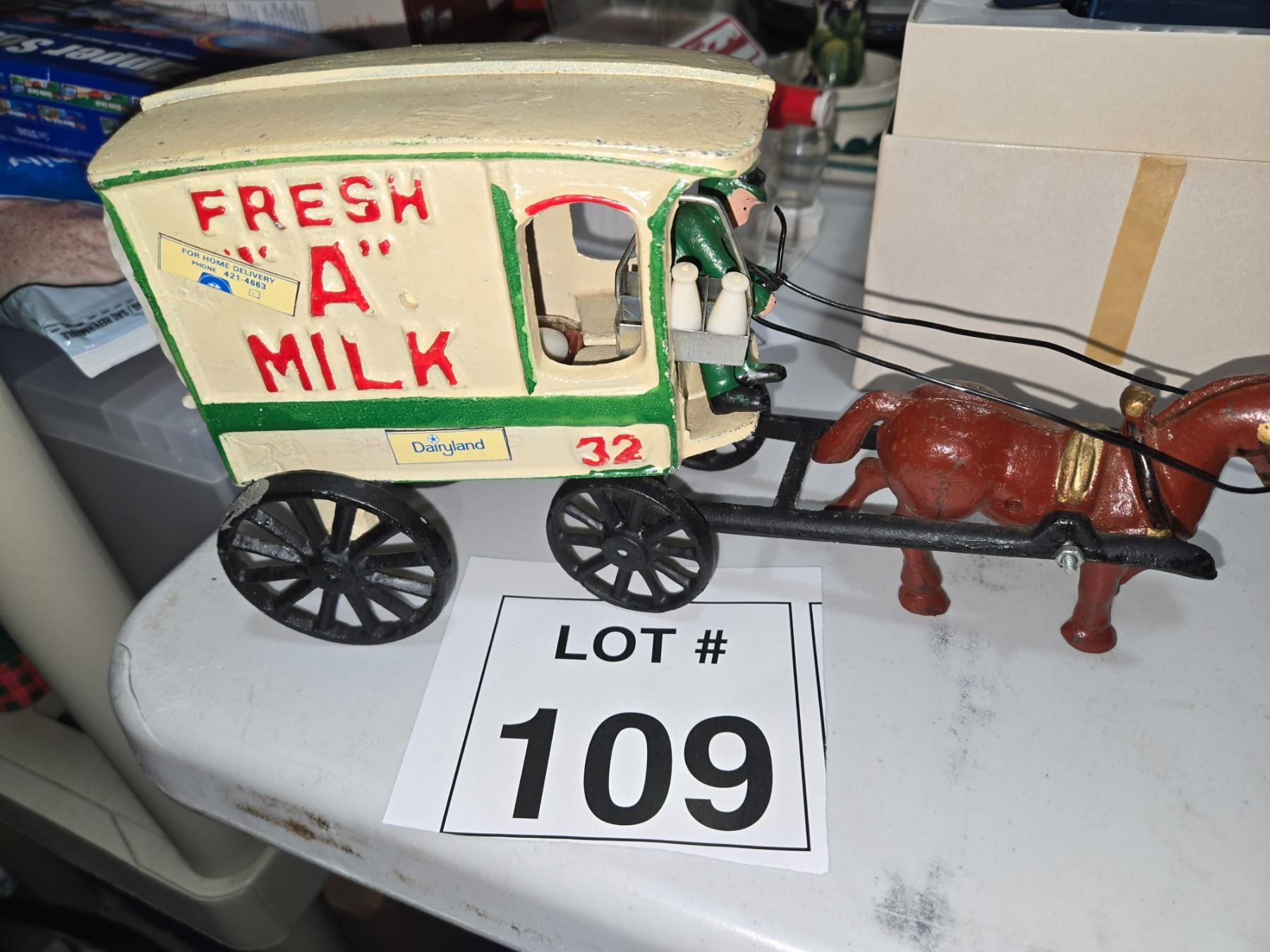Antique cast iron model of a Dairyland “Fresh A Milk” horse-drawn delivery wagon. Includes a driver figure, a horse, and milk bottles.