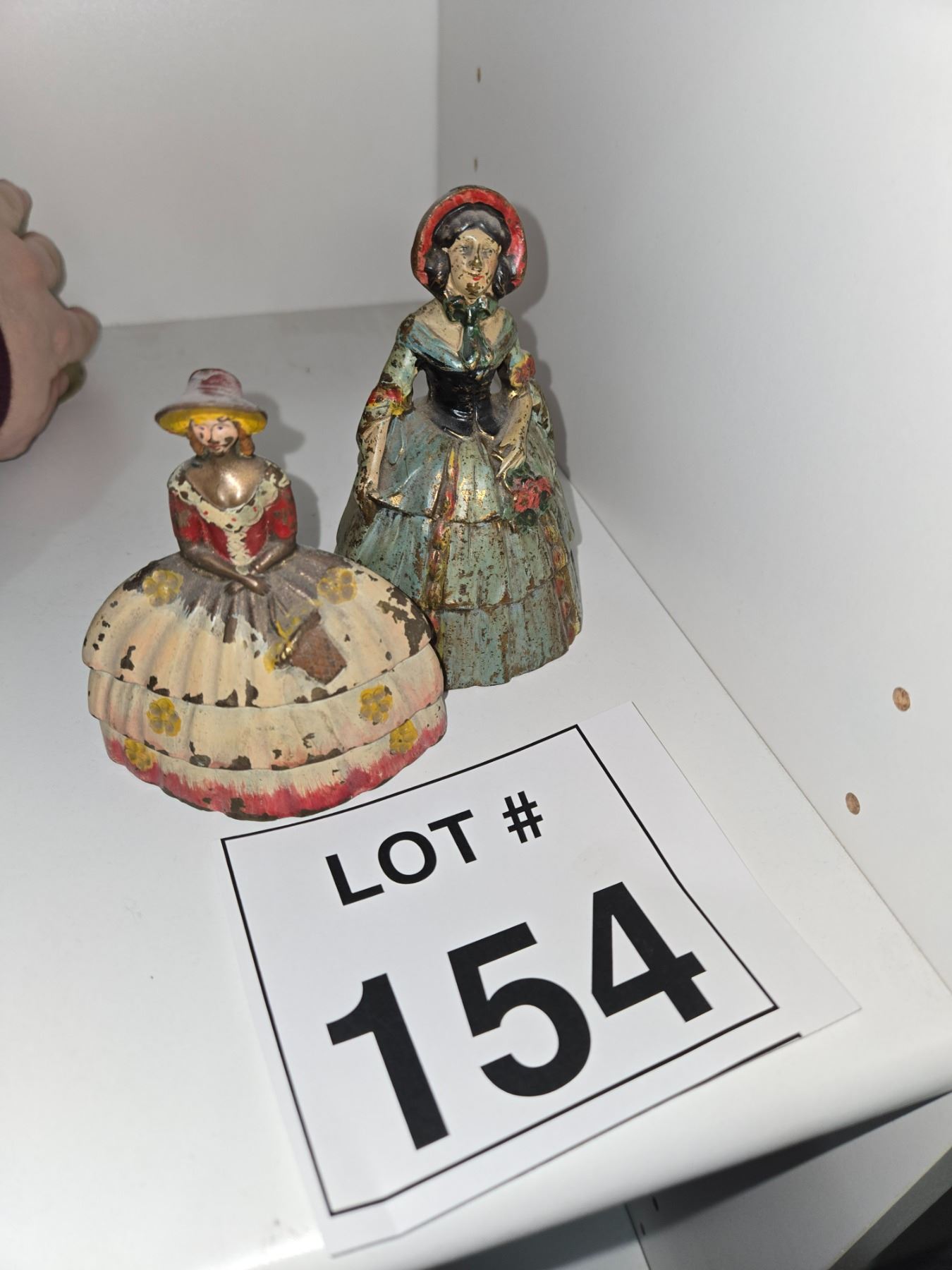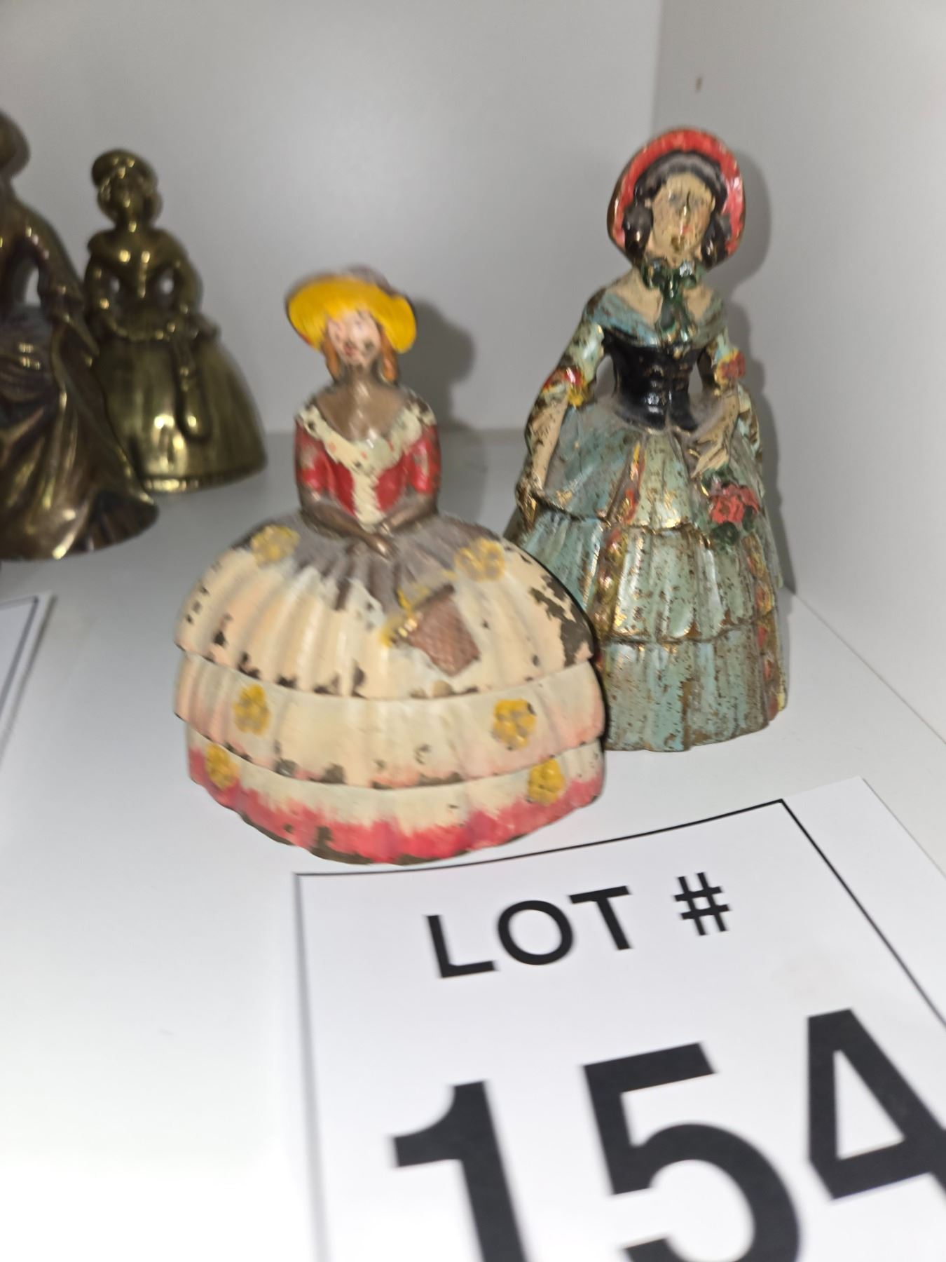 Two hand-painted figural bells depicting women in period clothing. Noticeable surface wear, paint loss, and age-related distressing visible.